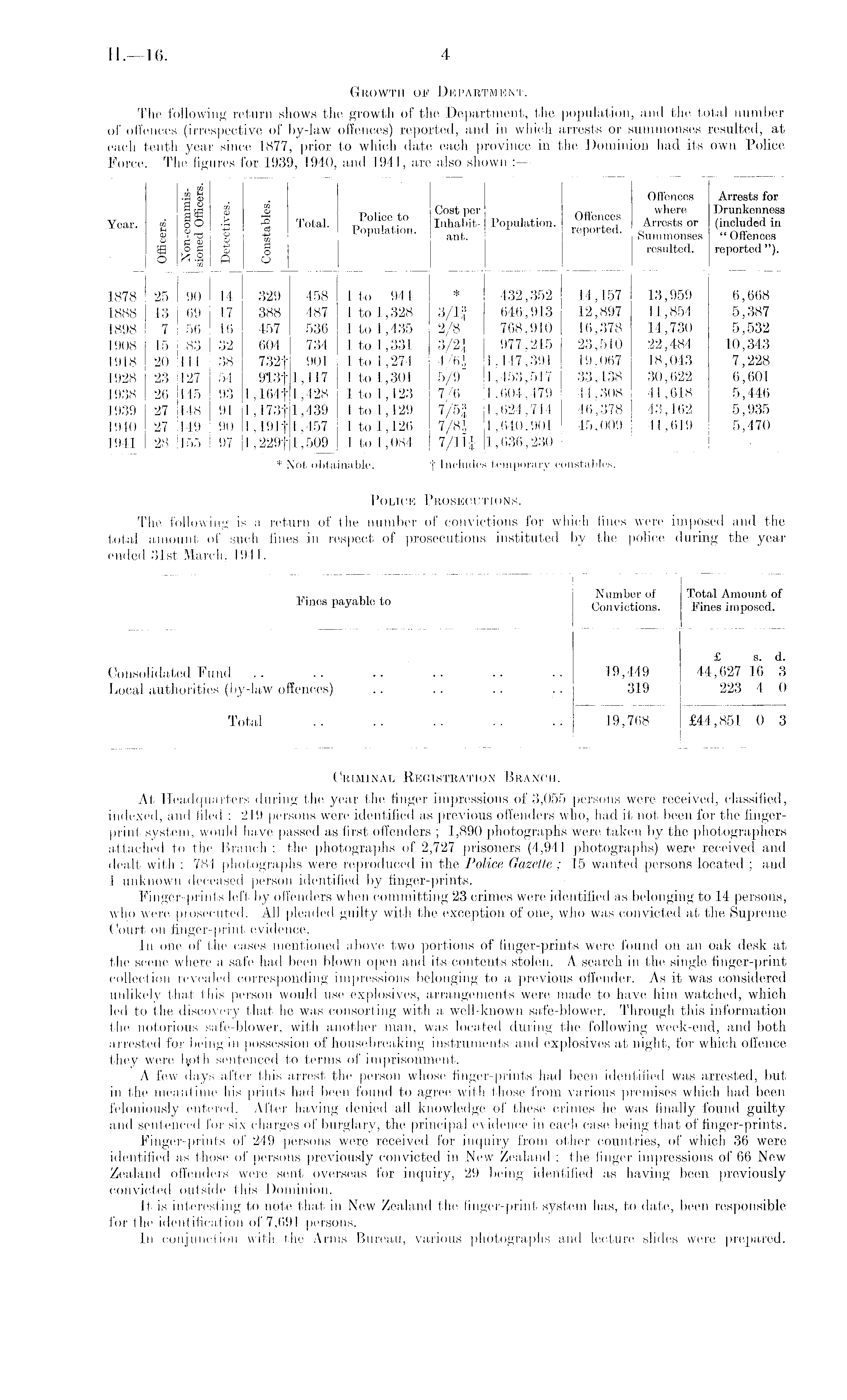 Criminal Registration Branch. At Headquarters during the year the finger impressions of 3,055 persons were received, classified, indexed, and filed ; 2.19 persons were identified as previous offenders who, had it not been for the fingerprint system, would have passed as first offenders ; 1,890 photographs were taken by the photographers attached to the Branch ; the photographs of 2,727 prisoners (4,941 photographs) were received and dealt with ; 784 photographs were reproduced in the Police Gazette; 15 wanted persons located ; and 1 unknown deceased person identified by finger-prints. Finger-prints left by offenders when committing 23 crimes were identified as belonging to 14 persons, who were prosecuted. All pleaded guilty with the exception of one, who was convicted at the Supreme Court on finger-print evidence. In one of the cases mentioned above two portions of finger-prints were found on an oak desk at the scene where a safe had been blown open and its contents stolon. A search in the single finger-print collection revealed corresponding impressions belonging to a previous offender. As it was considered unlikely that this person would use explosives, arrangements were made to have him watched, which led to the discovery that he was consorting with a well-known safe-blower. Through this information the notorious safe-blower, with another man, was located during the following week-end, and both arrested for being in possession of housebreaking instruments and explosives at night, for which offence they were lyrth sentenced to terms of imprisonment. A few days after this arrest the person whose finger-prints had been identified was arrested, but in the meantime his prints had been found to agree with those from various premises which had been feloniously entered. After having denied all knowledge of these crimes he was finally found guilty and sentenced for six charges of burglary, the principal evidence in each case being that of finger-prints. Finger-prints of 249 persons were received for inquiry from other countries, of which 36 were identified as those of persons previously convicted in New Zealand ; the finger impressions of 66 New Zealand offenders were sent overseas for inquiry, 29 being identified as having been previously convicted outside this Dominion. It is interesting to note that in New Zealand the finger-print system has, to date, been responsible for the identification of 7,691 persons. In conjunction with the Arms Bureau, various photographs and lecture slides were prepared.