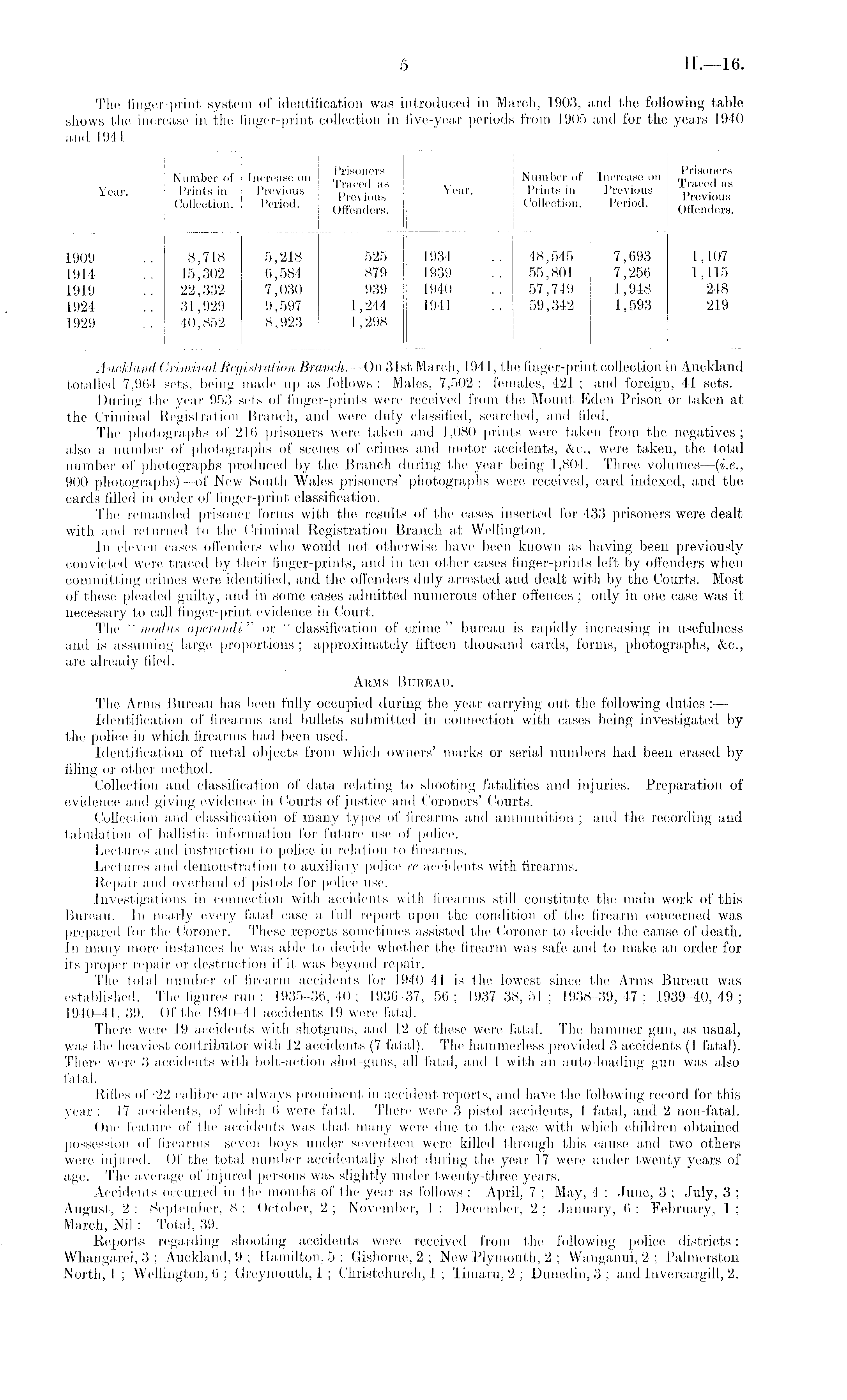 Auckland Criminal Registration Branch. —On 31st March, 1941, the finger-print collection in Auckland totalled 7,964 sets, being made tip as follows : Males, 7,502 ; females, 421 ; and foreign, 41 sets. During the year 953 sets of finger-prints were received from the Mount Eden Prison or taken at the Criminal Registration Branch, and were duly classified, searched, and filed. The photographs of 216 prisoners were taken and 1,080 prints were taken from the negatives ; also a number of photographs of scenes of crimes and motor accidents, &c., were taken, the total number of photographs produced by the Branch during the year being 1,804. Three volumes —{i.e., 900 photographs) —of Now South Wales prisoners' photographs were received, card indexed, and the cards filled in order of finger-print classification. The remanded prisoner forms with the results of the cases inserted for 433 prisoners were dealt with and returned to the Criminal Registration Branch at Wellington. In eleven cases offenders who would not otherwise have been known as having been previously convicted were traced by their finger-prints, and in ten other cases finger-prints left by offenders when committing crimes were identified, and the offenders duly arrested and dealt with by the Courts. Most of these pleaded guilty, and in some cases admitted numerous other offences ; only in one case was it necessary to call finger-print evidence in Court. The " modus operandi " or " classification of crime " bureau is rapidly increasing in usefulness and is assuming large proportions ; approximately fifteen thousand cards, forms, photographs, &c., are already filed. Arms Bureau. The Arms Bureau has been fully occupied during the year carrying out the following duties: — Identification of firearms and bullets submitted in connection with cases being investigated by the police in which firearms had been used. Identification of metal objects from which owners' marks or serial numbers had been erased by filing or other method. Collection and classification of data relating to shooting fatalities and injuries. Preparation of evidence and giving evidence in Courts of justice and Coroners' Courts. Collection and classification of many types of firearms and ammunition ; and the recording and tabulation of ballistic information for future use of police. Lectures and instruction to police in relation to firearms. Lectures and demonstration to auxiliary police re accidents with firearms. Repair and overhaul of pistols for police use. Investigations in connection with accidents with firearms still constitute the main work of this Bureau. In nearly every fatal case a full report upon the condition of the firearm concerned was prepared for the Coroner. These reports sometimes assisted the Coroner to decide the cause of death, in many more instances he was able to decide whether the firearm was safe and to make an order for its proper repair or destruction if it was beyond repair. The total number of firearm accidents for 1940-41 is the lowest since the Arms Bureau was established. The figures run : 1935-36,40; 1936-37, 56; 1937-38, 51 ; 1938-39, 47 ; 1939 -40, 49 ; 1940—41, 39. Of the 1940-41 accidents 19 were fatal. There were 19 accidents with shotguns, and 12 of these were fatal. The hammer gun, as usual, was the heaviest contributor with 12 accidents (7 fatal). The hammerless provided 3 accidents (1 fatal). There were 3 accidents with bolt-action shot-guns, all fatal, and 1 with an auto-loading gun was also fatal. Rifles of -22 calibre are always prominent in accident reports, and have the following record for this year: 17 accidents, of which 6 were fatal. There were 3 pistol accidents, 1 fatal, and 2 non-fatal. One feature of the accidents was that many were due to the ease with which children obtained possession of firearms —seven boys under seventeen were killed through this cause and two others were injured. Of the total number accidentally shot during the year 17 were under twenty years of age. The average of injured persons was slightly under twenty-three years. Accidents occurred in the months of the year as follows ; April, 7 ; May, 4 ; June, 3 ; July, 3 ; August, 2 ; September, 8 ; October, 2 ; November, 1 ; December, 2 ; January, 6 ; February, 1 ; March, Nil : Total, 39. Reports regarding shooting accidents were received from the following police districts; Whangarei, 3 ; Auckland, 9 ; Hamilton, 5 ; Gisborne, 2 ; New Plymouth, 2 ; Wanganui, 2 ; Palmerston North, 1 ; Wellington, 6 ; Greymouth, 1 ; Christchurch, 1 ; Timaru, 2 ; Dunedin, 3 ; and Invercargill, 2.