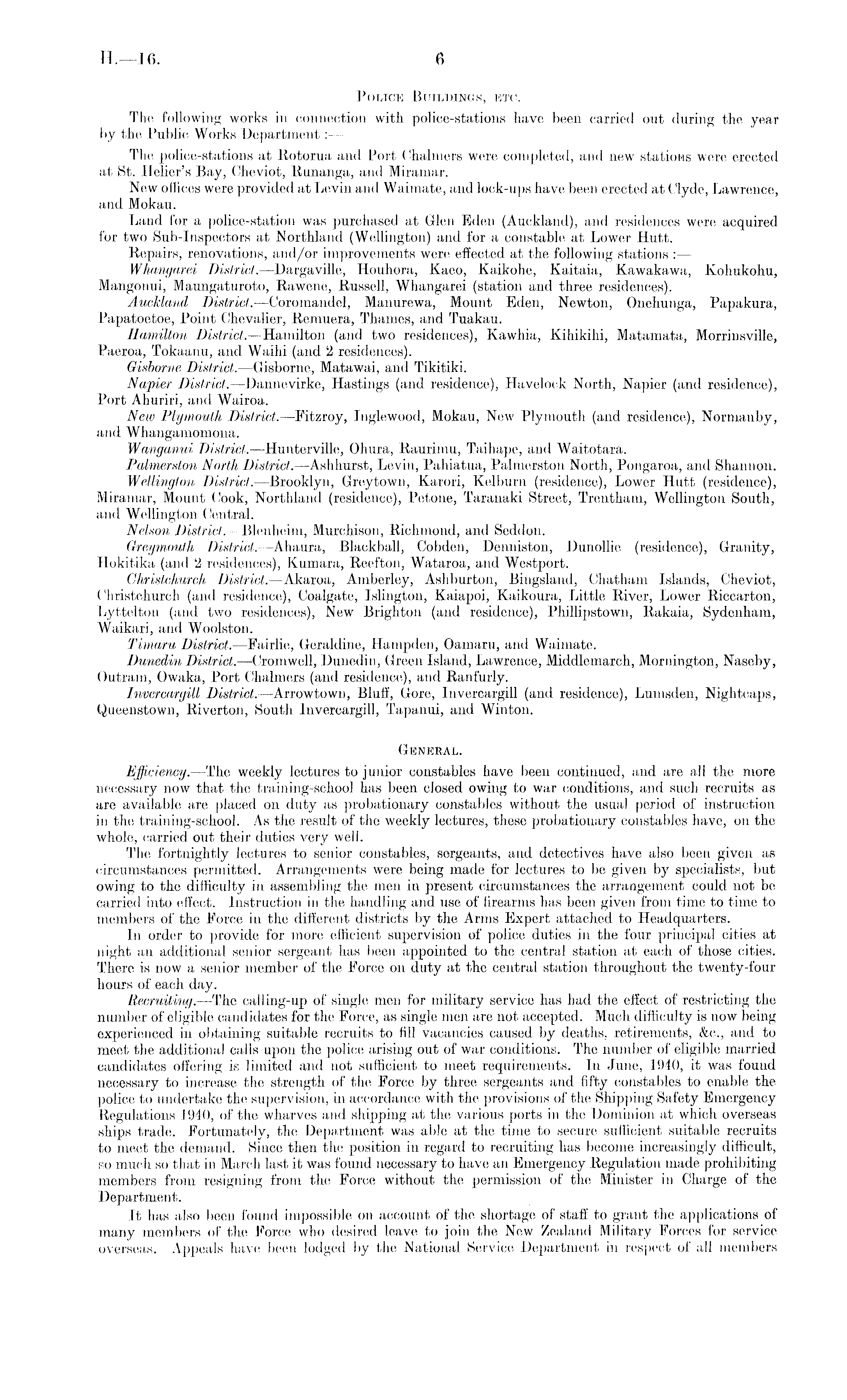 Police Buildings, etc. The following works in connection with police-stations have been carried out during the year by the Public Works Department:— The police-stations at Rotorua and Port Chalmers were completed, and new stations were erected at St. Helier's Bay, Cheviot, Runanga, and Miramar. New offices were provided at Levin and Waimate, and lock-ups have been erected at Clyde, Lawrence, and Mokau. Land for a police-station was purchased at Glen Eden (Auckland), and residences were acquired for two Sub-Inspectors at Northland (Wellington) and for a constable at Lower Hutt. Repairs, renovations, and/or improvements were effected at the following stations : — Whangarei District. —Dargaville, Houhora, Kaeo, Kaikohe, Kaitaia, Kawakawa, Kohukohu, Mangonui, Maungaturoto, Rawene, Russell, Whangarei (station and three residences). Auckland District. —Coromandel, Manurewa, Mount Eden, Newton, Onehunga, Papakura, Papatoetoe, Point Chevalier, Remuera, Thames, and Tuakau. Hamilton District. —Hamilton (and two residences), Kawhia, Kihikihi, Matamata, Morrinsville, Paeroa, Tokaanu, and Waihi (and 2 residences). Gisborne District.—Gisborne, Matawai, and Tikitiki. Napier District. —Dannevirke, Hastings (and residence), Havelock North, Napier (and residence), Port Ahuriri, and Wairoa. New Plymouth District. —Fitzroy, Inglewood, Mokau, New Plymouth (and residence), Normanby, and Whangamomona. Wanganui District. —Hunterville, Ohura, Raurimu, Taihape, and Waitotara. Palmerston North District. —Ashhurst, Levin, Pahiatua, Palmerston North, Pongaroa, and Shannon. Wellington District.—Brooklyn, Greytown, Karori, Kelburn (residence), Lower Hutt (residence), Miramar, Mount Cook, Northland (residence), Petone, Taranaki Street, Trentham, Wellington South, and Wellington Central. Nelson District. —Blenheim, Murchison, Richmond, and Seddon. Greymouth District. —Ahaura, Blackball, Cobden, Denniston, Dunollie (residence), Granity, Hokitika (and 2 residences), Kumara, Reefton, Wataroa, and Westport. Christchurch District. —Akaroa, Amberley, Ashburton, Bingsland, Chatham Islands, Cheviot, Christchurch (and residence), Coalgate, Islington, Kaiapoi, Kaikoura, Little River, Lower Riccarton, Lyttelton (and two residences), New Brighton (and residence), Phillipstown, Rakaia, Sydenham, Waikari, and Woolston. Timaru District.—Fairlie, Geraldine, Hampden, Oamaru, and Waimate. Dunedin District. —Cromwell, Dunedin, Green Island, Lawrence, Middlemarch, Mornington, Naseby, Outram, Owaka, Port Chalmers (and residence), and Ranfurly. Invercargill District. —Arrowtown, Bluff, Gore, Invercargill (and residence), Lumsden, Nightcaps, Queenstown, Riverton, South Invercargill, Tapanui, and Winton. General. Efficiency.—The weekly lectures to junior constables have been continued, and are all the more necessary now that the training-school has been closed owing to war conditions, and such recruits as are available are placed on duty as probationary constables without the usual period of instruction in the training-school. As the result of the weekly lectures, these probationary constables have, 011 the whole, carried out their duties very well. The fortnightly lectures to senior constables, sergeants, and detectives have also been given as circumstances permitted. Arrangements were being made for lectures to be given by specialists, but owing to the difficulty in assembling the men in present circumstances the arrangement could not be carried into effect. Instruction in the handling and use of firearms has been given from time to time to members of the Force in the different districts by the Arms Expert attached to Headquarters. In order to provide for more efficient supervision of police duties in the four principal cities at night an additional senior sergeant has been appointed to the central station at each of those cities. There is now a senior member of the Force on duty at the central station throughout the twenty-four hours of each day. Recruiting.—The calling-up of single men for military service has had the effect of restricting the number of eligible candidates for the Force, as single men are not accepted. Much difficulty is now being experienced in obtaining suitable recruits to fill vacancies caused by deaths, retirements, &c., and to meet the additional calls upon the police arising out of war conditions. The number of eligible married candidates offering is limited and not sufficient to meet requirements. In June, 1940, it was found necessary to increase the strength of the Force by three sergeants and fifty constables to enable the police to undertake the supervision, in accordance with the provisions of the Shipping Safety Emergency Regulations 1940, of the wharves and shipping at the various ports in the Dominion at which overseas ships trade. Fortunately, the Department was able at the time to secure sufficient suitable recruits to meet the demand. Since then the position in regard to recruiting has become increasingly difficult, so much so that in March last it was found necessary to have an Emergency Regulation made prohibiting members from resigning from the Force without the permission of the Minister in Charge of the Department. It has also been found impossible on account of the shortage of staff to grant the applications of many members of the Force who desired leave to join the New Zealand Military Forces for service overseas. Appeals have been lodged by the National Service Department in respect of all members