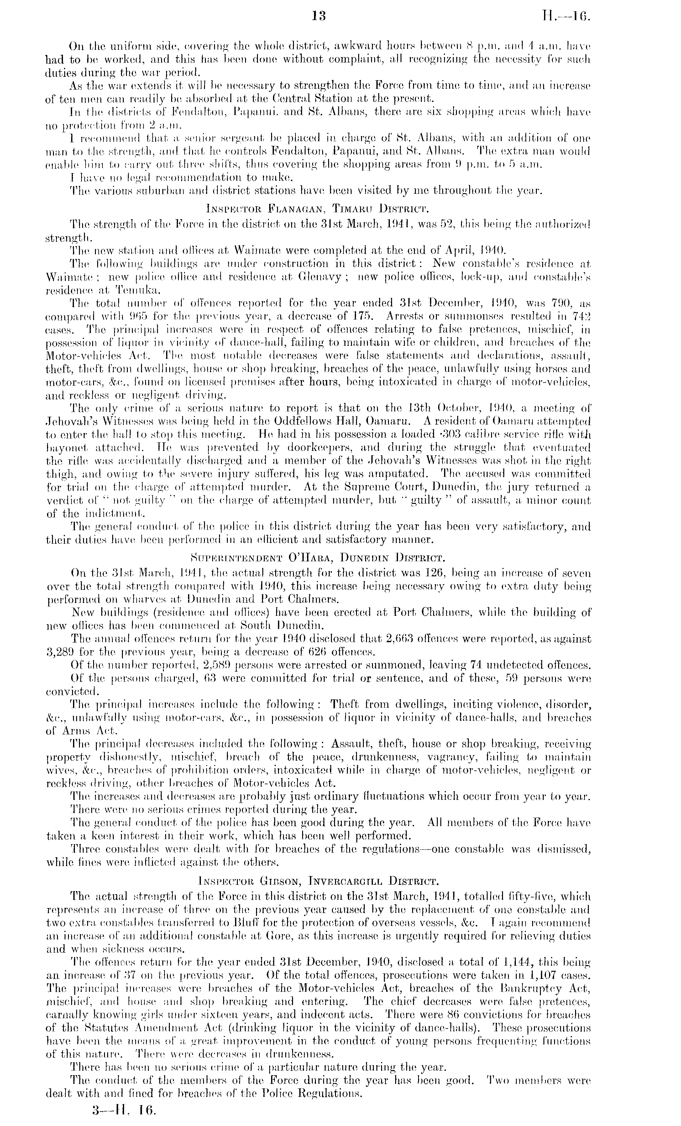 On the uniform side, covering the whole district, awkward hours between 8 p.m. and 4 a.m. have had to be worked, and this has been done without complaint, all recognizing the necessity for such duties during the war period. As the war extends it will be necessary to strengthen the Force from time to time, and an increase of ten men can readily be absorbed at the Central Station at the present. In the districts of Fendalton, Papanui, and St. Albans, there are six shopping areas which have no protection from 2 a.m. I recommend that a. senior sergeant be placed in charge of St. Albans, with an addition of one man to the strength, and that he controls Fendalton, Papanui, and St. Albans. The extra man would enable him to carry out three shifts, thus covering the shopping areas from 9 p.m. to 5 a.m. I have no legal recommendation to make. The various suburban and district stations have been visited by me throughout the year. Inspector Flanagan, Timaru District. The strength of the Force in the district on the 31st March, 1941, was 52, this being the authorized strength. The new station and offices at Waimate were completed at the end of April, 1940. The following buildings are under construction in this district: New constable's residence at Waimate ; new police office and residence at Glenavy; new police offices, lock-up, and constable's residence at Temuka. The total number of offences reported for the year ended 31st December, 1940, was 790, as compared with 965 for the previous year, a decrease of 175. Arrests or summonses resulted in 742 cases. The principal increases were in respect of offences relating to false pretences, mischief, in possession of liquor in vicinity of dance-hall, failing to maintain wife or children, and breaches of the Motor-vehicles Act. The most notable decreases were false statements and declarations, assault, theft, theft from dwellings, house or shop breaking, breaches of the peace, unlawfully using horses and motor-cars, &c., found on licensed premises after hours, being intoxicated in charge of motor-vehicles, and reckless or negligent driving. The only crime of a serious nature to report is that on the 13th October, 1940, a meeting of Jehovah's Witnesses was being held in the Oddfellows Hall, Oamaru. A resident of Oamaru attempted to enter the hall to stop this meeting. He had in his possession a loaded -303 calibre service rifle with bayonet attached. He was prevented by doorkeepers, and during the struggle that eventuated the rifle was accidentally discharged and a member of the Jehovah's Witnesses was shot in the right thigh, and owing to the severe injury suffered, his leg was amputated. The accused was committed for trial on the charge of attempted murder. At the Supreme Court, Dunedin, the jury returned a verdict of " not guilty " on the charge of attempted murder, but " guilty " of assault, a minor count of the indictment. The general conduct of the police in this district during the year has been very satisfactory, and their duties have been performed in an efficient and satisfactory manner. Superintendent O'Hara, Dunedin District. On the 31st March, 1941, the actual strength for the district was 126, being an increase of seven over the total strength compared with 1940, this increase being necessary owing to extra duty being performed on wharves at Dunedin and Port Chalmers. New buildings (residence and offices) have been erected at Port Chalmers, while the building of new offices has been commenced at South Dunedin. The annual offences return for the year 1940 disclosed that 2,663 offences were reported, as against 3,289 for the previous year, being a decrease of 626 offences. Of the number reported, 2,589 persons were arrested or summoned, leaving 74 undetected offences. Of the persons charged, 63 were committed for trial or sentence, and of these, 59 persons were convicted. The principal increases include the following : Theft from dwellings, inciting violence, disorder, &c., unlawfully using motor-cars, &c., in possession of liquor in vicinity of dance-halls, and breaches of Arms Act. The principal decreases included the following : Assault, theft, house or shop breaking, receiving property dishonestly, mischief, breach of the peace, drunkenness, vagrancy, failing to maintain wives, &c., breaches of prohibition orders, intoxicated while in charge of motor-vehicles, negligent or reckless driving, other breaches of Motor-vehicles Act. The increases and decreases are probably just ordinary fluctuations which occur from year to year. There were no serious crimes reported during the year. The general conduct of the police has been good during the year. All members of the Force have taken a keen interest in their work, which has been well performed. Three constables were dealt with for breaches of the regulations —one constable was dismissed, while fines were inflicted against the others. Inspector Gibson, Invercargill District. The actual strength of the Force in this district on the 31st March, 1941, totalled fifty-five, which represents an increase of three on the previous year caused by the replacement of one constable and two extra constables transferred to Bluff for the protection of overseas vessels, &c. I again recommend an increase of an additional constable at Gore, as this increase is urgently required for relieving duties and when sickness occurs. The offences return for the year ended 31st December, 1940, disclosed a total of 1,144, this being an increase of 37 on the previous year. Of the total offences, prosecutions were taken in 1,107 oases. The principal increases were breaches of the Motor-vehicles Act, breaches of the Bankruptcy Act, mischief, and house and shop breaking and entering. The chief decreases were false pretences, carnally knowing girls under sixteen years, and indecent acts. There were 86 convictions for breaches of the Statutes Amendment Act (drinking liquor in the vicinity of dance-halls). These prosecutions have bee