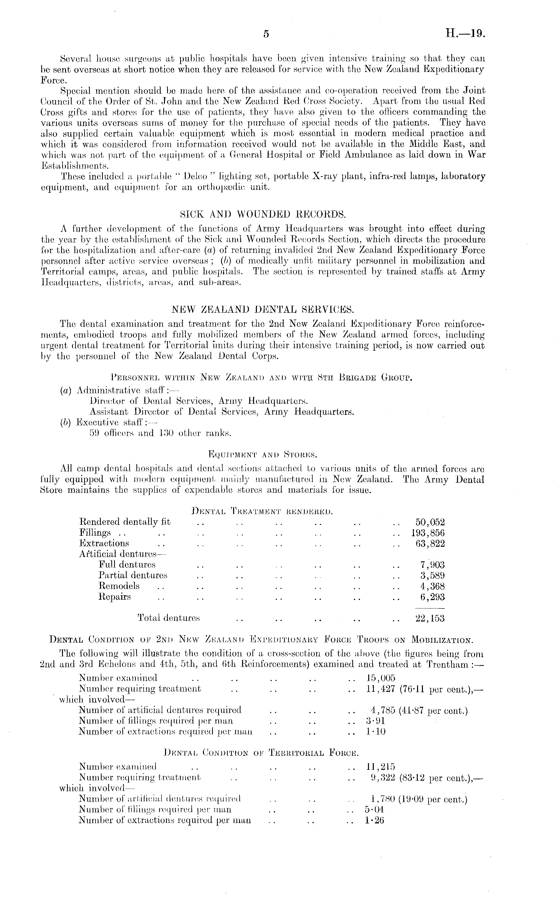 Several house surgeons at public hospitals have been given intensive training so that they can be sent overseas at short notice when they are released for service with the New Zealand Expeditionary Force. Special mention should be made here of the assistance and co-operation received from the Joint Council of the Order of St. John and the New Zealand Red Cross Society. Apart from the usual Red Cross gifts and stores for the use of patients, they have also given to the officers commanding the various units overseas sums of money for the purchase of special needs of the patients. They have also supplied certain valuable equipment which is most essential in modern medical practice and which it was considered from information received would not be available in the Middle East, and which was not part of the equipment of a General Hospital or Field Ambulance as laid down in War Establishments. These included a portable " Delco " lighting set, portable X-ray plant, infra-red lamps, laboratory equipment, and equipment for an orthopaedic unit. SICK AND WOUNDED RECORDS. A further development of the functions of Army Headquarters was brought into effect during the year by the establishment of the Sick and Wounded Records Section, which directs the procedure for the hospitalization and after-care (a) of returning invalided 2nd New Zealand Expeditionary Force personnel after active service overseas; (b) of medically unfit military personnel in mobilization and Territorial camps, areas, and public hospitals. The section is represented by trained staffs at Army Headquarters, districts, areas, and sub-areas. NEW ZEALAND DENTAL SERVICES. The dental examination and treatment for the 2nd New Zealand Expeditionary Force reinforcements, embodied troops and fully mobilized members of the New Zealand, armed forces, including urgent dental treatment for Territorial units during their, intensive training period, is now carried out by the personnel of the New Zealand Dental Corps. Personnel within New Zealand and with Bth Brigade Group. (a) Administrative staff : — Director of Dental Services, Army Headquarters. Assistant Director of Dental Services, Army Headquarters. (b) Executive staff: — 59 officers and 130 other ranks. Equipment and Storks. All camp dental hospitals and dental sections attached to various units of the armed forces are fully equipped with modern equipment mainly manufactured in Now Zealand. The Army Dental Store maintains the supplies of expendable stores and materials for issue. Dental Treatment rendered. Rendered dentally fit .. .. .. .. .. .. 50,052 Fillings .. .. .. .. .. .. .. .. 193,856 Extractions .. .. .. .. .. .. .. 63,822 Artificial dentures— Full dentures .. .. .. .. .. .. 7,903 Partial dentures .. .. .. .. .. .. 3,589 Remodels .. .. .. .. .. .. .. 4,368 Repairs .. .. .. .. .. .. .. 6,293 Total dentures .. ~ .. .. ..22,153 Dental Condition op 2nd New Zealand Expeditionary Force Troops on Mobilization. The following will illustrate the condition of a cross-section of the above (the figures being from 2nd and 3rd Echelons and 4th, sth, and 6th Reinforcements) examined and treated at Trentham :— Number examined .. .. .. .. .. 15,005 Number requiring treatment .. .. .. .. 11,427 (76-11 per cent.), — which involved — Number of artificial dentures required .. .. .. 4,785 (41-87 per cent.) Number of fillings required per man .. .. .. 3-91 Number of extractions required per man .. .. .. m 1• 10 Dental Condition or Territorial Force. Number examined .. .. ~ .. .. 11,215 Number requiring treatment .. .. .. .. 9,322 (83-12 per cent.), — which involved — Number of artificial dentures required ... .. ~ 1,780 (19-09 per cent.) Number of fillings required per man .. .. ..5-04 Number of extractions required per man .. .. .. 1•26