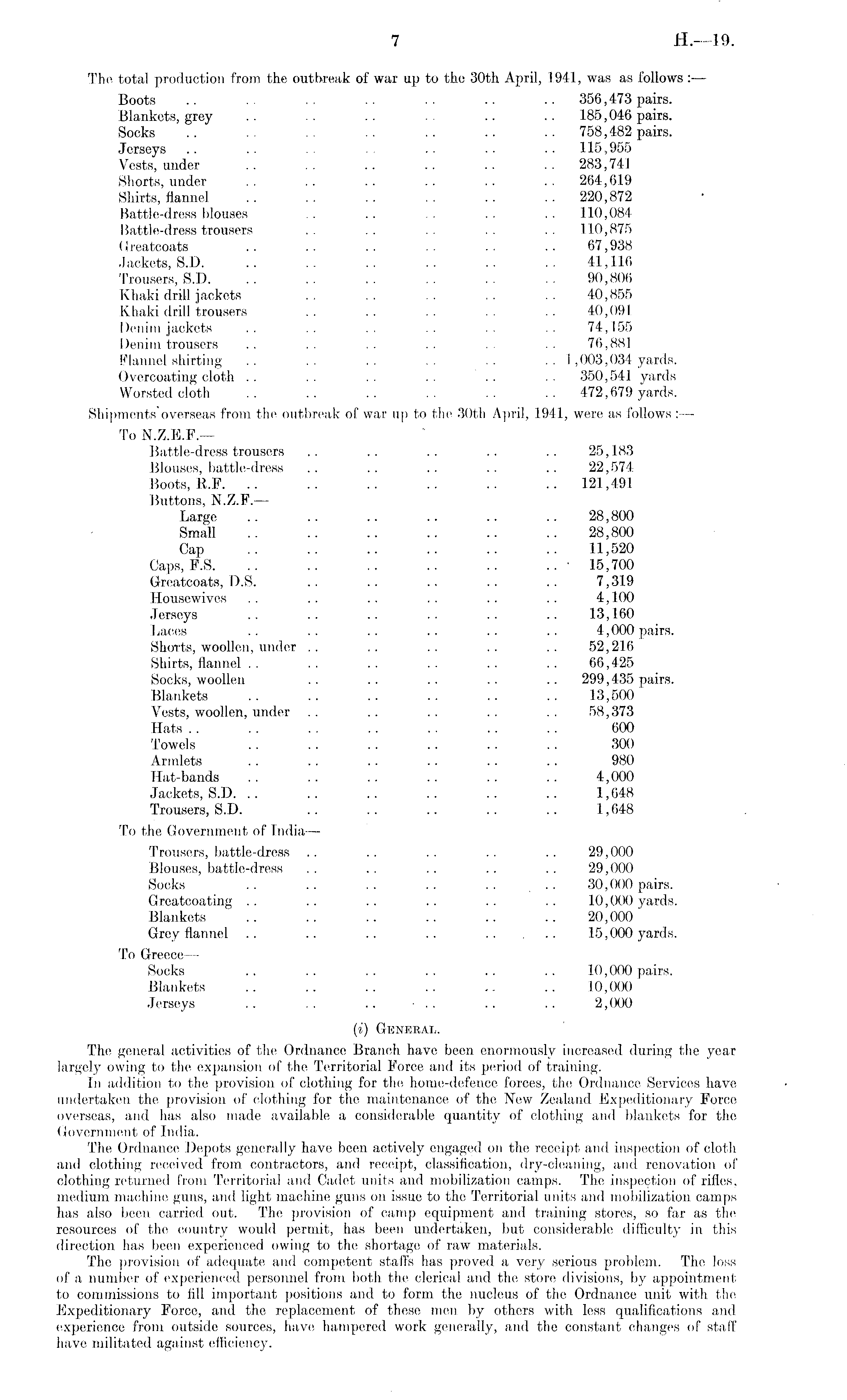 The total production from the outbreak of war up to the 30th April, 1941, was as follows : — Boots .. ..\ .. .. .. .. .. 356,473 pairs. Blankets, grey .. .. .. .. .. .. 185,046 pairs. Socks .. .. ... .. .. .. .. 758,482 pairs. Jerseys .. .. .. .. .. .. .. 115,955 Vests, under .. .. .. .. .. .. 283,741 Shorts, under .. .. .. .. .. .. 264,619 Shirts, flannel ... .. .. .. .. .. 220,872 Battle-dress blouses .. .. .. .. .. 110,084 Battle-dress trousers . . . . . . . . .. 110,875 Greatcoats .. .. .. .. .. .. 67,938 Jackets, S.D. .. .. '.. .. .. .. 41,116 Trousers, B.D. .. .. .. .. .. .. 90,806 Khaki drill jackets .. .. .. .. .. 40,855 Khaki drill trousers .. .. .. .. .. 40,091 Denim jackets .. .. .. ..-. .. .. 74,155 Denim trousers . . .. . . . . . . . . 76,881 Flannel shirting .. .. .. -.. .. .. 1,003,034 yards. Overcoating cloth .. .. .. .. .. .. 350,541 yards Worsted cloth .. .. .. .. .. .. 472,679 yards. Shipments'overseas from the outbreak of war up to the 30th April, 1941, were as follows :— To N.Z.E.F.— Battle-dress trousers .. .. .. .. .. 25,183 Blouses, battle-dress .. .. .. .. .. 22,574 Boots, R.F 121,491 Buttons, N.Z.F.— Large ■ .. 28,800 Small .. .. .. .. .. .. 28,800 Cap 11,520 Caps, F.S • 15,700 Greatcoats, D.S. .. .. .. .. .. 7,319 Housewives .. .. .. .. .. .. 4,100 Jerseys .. .. .. .. .. .. 13,160 Laces .. .. .. .. .. .. 4,000 pairs. Shotts, woollen, under .. .. .. .. .. 52,216 Shirts, flannel .. .. .. .. .. ..' 66,425 Socks, woollen .. .. .. .. .. 299,435 pairs. Blankets .. .. .. .. .. .. 13,500 Vests, woollen, under .. .. .. .. .. 58,373 Hats .. .. .. .. .. .. .. 600 Towels .. .. .. .. .. .. 300 Armlets .. .. .. .. .. .. 980 Hat-bands .. .. .. .. .. .. 4,000 Jackets, S.D. .. .. .. .. .. .. 1,648 Trousers, S.D. .. .. .. .. .. 1,648 To the Government of India— Trousers, battle-dress .... .. .. .. .. 29,000 Blouses, battle-dress .. .. .. .. .. 29,000 Socks .. .. .. .. .. ... 30,000 pairs. Greatcoating .. .. .. . . .. .. 10,000 yards. Blankets .. ' .. .. .. .. .. 20,000 Grey flannel .. .. .. .. .. ... 15,000 yards. To Greece — Socks .. .. .. .. .. .. 10,000 pairs. Blankets .. .. .. .. .. .. 10,000 Jerseys .. .. .. • .. .. .. 2,000 (i) General. The general activities of the Ordnance Branch have been enormously increased during the year largely owing to the expansion of the Territorial Force and its period of training. In addition to the provision of clothing for the home-defence forces, the Ordnance Services have undertaken the provision of clothing for the maintenance of the New Zealand Expeditionary Force overseas, and has also made available a considerable quantity of clothing and blankets for the Government of India. The Ordnance Depots generally have been actively engaged on the receipt and inspection of cloth and clothing received from contractors, and receipt, classification, dry-cleaning, and renovation of clothing returned from Territorial and Cadet units and mobilization camps. The inspection of rifles, medium machine guns, and light machine guns on issue to the Territorial units and mobilization camps has also been carried out. The provision of camp equipment and training stores, so far as the resources of the country would permit, has been undertaken, but considerable difficulty in this direction has been experienced owing to the shortage of raw materials. The provision of adequate and competent staffs has proved a very serious problem. The loss of a number of experienced personnel from both the clerical and the store divisions, by appointment to commissions to fill important positions and to form the nucleus of the Ordnance unit with the Expeditionary Force, and the replacement of these men by others with less qualifications and experience from outside sources, have hampered work generally, and the constant changes of staff have militated against efficiency.