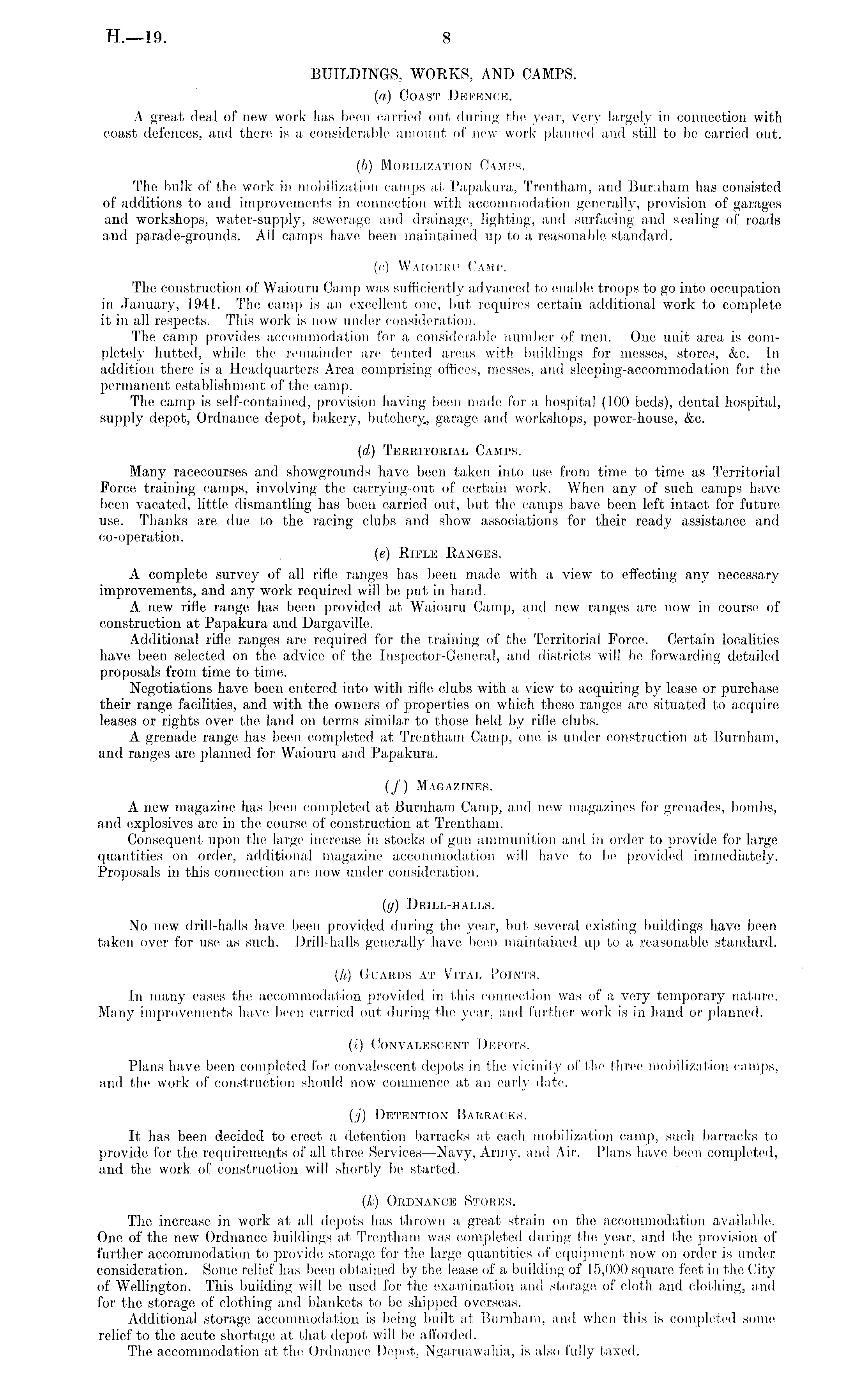 BUILDINGS, WORKS, AND CAMPS. (a) Coast Defence. •" A great deal of new work has been carried out during the year, very largely in connection with coast defences, and there is a considerable amount of new work planned and still to be carried out. (b) Mobilization Gamps. The bulk of the work in mobilization camps at Papakura, Trentham, and Bumbam has consisted of additions to and improvements in connection with accommodation generally, provision of garages and workshops, water-supply, sewerage and drainage, lighting, and surfacing and sealing of roads and parade-grounds. All camps have been maintained up to a reasonable standard. (o) Waiouru Camp. The construction of Waiouru Camp was sufficiently advanced to enable troops to go into occupation in January, 1941. The camp is an excellent one, but requires certain additional work to complete it in all respects. This work is now under consideration. The camp provides accommodation for a considerable number of men. One unit area is completely hutted, while the remainder are tented areas with buildings for messes, stores, &c. In addition there is a Headquarters Area comprising offices, messes, and sleeping-accommodation for the permanent establishment of the camp. The camp is self-contained, provision having been made for a hospital (100 beds), dental hospital, supply depot, Ordnance depot, bakery, butchery., garage and workshops, power-house, &c. (d) Teeeitoeial Camps. Many racecourses and showgrounds have been taken into use from time to time as Territorial Force training camps, involving the carrying-out of certain work. When any of such camps have been vacated, little dismantling has been carried out, but the camps have been left intact for future use. Thanks are due to the racing clubs and show associations for their ready assistance and co-operation. (e) Rifle Ranges. A complete survey of all rifle ranges has been made with a view to effecting any necessary improvements, and any work required will be put in hand. A new rifle range has been provided at Waiouru Camp, and new ranges are now in course of construction at Papakura and Dargaville. Additional rifle ranges are required for the training of the Territorial Force. Certain localities have been selected on the advice of the Inspector-General, and districts will be forwarding detailed proposals from time to time. Negotiations have been entered into with rifle clubs with a view to acquiring by lease or purchase their range facilities, and with the owners of properties on which these ranges arc situated to acquire leases or rights over the land on terms similar to those held by rifle clubs. A grenade range has been completed at Trentham Camp, one is under construction at Burnham, and ranges are planned for Waiouru and Papakura. (/) Magazines. A new magazine has been completed at Burnham Camp, and new magazines for grenades, bombs, and explosives are in the course of construction at Trentham. Consequent upon the large increase in stocks of gun ammunition and in order to provide for large quantities on order, additional magazine accommodation will have to be provided immediately. Proposals in this connection are now under consideration. (g) Drill-halls. No new drill-halls have been provided during the year, but several existing buildings have been taken over for use as such. Drill-halls generally have been maintained up to a reasonable standard. (h) Guaeds at Vital Points. In many cases the accommodation provided in this connection was of a very temporary nature. Many improvements have been carried out during the year, and further work is in hand or planned. (i) Convalescent Depots. Plans have, been completed for convalescent depots in the vicinity of the three mobilization camps, and the work of construction should now commence at an. early date. (j) Detention Barracks. It has been decided to erect a detention barracks at each mobilization camp, such barracks to provide for the requirements of all three Services —Navy, Army, and Air. Plans have been completed, and the work of construction will shortly be started. (&) Ordnance Stores. The increase in work at all depots has thrown a great strain on the accommodation available. One of the new Ordnance buildings at Trentham was completed during the year, and the provision of further accommodation to provide storage for the large quantities of equipment now on order is under consideration. Some relief has been obtained by the lease of a building of 15,000 square feet in the City of Wellington. This building will be used for the examination and storage of cloth and clothing, and for the storage of clothing and blankets to be shipped overseas. Additional storage accommodation is being built at Burnham, and when this is completed some relief to the acute shortage at that depot will be afiorded. The accommodation at the Ordnance Depot, Ngaruawahia, is also fully taxed.