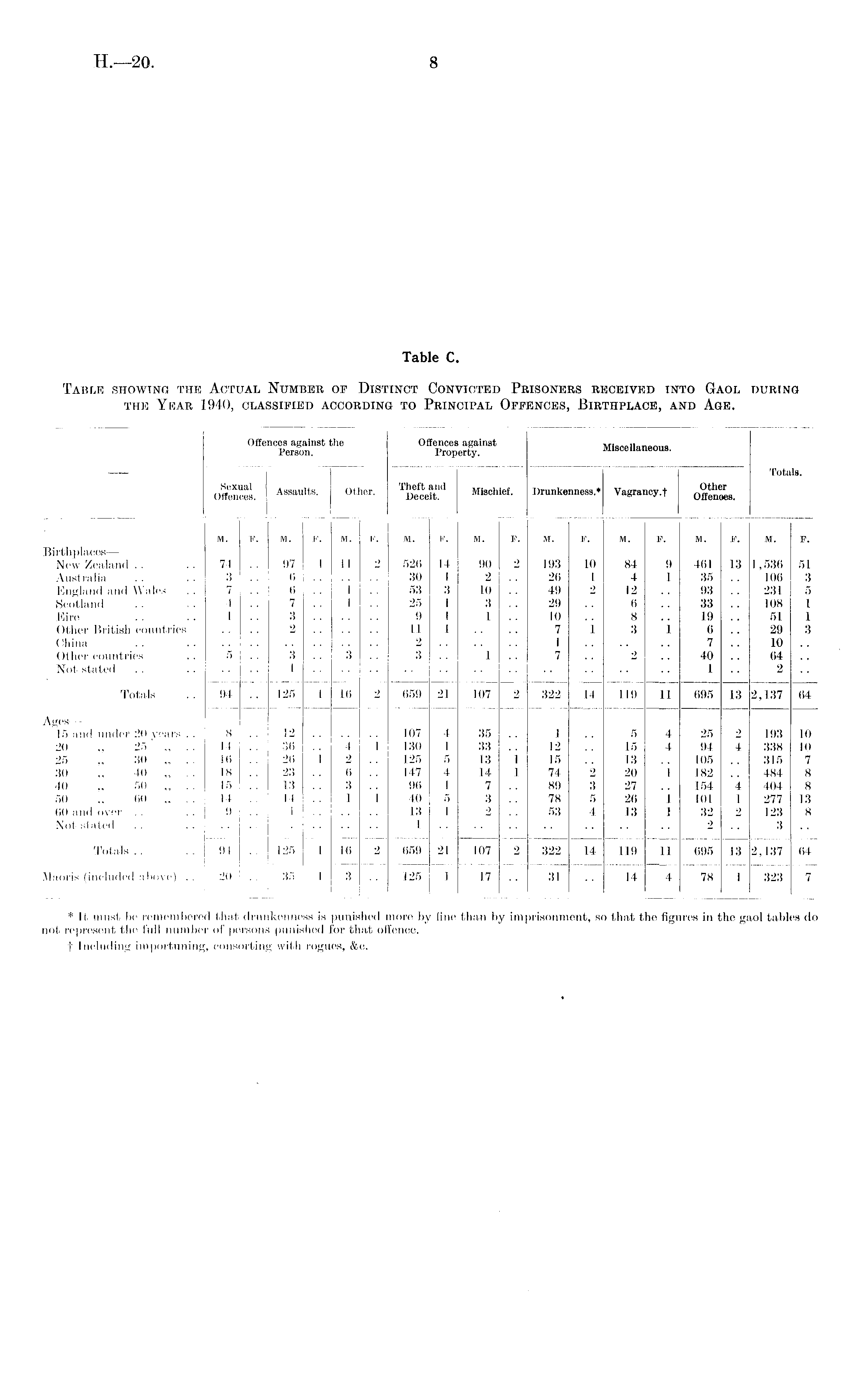 Table C. Table showing the Actual Number of Distinct Convicted Prisoners received into Gaol during the Year 1940, classified according to Principal Offences, Birthplace, and Age.