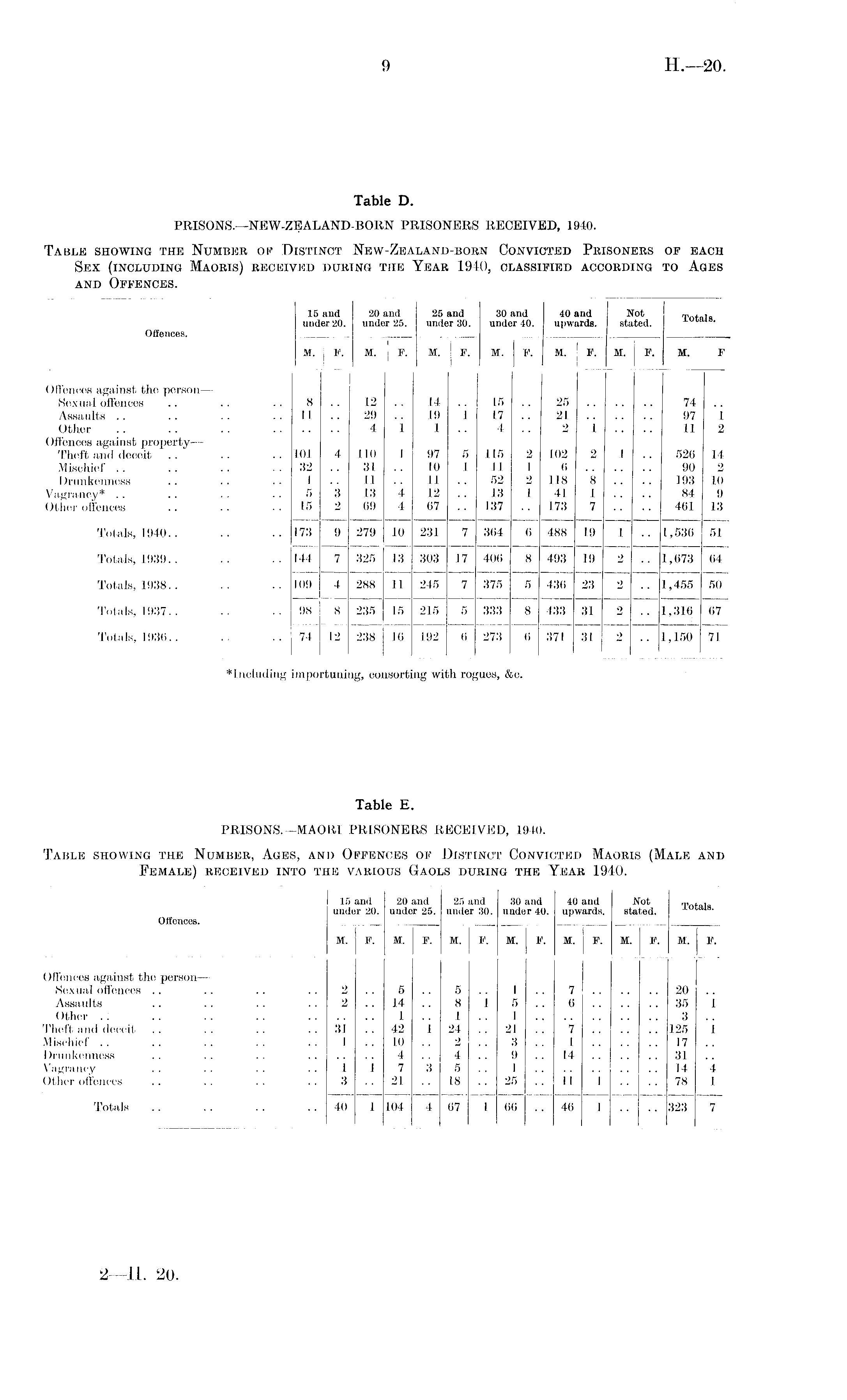 Table E. PRISONS.—MAORI PRISONERS RECEIVED, 1940. Table showing the Number, Ages, and Offences of Distinct Convicted Maoris (Male and Female) received into the various Gaols during the Year 1940.