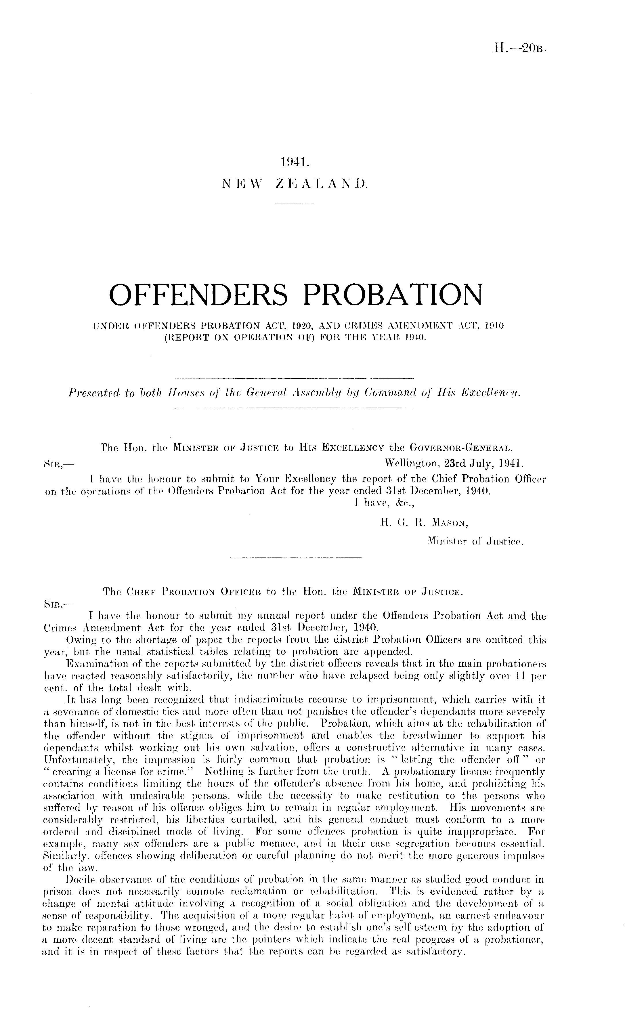 The Hon. the Minister of Justice to His Excellency the Governor-General. Sir, — Wellington, 23rd July, 1941. I have the honour to submit to Your Excellency the report of the Chief Probation Officer on the operations of the Offenders Probation Act for the year ended 31st December, 1940. I have, &c., H. G. R. Mason, Minister of Justice.