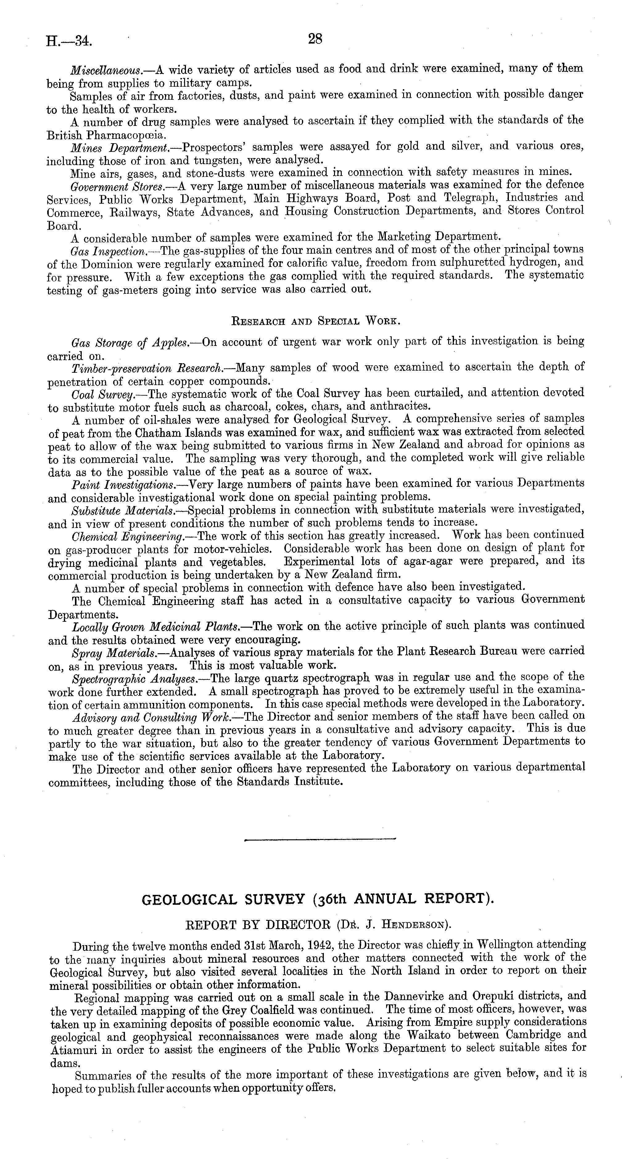 GEOLOGICAL SURVEY (36th ANNUAL REPORT). REPORT BY DIRECTOR (DA. J. Henderson). During the twelve months ended 31st March, 1942, the Director was chiefly in Wellington attending to the many inquiries about mineral resources and other matters connected with the work of the Geological Survey, but also visited several localities in the North Island in order to report on their mineral possibilities or obtain other information. Regional mapping was carried out on a small scale in the Dannevirke and Orepuki districts, and the very detailed mapping of the Grey Coalfield was continued. The time of most officers, however, was taken up in examining deposits of possible economic value. Arising from Empire supply considerations geological and geophysical reconnaissances were made along the Waikato between Cambridge and Atiamuri in order to assist the engineers of the Public Works Department to select suitable sites for dams. Summaries of the results of the more important of these investigations are given below, and it is hoped to publish fuller accounts when opportunity offers.