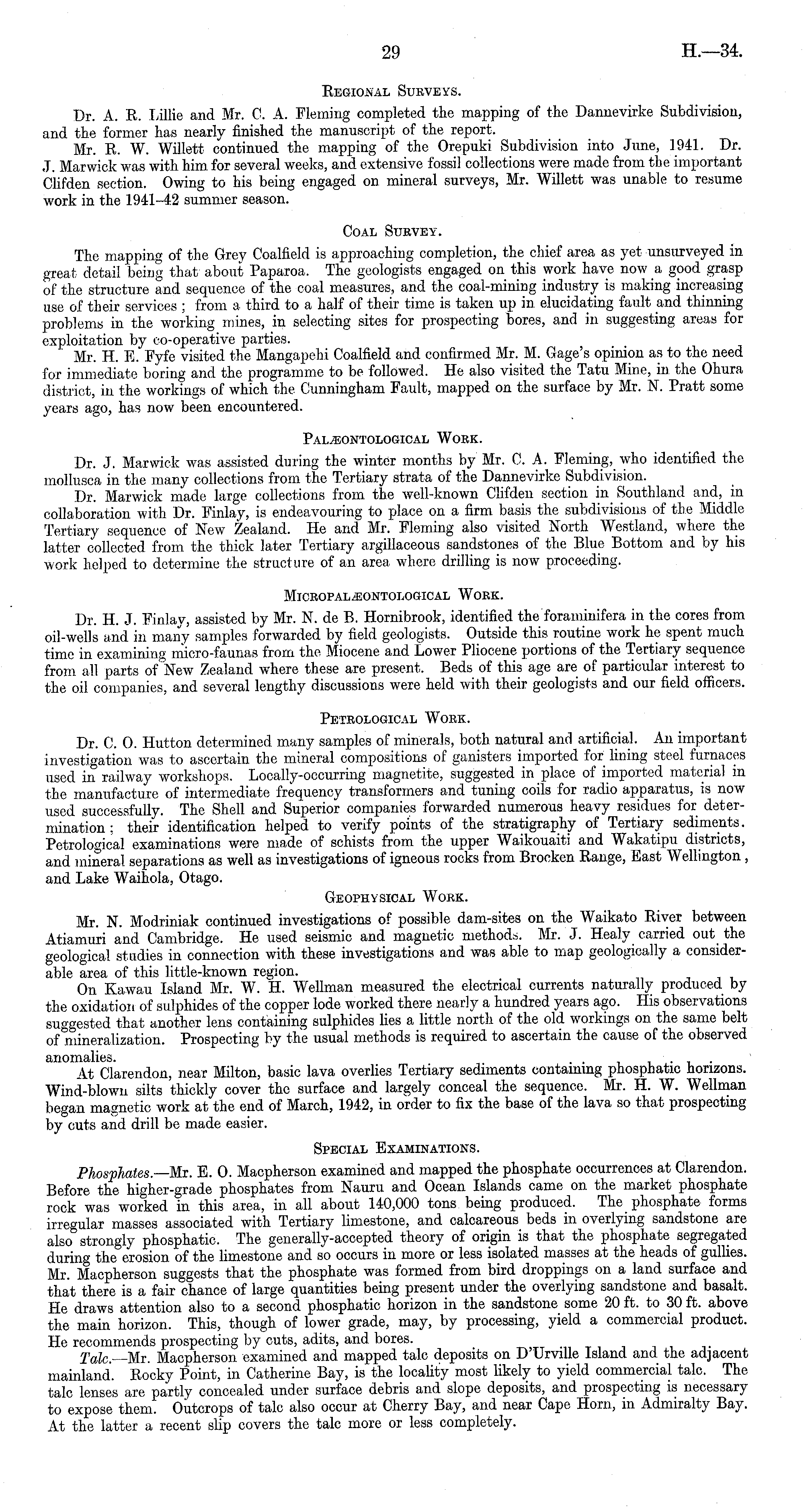 Regional Surveys. Dr. A. R. Lillie and Mr. C. A. Fleming completed the mapping of the Dannevirke Subdivision, and the former has nearly finished the manuscript of the report. Mr. R. W. Willett continued the mapping of the Orepuki Subdivision into June, 1941. Dr. J. Marwick was with him for several weeks, and extensive fossil collections were made from the important Clifden section. Owing to his being engaged on mineral surveys, Mr. Willett was unable to resume work in the 1941-42 summer season. Coal Survey. The mapping of the Grey Coalfield is approaching completion, the chief area as yet unsurveyed in great detail being that about Paparoa. The geologists engaged on this work have now a good grasp of the structure and sequence of the coal measures, and the coal-mining industry is making increasing use of their services ; from a third to a half of their time is taken up in elucidating fault and thinning problems in the working mines, in selecting sites for prospecting bores, and in suggesting areas for exploitation by co-operative parties. Mr. H. E. Fyfe visited the Mangapehi Coalfield and confirmed Mr. M. Gage's opinion as to the need for immediate boring and the programme to be followed. He also visited the latu Mine, in the Ohura district, in the workings of which the Cunningham Fault, mapped on the surface by Mr. N. Pratt some years ago, has now been encountered. Pal/Eontological Work. Dr. J. Marwick was assisted during the winter months by Mr. C. A. Fleming, who identified the mollusca in the many collections from the Tertiary strata of the Dannevirke Subdivision. Dr. Marwick made large collections from the well-known Clifden section in_ Southland and, in collaboration with Dr. Finlay, is endeavouring to place on a firm basis the subdivisions of the Middle Tertiary sequence of New Zealand. lie and Mr. Fleming also visited North Westland, where the latter collected from the thick later Tertiary argillaceous sandstones of the Blue Bottom and by his work helped to determine the structure of an area where drilling is now proceeding. Micropalzeontological Work. Dr. H. J. Finlay, assisted by Mr. N. de B. Hornibrook, identified the foraminifera in the cores from oil-wells and in many samples forwarded by field geologists. Outside this routine work he spent much time in examining micro-faunas from the Miocene and Lower Pliocene portions of the Tertiary sequence from all parts of New Zealand where these are present. Beds of this age are of particular interest to the oil companies, and several lengthy discussions were held with their geologists and our field officers. Petrological Work. Dr. C. 0. Hutton determined many samples of minerals, both, natural and artificial. An important investigation was to ascertain the mineral compositions of ganisters imported for lining steel furnaces used in railway workshops. Locally-occurring magnetite, suggested in place ol imported material in the manufacture of intermediate frequency transformers and tuning coils for radio apparatus, is now used successfully. The Shell and Superior companies forwarded numerous heavy residues for determination : their identification helped to verify points of the stratigraphy of Tertiary sediments. Petrological examinations were made of schists from the upper Waikouaiti and Wakatipu districts, and mineral separations as well as investigations of igneous rooks from Brocken Range, East Wellington , and Lake Waihola, Otago. Geophysical Work. Mr. N. Modriniak continued investigations of possible dam-sites on the Waikato River between Atiamuri and Cambridge. He used seismic and magnetic methods. Mr. J. Healy carried out the geological studies in connection with these investigations and was able to map geologically a considerable area of this little-known region. 1 , On Kawau Island Mr. W. H. Wellman measured the electrical currents naturally produced by the oxidation of sulphides of the copper lode worked there nearly a hundred years ago. His observations suggested that another lens containing sulphides lies a little north of the old workings on the same belt of mineralization. Prospecting by the usual methods is required to ascertain the cause of the observed anomalies. . . . . At Clarendon, near Milton, basic lava overlies Tertiary sediments containing phosphatic horizons. Wind-blown silts thickly cover the surface and largely conceal the sequence. Mr. H. W. Wellman began magnetic work at the end of March, 1942, in order to fix the base of the lava so that prospecting by cuts and drill be made easier. Special Examinations. Phosphates. —Mr. E. 0. Macpherson examined and mapped the phosphate occurrences at Clarendon. Before the higher-grade phosphates from Nauru and Ocean Islands came on the market phosphate rock was worked in this area, in all about 140,000 tons being produced. The phosphate forms irregular masses associated with Tertiary limestone, and calcareous beds in overlying sandstone are also strongly phosphatic. The generally-accepted theory of origin is that the phosphate segregated during the erosion of the limestone and so occurs in more or less isolated masses at the heads of gullies. Mr. Macpherson suggests that the phosphate was formed from bird droppings on a land surface and that there is a fair chance of large quantities being present under the overlying sandstone and basalt. He draws attention also to a second phosphatic horizon in the sandstone some 20 ft. to 30 ft. above the main horizon. This, though of lower grade, may, by processing, yield a commercial product. He recommends prospecting by cuts, adits, and bores. r £alc. —Mr. Macpherson examined and mapped talc deposits on D Urville Island and the adjacent mainland. Rocky Point, in Catherine Bay, is the locality most likely to yield commercial talc. The talc lenses are partly concealed under surface debris and slope deposits, and prospecting is necessary to expose them. Outcrops of talc also occur at Cherry Bay, and near Cape Horn, in Admiralty Bay