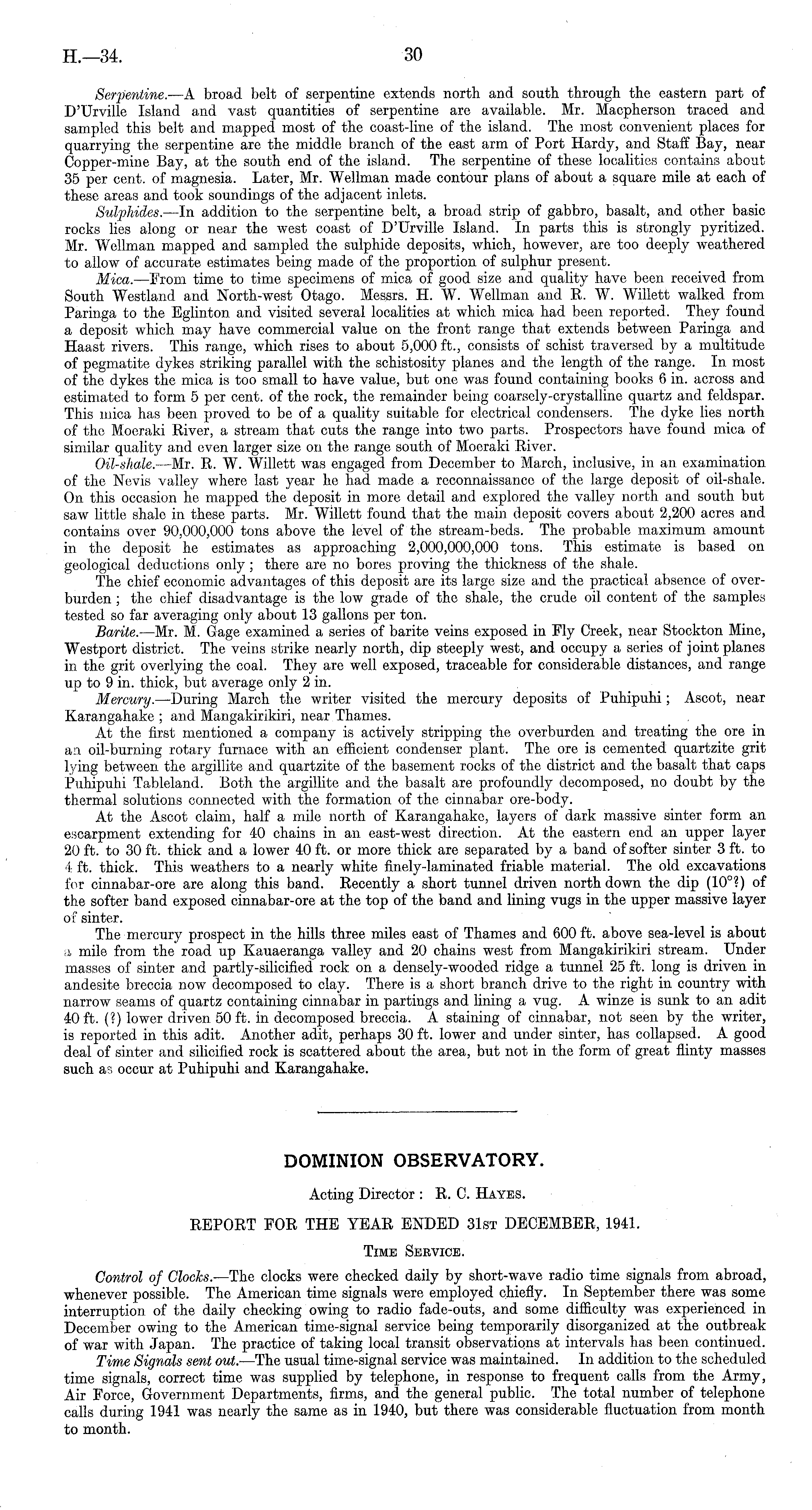 DOMINION OBSERVATORY. Acting Director : R. C. Hayes. REPORT FOR THE YEAR ENDED 31st DECEMBER, 1941. Time Service. Control of Clocks. —The clocks were checked daily by short-wave radio time signals from abroad, whenever possible. The American time signals were employed chiefly. In September there was some interruption of the daily checking owing to radio fade-outs, and some difficulty was experienced in December owing to the American time-signal service being temporarily disorganized at the outbreak of war with Japan. The practice of taking local transit observations at intervals has been continued. Time Signals sent out.—The usual time-signal service was maintained. In addition to the scheduled time signals, correct time was supplied by telephone, in response to frequent calls from the Army, Air Force, Government Departments, firms, and the general public. The total number of telephone calls during 1941 was nearly the same as in 1940, but there was considerable fluctuation from month to month.