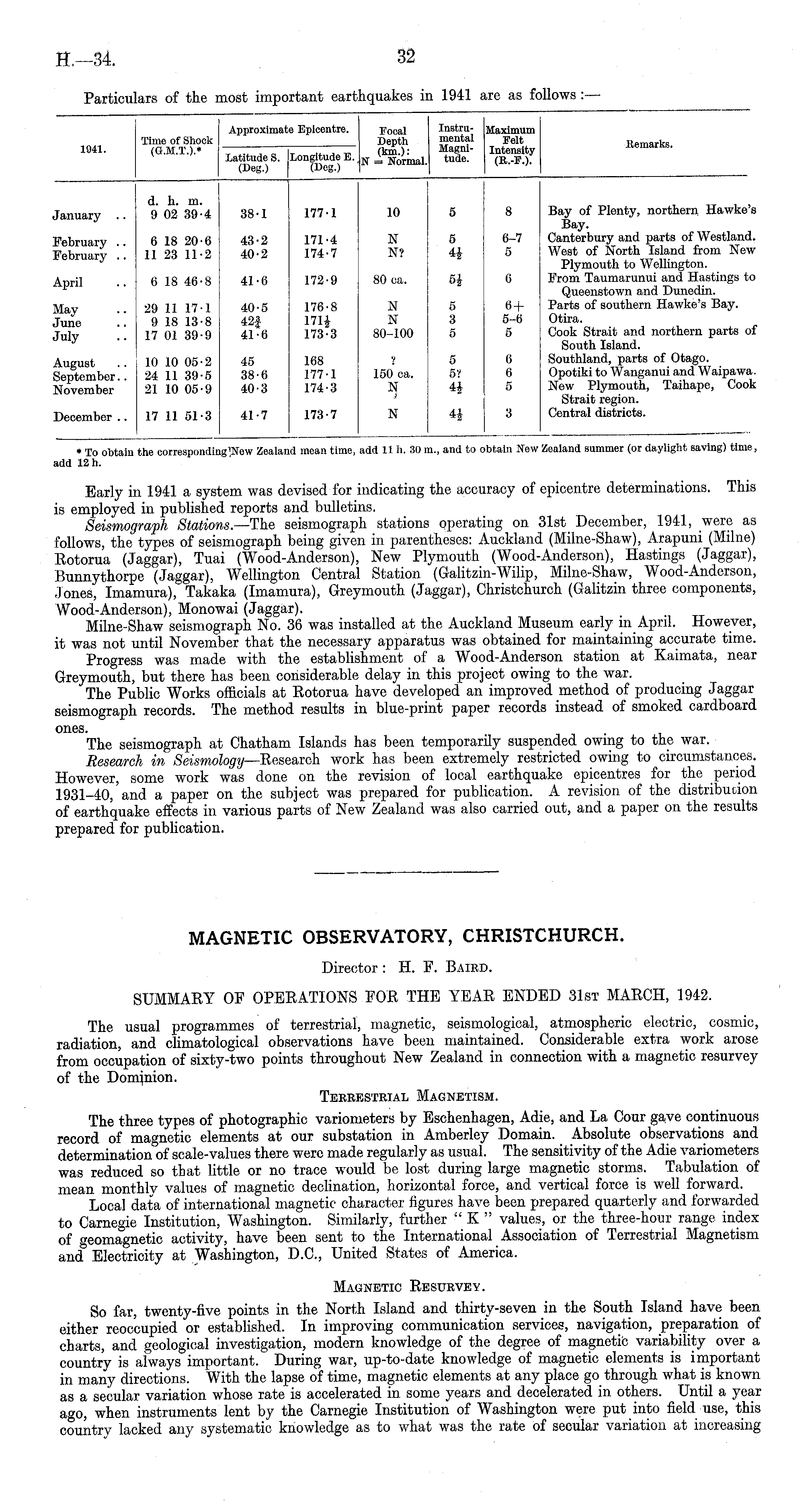 MAGNETIC OBSERVATORY, CHRISTCHURCH. Director : H. F. Baird. SUMMARY OF OPERATIONS FOR THE YEAR ENDED 31st MARCH, 1942. The usual programmes of terrestrial, magnetic, seismological, atmospheric electric, cosmic, radiation, and climatological observations have been maintained. Considerable extra work arose from occupation of sixty-two points throughout New Zealand in connection with a magnetic resurvey of the Dominion. Terrestrial Magnetism. The three types of photographic variometers by Eschenhagen, Adie, and La Cour ga,ve continuous record of magnetic elements at our substation in Amberley Domain. Absolute observations and determination of scale-values there were made regularly as usual. The sensitivity of the Adie variometers was reduced so that little or no trace would be lost during large magnetic storms. Tabulation of mean monthly values of magnetic declination, horizontal force, and vertical force is well forward. Local data of international magnetic character figures have been prepared quarterly and forwarded to Carnegie Institution, Washington. Similarly, further "K " values, or the three-hour range index of "eomagnetic activity, have been sent to the International Association of Terrestrial Magnetism and Electricity at Washington, D.C., United States of America. Magnetic Resurvey. So far, twenty-five points in the North Island and thirty-seven in the South Island have been either reoc'cupied or established. In improving communication services, navigation, preparation of charts, and geological investigation, modern knowledge of the degree of magnetib variability over a country is always important. During war, up-to-date knowledge of magnetic elements is important in many directions. With the lapse of time, magnetic elements at any place go through what is known as a secular variation whose rate is accelerated in some years and decelerated in others. Until a year ago, when instruments lent by the Carnegie Institution of Washington were put into field use, this country lacked any systematic knowledge as to what was the rate of secular variation at increasing