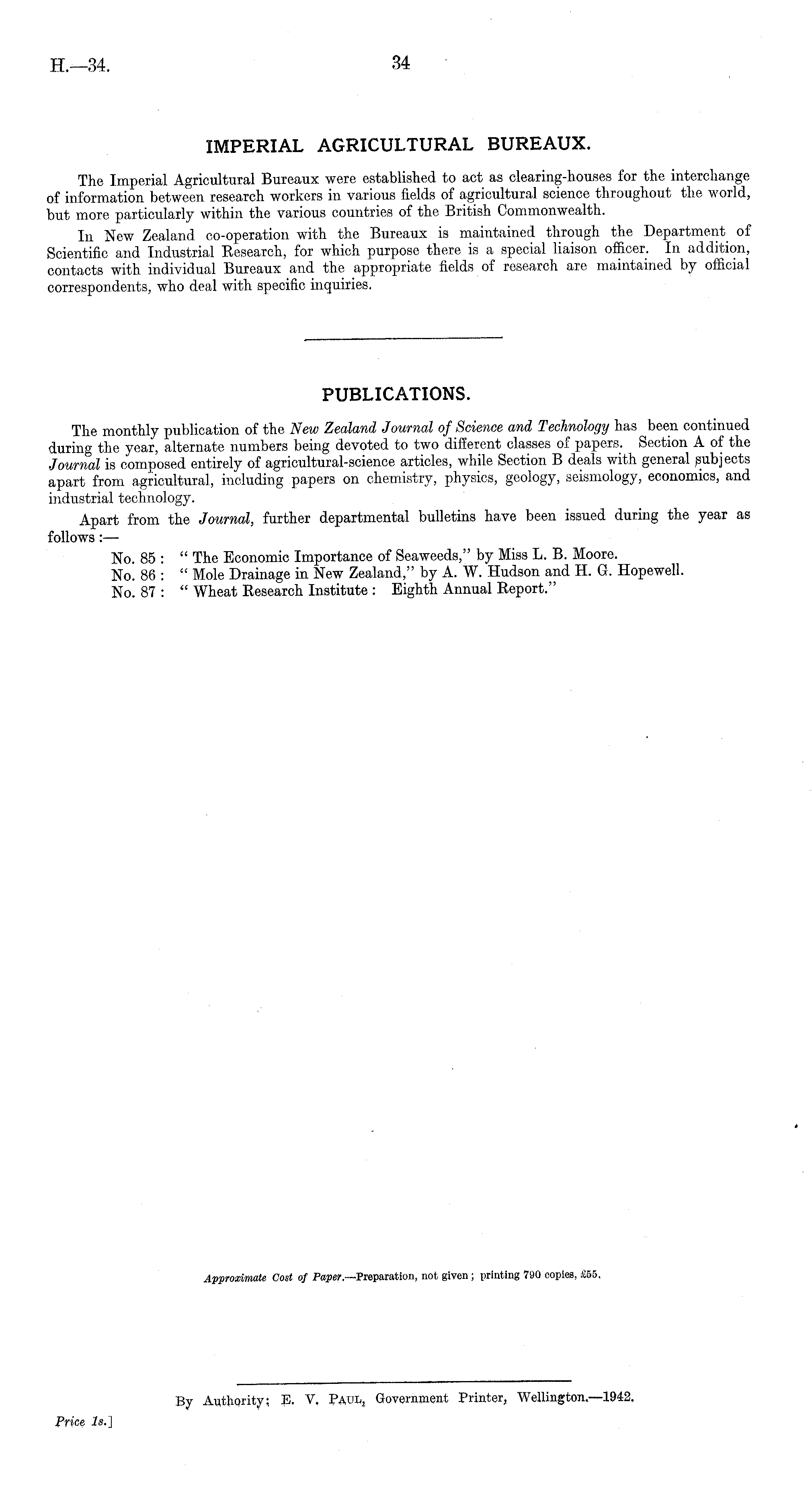 PUBLICATIONS. The monthly publication of the New Zealand Journal of Science and Technology has been continued during the year, alternate numbers being devoted to two different classes of papers. Section Aof the Journal is composed entirely of agricultural-science articles, while Section B deals with general apart from agricultural, including papers 011 chemistry, physics, geology, seismology, economics, and industrial technology. Apart from the Journal, further departmental bulletins have been issued during the year as follows: — No. 85 : " The Economic Importance of Seaweeds," by Miss L. B. Moore. No. 86 : " Mole Drainage in New Zealand," by A. W. Hudson and H. G. Hopewell. No. 87 : " Wheat Research Institute : Eighth Annual Report."