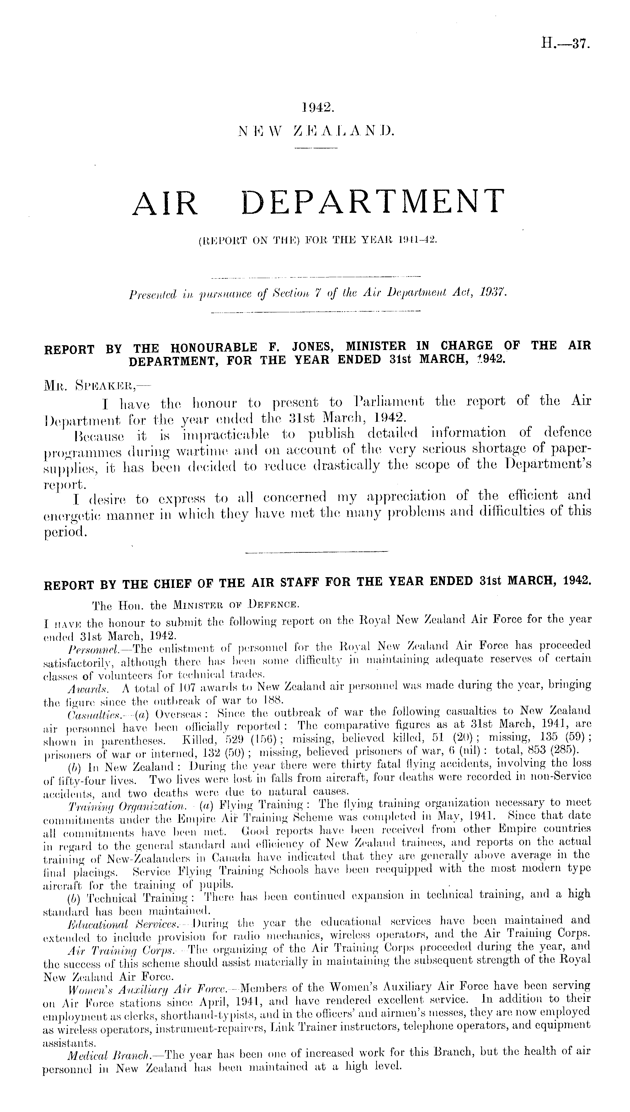 REPORT BY THE HONOURABLE F. JONES, MINISTER IN CHARGE OF THE AIR DEPARTMENT, FOR THE YEAR ENDED 31st MARCH, ?.942. Mr. Speaker, — I have the honour to present to Parliament the report of the Air Department for the year ended the 31st March, 1942. Because it is impracticable to publish detailed information of defence programmes during wartime and on account of the very serious shortage of papersupplies, it has been decided to reduce drastically the scope of the Department s report. . ■ , . ■ I desire to express to all concerned my appreciation of the efficient and energetic manner in which they have met the many problems and difficulties of this period. REPORT BY THE CHIEF OF THE AIR STAFF FOR THE YEAR ENDED 31st MARCH, 1942. The Hon. the Minister of Defence. I have the honour to submit the following report on the Royal New Zealand Air Force for the year ended 31st March, 1942. Personnel. —The enlistment of personnel for the Royal New Zealand Air Force has proceeded satisfactorily, although there has been some difficulty in maintaining adequate reserves of certain classes of volunteers for technical trades. Awards. - A total of 107 awards to New Zealand air personnel was made during the year, bringing the figure since the outbreak of war to 188. Casualties.—{a) Overseas : Since the outbreak of war the following casualties to New Zealand air personnel have been officially reported : The comparative figures as at 31st March, 1941, are shown in parentheses. Killed, 529 (156); missing, believed killed, 51 (20) ; missing, 135 (59); prisoners of war or interned, 132 (50) ; missing, believed prisoners of war, 6 (ml): total, 853 (285). (b) In New Zealand : During the year there were thirty fatal flying accidents, involving the loss of fifty-four lives. Two lives were lost in falls from aircraft, four deaths were recorded in non-Service accidents, and two deaths were due to natural causes. Training Organization.—(a) Flying Training : The flying training organization necessary to meet commitments under the Empire Air Training Scheme was completed in May, 1941. Since that date all commitments have been met. Good reports have been received from other Empire countries in regard to the general standard and efficiency of New Zealand trainees, and reports on the actual training of New-Zealandcrs in Canada have indicated that they are generally above average in the final placihgs. Service Flying Training Schools have been reequipped with the most modern type aircraft for the training of pupils. _ _ . (b) Technical Training : There has been continued expansion in technical training, and a high standard has been maintained. . , , Educational Services.—During the year the educational services have been maintained and extended to include provision for radio mechanics, wireless operators, and the Air Training Corps. Air Training Corps.—The organizing of the Air Training Corps proceeded during the year, and the success of this scheme should assist materially in maintaining the subsequent strength of the Royal New Zealand Air Force. , _ Women's Auxiliary A.ir Force. —Members of the Women s Auxiliary Air Force have been serving on Air Force stations since April, 1941, and have rendered excellent service. In addition to their employment as clerks, shorthand-typists, and in the officers and airmen s messes, they are now employed as wireless operators, instrument-repairers, Link Trainer instructors, telephone operators, and equipment assistants Medical Branch. —The year has been one of increased work for this Branch, but the health of air personnel in New Zealand has been maintained at a high level.