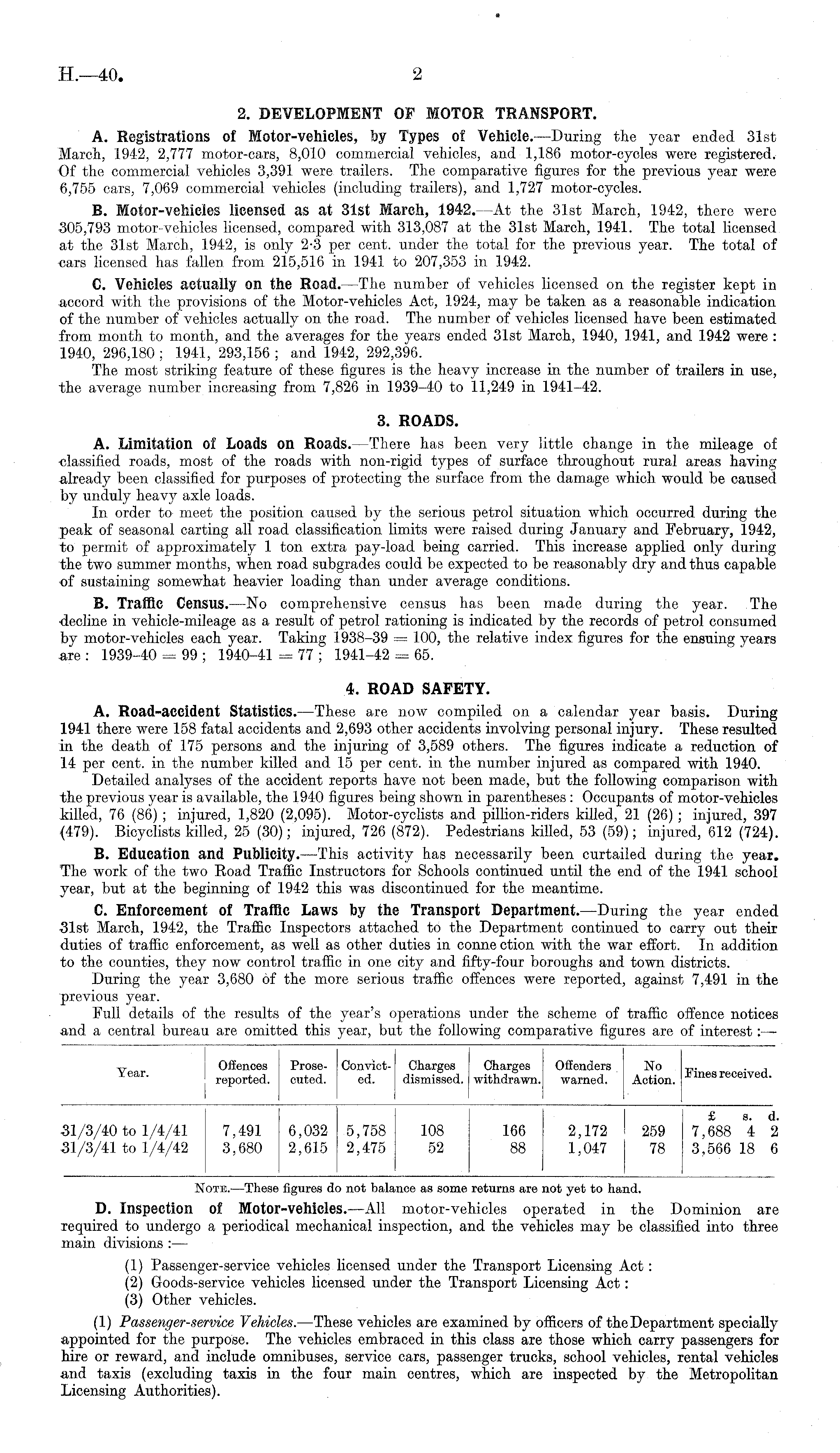 2. DEVELOPMENT OF MOTOR TRANSPORT. A. Registrations of Motor-vehicles, by Types of Vehicle. —During the year ended 31st March, 1942, 2,777 motor-cars, 8,010 commercial vehicles, and 1,186 motor-cycles were registered. Of the commercial vehicles 3,391 were trailers. The comparative figures for the previous year were 6,755 cars, 7,069 commercial vehicles (including trailers), and 1,727 motor-cycles. B. Motor-vehicles licensed as at 31st March, 1942. —At the 31st March, 1942, there were 305,793 motor-vehicles licensed, compared with 313,087 at the 31st March, 1941. The total licensed at the 31st March, 1942, is only 2-3 per cent, under the total for the previous year. The total of •cars licensed has fallen from 215,516 in 1941 to 207,353 in 1942. C. Vehicles actually on the Road. —The number of vehicles licensed on the register kept in accord with the provisions of the Motor-vehicles Act, 1924, may be taken as a reasonable indication of the number of vehicles actually on the road. The number of vehicles licensed have been estimated from month to month, and the averages for the years ended 31st March, 1940, 1941, and 1942 were : 1940, 296,180 ; 1941, 293,156 ; and 1942, 292,396. The most striking feature of these figures is the heavy increase in the number of trailers in use, the average number increasing from 7,826 in 1939-40 to 11,249 in 1941-42. 3. ROADS. A. Limitation of Loads on Roads. —There has been very little change in the mileage of classified roads, most of the roads with non-rigid types of surface throughout rural areas having already been classified for purposes of protecting the surface from the damage which would be caused by unduly heavy axle loads. In order to meet the position caused by the serious petrol situation which occurred during the peak of seasonal carting all road classification limits were raised during January and February, 1942, to permit of approximately 1 ton extra pay-load being carried. This increase applied only during the two summer months, when road subgrades could be expected to be reasonably dry and thus capable of sustaining somewhat heavier loading than under average conditions. B. Traffic Census.—No comprehensive census has been made during the year. The decline in vehicle-mileage as a result of petrol rationing is indicated by the records of petrol consumed by motor-vehicles each year. Taking 1938-39 = 100, the relative index figures for the ensuing years are : 1939-40 = 99 ; 1940-41 =77 ; 1941-42 = 65. 4. ROAD SAFETY. A. Road-accident Statistics. —These are now compiled on a calendar year basis. During 1941 there were 158 fatal accidents and 2,693 other accidents involving personal injury. These resulted in the death of 175 persons and the injuring of 3,589 others. The figures indicate a reduction of 14 per cent, in the number killed and 15 per cent, in the number injured as compared with 1940. Detailed analyses of the accident reports have not been made, but the following comparison with the previous year is available, the 1940 figures being shown in parentheses : Occupants of motor-vehicles killed, 76 (86); injured, 1,820 (2,095). Motor-cyclists and pillion-riders killed, 21 (26); injured, 397 {479). Bicyclists killed, 25 (30); injured, 726 (872). Pedestrians killed, 53 (59); injured, 612 (724). B. Education and Publicity.—This activity has necessarily been curtailed during the year. The work of the two Road Traffic Instructors for Schools continued until the end of the 1941 school year, but at the beginning of 1942 this was discontinued for the meantime. C. Enforcement of Traffic Laws by the Transport Department.—During the year ended 31st March, 1942, the Traffic Inspectors attached to the Department continued to carry out their duties of traffic enforcement, as well as other duties in connection with the war effort. In addition to the counties, they now control traffic in one city and fifty-four boroughs and town districts. During the year 3,680 of the more serious traffic offences were reported, against 7,491 in the previous year.