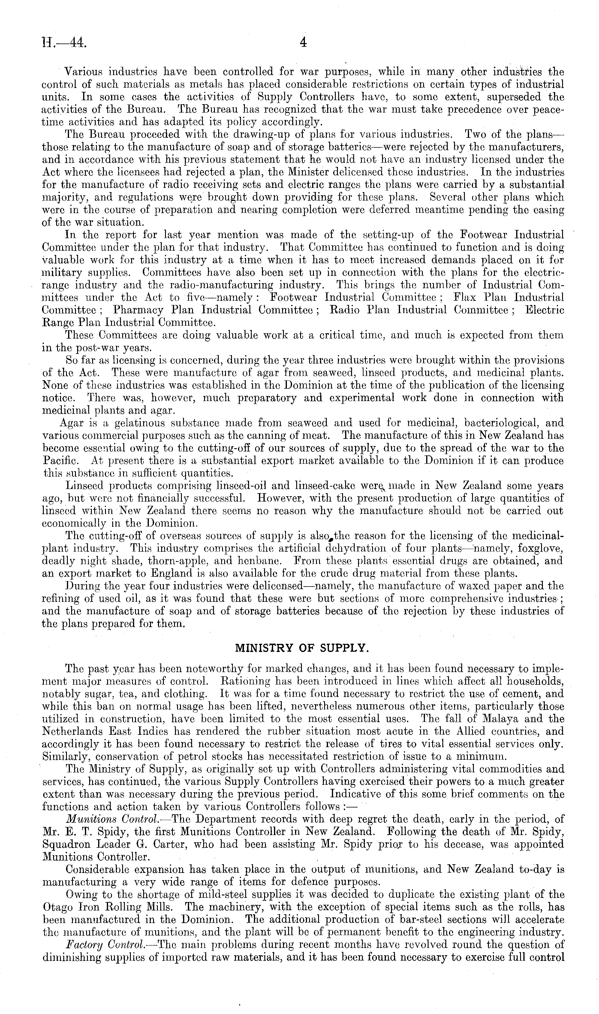 Various industries have been controlled for war purposes, while in many other industries the control of such materials as metals has placed considerable restrictions on certain types of industrial units. In some cases the activities of Supply Controllers have, to some extent, superseded the activities of the Bureau. The Bureau has recognized that the war must take precedence over peacetime activities and has adapted its policy accordingly. The Bureau proceeded with the drawing-up of plans for various industries. Two of the plans — those relating to the manufacture of soap and of storage batteries —were rejected by the manufacturers, and in accordance with his previous statement that he would not have an industry licensed under the Act where the licensees had rejected a plan, the Minister delicensed these industries. In the industries for the manufacture of radio receiving sets and electric ranges the plans were carried by a substantial majority, and regulations were brought down providing for these plans. Several other plans which were in the course of preparation and nearing completion were deferred meantime pending the easing of the war situation. In the report for last year mention was made of the setting-up of the Footwear Industrial Committee under the plan for that industry. That Committee has continued to function and is doing valuable work for this industry at a time when it has to meet increased demands placed on it for military supplies. Committees have also been set up in connection with the plans for the electricrange industry and the radio-manufacturing industry. This brings the number of Industrial Committees under the Act to five —namely : Footwear Industrial Committee ; Flax Plan Industrial Committee : Pharmacy Plan Industrial Committee ; Radio Plan Industrial Committee ; Electric Range Plan Industrial Committee. These Committees are doing valuable work at a critical time, and much is expected from them in the post-war years. So far as licensing is concerned, during the year three industries were brought within the provisions of the Act. These were manufacture of agar from seaweed, linseed products, and medicinal plants. None of these industries was established in the Dominion at the time of the publication of the licensing notice. There was, however, much preparatory and experimental work done in connection with medicinal plants and agar. Agar is a gelatinous substance made from seaweed and used for medicinal, bacteriological, and various commercial purposes such as the canning of meat. The manufacture of this in New Zealand has become essential owing to the cutting-oil of our sources of supply, due to the spread of the war to the Pacific. At present there is a substantial export market available to the Dominion if it can produce this substance in sufficient quantities. Linseed products comprising linseed-oil and linseed-cake were made in New Zealand some years ago, but were not financially successful. However, with the present production of large quantities of linseed within New Zealand there seems no reason why the manufacture should not be carried out economically in the Dominion. The cutting-off of overseas sources of supply is also # the reason for the licensing of the medicinalplant industry. This industry comprises the artificial dehydration of four plants—namely, foxglove, deadly night shade, thorn-apple, and henbane. From these plants essential drugs are obtained, and an export market to England is also available for the crude drug material from these plants. During the year four industries were delicensed —namely, the manufacture of waxed paper and the refining of used oil, as it was found that these were but sections of more comprehensive industries-; and the manufacture of soap and of storage batteries because of the rejection by these industries of the plans prepared for them. MINISTRY OF SUPPLY. The past year has been noteworthy for marked changes, and it has been found necessary to implement major measures of control. Rationing has been introduced in lines which affect all households, notably sugar, tea, and clothing. It was for a time found necessary to restrict the use of cement, and while this ban on normal usage has been lifted, nevertheless numerous other items, particularly those utilized in construction, have been limited to the most essential uses. The fall of Malaya and the Netherlands East Indies has rendered the rubber situation most acute in the Allied countries, and accordingly it has been found necessary to restrict the release of tires to vital essential services only. Similarly, conservation of petrol stocks has necessitated restriction of issue to a minimum. The Ministry of Supply, as originally set up with Controllers administering vital commodities and services, has continued, the various Supply Controllers having exercised their powers to a much greater extent than was necessary during the previous period. Indicative of this some brief comments on the functions and action taken by various Controllers follows : — Munitions Control.—The Department records with deep regret the death, early in the period, of Mr. E. T. Spidy, the first Munitions Controller in New Zealand. Following the death of Mr. Spidy, Squadron Leader G. Carter, who had been assisting Mr. Spidy prior to his decease, was appointed Munitions Controller. Considerable expansion has taken place in the output of munitions, and New Zealand to-day is manufacturing a very wide range of items for defence purposes. Owing to the shortage of mild-steel supplies it was decided to duplicate the existing plant of the Otago Iron Rolling Mills. The machinery, with the exception of special items such as the rolls, has been manufactured in the Dominion. The additional production of bar-steel sections will accelerate the manufacture of munitions, and the plant will be of permanent benefit to the engineering industry. Factory Control. —The main problems during recent months hav