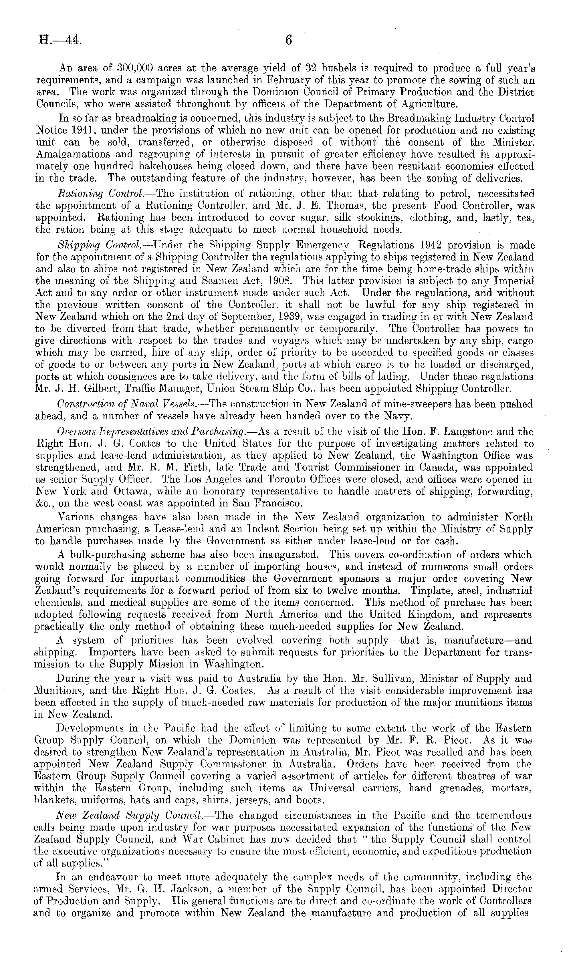 An area of 300,000 acres at the average yield of 32 bushels is required to produce a full year's requirements, and a campaign was launched in February of this year to promote the sowing of such an area. The work was organized through the Dominion Council of Primary Production and the District Councils, who were assisted throughout by officers of the Department of Agriculture. In so far as broad making is concerned, this industry is subject to the Bread making Industry Control Notice 1941, under the provisions of which no new unit can be opened for production and no existing unit can be sold, transferred, or otherwise disposed of without the consent of the Minister. Amalgamations and regrouping of interests in pursuit of greater efficiency have resulted in approximately one hundred bakehouses being closed down, and there have been resultant economies effected in the trade. The outstanding feature of the industry, however, has been the zoning of deliveries. Rationing Control. —The institution of rationing, other than that relating to petrol, necessitated the appointment of a Rationing Controller, and Mr. J. E. Thomas, the present Food Controller, was appointed. Rationing has been introduced to cover sugar, silk stockings, clothing, and, lastly, tea, the ration being at this stage adequate to meet normal household needs. Shipping Control. —Under the Shipping Supply Emergency Regulations 1942 provision is made for the appointment of a Shipping Controller the regulations applying to ships registered in New Zealand and also to ships not registered in New Zealand which are for the time being home-trade ships within the meaning of the Shipping and Seamen Act, 1908. This latter provision is subject to any Imperial Act and to any order or other instrument made under such Act. Under the regulations, and without the previous written consent of the Controller, it shall not be lawful for any ship registered in New Zealand which on the 2nd day of September, 1939. was engaged in trading in or with New Zealand to be diverted from that trade, whether permanently or temporarily. The Controller has powers to give directions with respect to the trades and voyages which may be undertaken by any ship, cargo which may be carried, hire of any ship, order of priority to be accorded to specified goods or classes of goods to or between any ports in New Zealand, ports at which cargo is to be loaded or discharged, ports at which consignees are to take delivery, and the form of bills of laditig. Under these regulations Mr. J. IT. Gilbert, Traffic Manager, Union Steam Ship Co., has been appointed Shipping Controller. Construction of Naval Vessels.—The construction in New Zealand of mine-sweepers has been pushed ahead, and a number of vessels have already been handed over to the Navy. Overseas Representatives and Purchasing.—As a result of the visit of the Hon. F. Langstonc and the Right Hon. J. G. Coates to the United States for the purpose of investigating matters related to supplies and lease-lend administration, as they applied to New Zealand, the Washington Office was strengthened, and Mr. R. M. Firth, late Trade and Tourist Commissioner in Canada, was appointed as senior Supply Officer. The Los Angeles and Toronto Offices were closed, and offices were opened in New York and Ottawa., while an honorary representative to handle matters of shipping, forwarding, &c., on the west coast was appointed in San Francisco. Various changes have also been made in the New Zealand organization to administer North American purchasing, a Lease-lend and an Indent Section being set up within the Ministry of Supply to handle purchases made by the Government as either under lease-lend, or for cash. A bulk-purchasing scheme has also been inaugurated. This covers co-ordination of orders which would normally be placed by a number of importing houses, and instead of numerous small orders going forward for important commodities the Government sponsors a major order covering New Zealand's requirements for a forward period of from six to twelve months. Tinplate, steel, industrial chemicals, and medical supplies are some of the items concerned. This method of purchase has been adopted following requests received from North America and the United Kingdom, and represents practically the only method of obtaining these much-needed supplies for New Zealand. A system of priorities has been evolved covering both supply —that is, manufacture—and shipping. Importers have been asked to submit requests for priorities to the Department for transmission to the Supply Mission in Washington. During the year a visit was paid to Australia by the Hon. Mr. Sullivan, Minister of Supply and Munitions, and the Right Hon. J. G. Coates. As a result of the visit considerable improvement has been effected in the supply of much-needed raw materials for production of the major munitions items in New Zealand. Developments in the Pacific had the effect of limiting to some extent the work of the Eastern Group Supply Council, on which the Dominion was represented by Mr. F. R. Picot. As it was desired to strengthen New Zealand's representation in Australia, Mr. Picot was recalled and has been appointed New Zealand Supply Commissioner in Australia. Orders have been received from the Eastern Group Supply Council covering a varied assortment of articles for different theatres of war within the Eastern Group, including such items as Universal carriers, hand grenades, mortars, blankets, uniforms, hats and caps, shirts, jerseys, and boots. New Zealand Supply Council.—The changed circumstances in the Pacific and the tremendous calls being made upon industry for war purposes necessitated expansion of the functions of the New Zealand Supply Council, and War Cabinet has now decided that " the Supply Council shall control the executive organizations necessary to ensure the most efficient, economic, and expeditious production of all supplies." In an endeavour to meet more a
