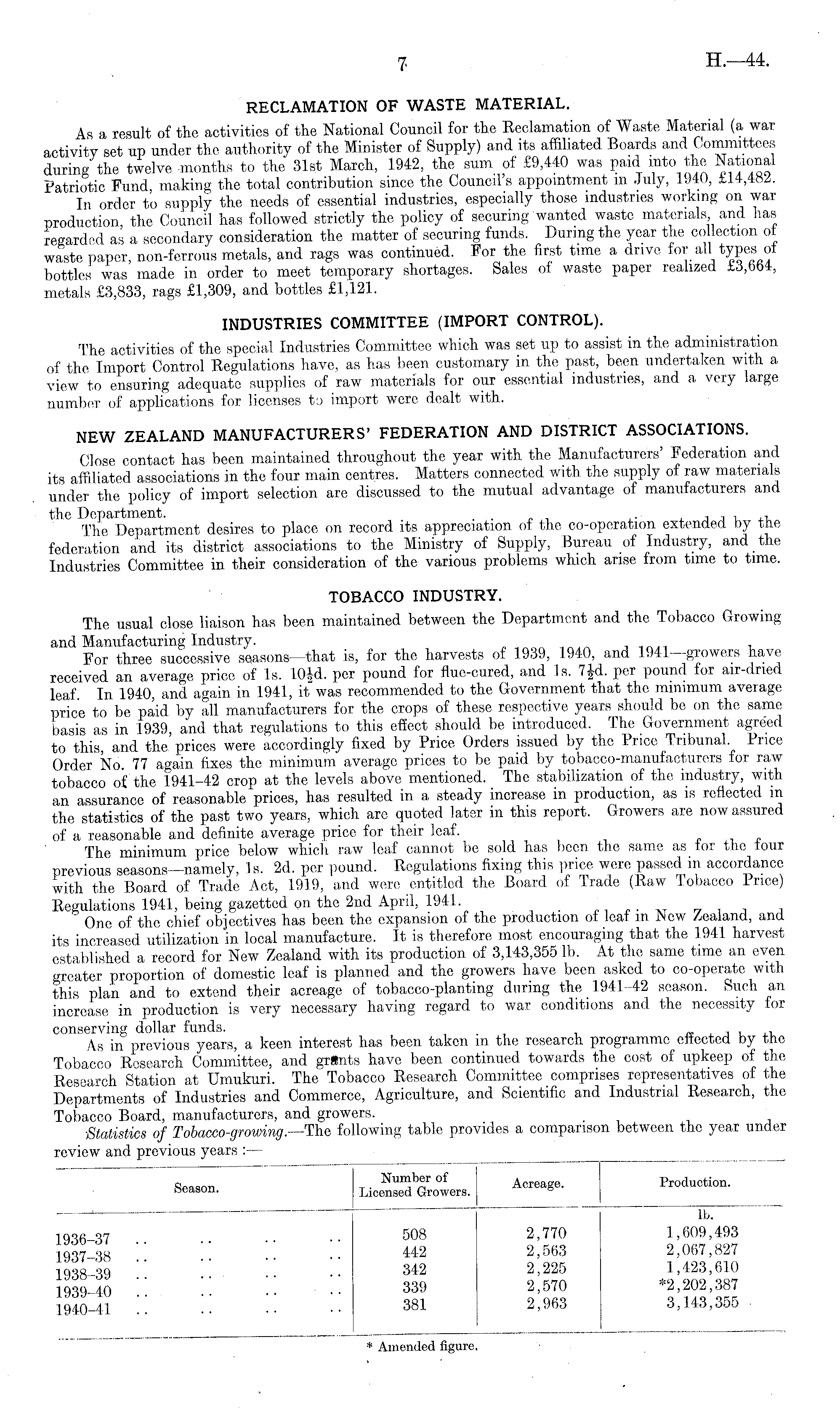 RECLAMATION OF WASTE MATERIAL. As a result of the activities of the National Council for the Reclamation of Waste Material (a war activity set up under the authority of the Minister of Supply) and its affiliated Boards and Committees during the twelve months to the 31st March, 1942, the sum of £9,440 was paid into the National Patriotic Fund making the total contribution since the Council s appointment m July, 1940, £14,48^. In order to supply the needs of essential industries, especially those industries working on war production the Council has followed strictly the policy of securing wanted waste materials and has regarded as a secondary consideration the matter of securing funds. During the year the co lection of waste paper, non-ferrous metals, and rags was continued. For the first time a drive for all types of bottles was made in order to meet temporary shortages. Sales of waste paper realized £3,664, metals £3,833, rags £1,309, and bottles £1,121. INDUSTRIES COMMITTEE (IMPORT CONTROL). The activities of the special Industries Committee which was set up to assist in the administration of the Import Control Regulations have, as has been customary in the past, been undertaken with a view to ensuring adequate supplies of raw materials for our essential industries, and a very large number of applications for licenses to import were dealt with. NEW ZEALAND MANUFACTURERS' FEDERATION AND DISTRICT ASSOCIATIONS. Close contact has been maintained throughout the year with the Manufacturers' Federation and its affiliated associations in the four main centres. Matters connected with the supply of raw materials under the policy of import selection are discussed to the mutual advantage of manufacturers and the Department. . . , , , The Department desires to place on record its appreciation of the co-operation extended by the federation and its district associations to the Ministry of Supply, Bureau of Industry, and the Industries Committee in their consideration of the various problems which arise from time to time. TOBACCO INDUSTRY. The usual close liaison has been maintained between the Department and the Tobacco Growing and Manufacturing Industry. For three successive seasons—that is, for the harvests of 1939, 1940, and 1941—growers have received an average price of Is. 10id. per pound for flue-cured, and Is. 7|d. per pound for air-dried leaf In 1940, and again in 1941, it was recommended to the Government that the minimum average price to be paid by all manufacturers for the crops of these respective years should be on the same basis as in 1939, and that regulations to this effect should be introduced. The Government agreed to this, and the prices were accordingly fixed by Price Orders issued by the Price Tribunal. Price Order No. 77 again fixes the minimum average prices to be paid by tobacco-manufacturers for raw tobacco of the 1941-42 crop at the levels above mentioned. The stabilization of the industry, with an assurance of reasonable prices, has resulted in a steady increase in production, as is reflected m the statistics of the past two years, which arc quoted later in this report. Growers are now assured of a reasonable and definite average price for their leaf. The minimum price below which raw leaf cannot be sold has been the same as ror the tour previous seasons—namely, Is. 2d. per pound. Regulations fixing this price were passed in accordance with the Board of Trade Act, 1919, and were entitled the Board of Trade (Raw Tobacco Price) Regulations 1941, being gazetted on the 2nd April, 1941 _ One of the chief objectives has been the expansion of the production of leaf m New Zealand, and its increased utilization in local manufacture. It is therefore most encouraging that the 1941 harvest established a record for New Zealand with its production of 3,143,355 IV). At the same time an even greater proportion of domestic leaf is planned and the growers have been asked to co-operate with this plan and to extend their acreage of tobacco-planting during the 1941-42 season. Such an increase in production is very necessary having regard to war conditions and the necessity for conserving dollar funds. As in previous years, a keen interest has been taken m the research programme effected by the Tobacco Research Committee, and gr«nts have been continued towards the cost of upkeep of the Research Station at Umukuri. The Tobacco Research Committee comprises representatives of the Departments of Industries and Commerce, Agriculture, and Scientific and Industrial Research, the Tobacco Board, manufacturers, and growers. _ _