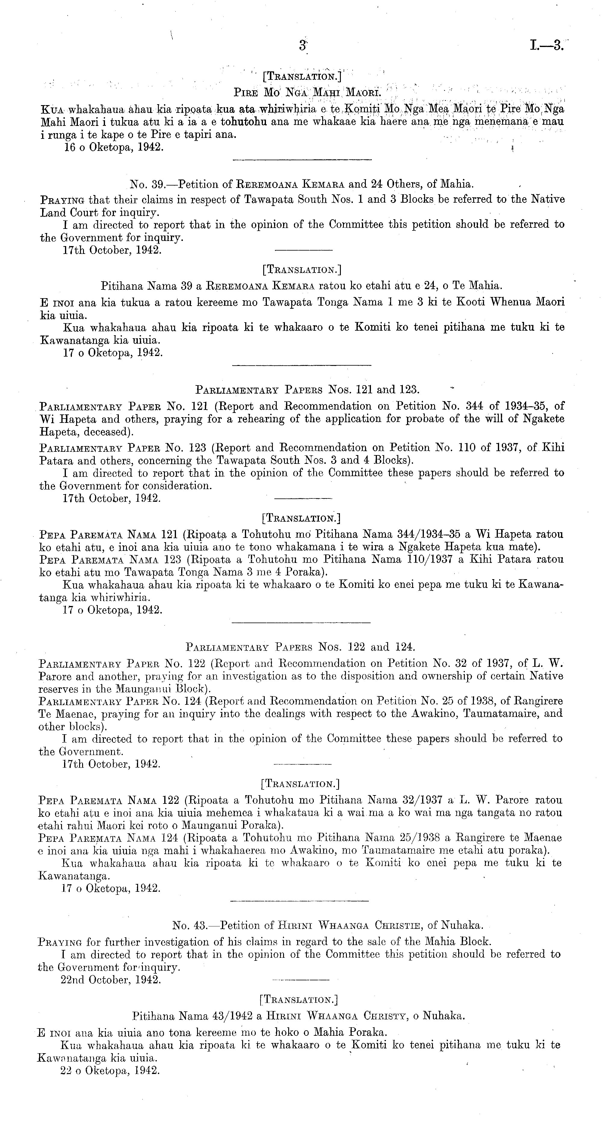17th October, 1942. [Translation.] Pepa Paremata Nama 121 (Ripoata a Tohutohu mo Pitihana Nama 344/1934—35 a Wi Hapeta ratou ko etahi atu, e inoi ana kia uiuia ano te tono whakamana i te wira a Ngakete Hapeta kua mate). Pepa Paremata Nama 123 (Ripoata a Tohutohu mo Pitihana Nama 110/1937 a Kihi Patara ratou ko etahi atu mo Tawapata Tonga Nama 3 me 4 Poraka). Kua whakahaua ahau kia ripoata kite whakaaro o te Komiti ko enei pepa me tuku kite Kawanatanga kia whiriwhiria. 17 o Oketopa, 1942.