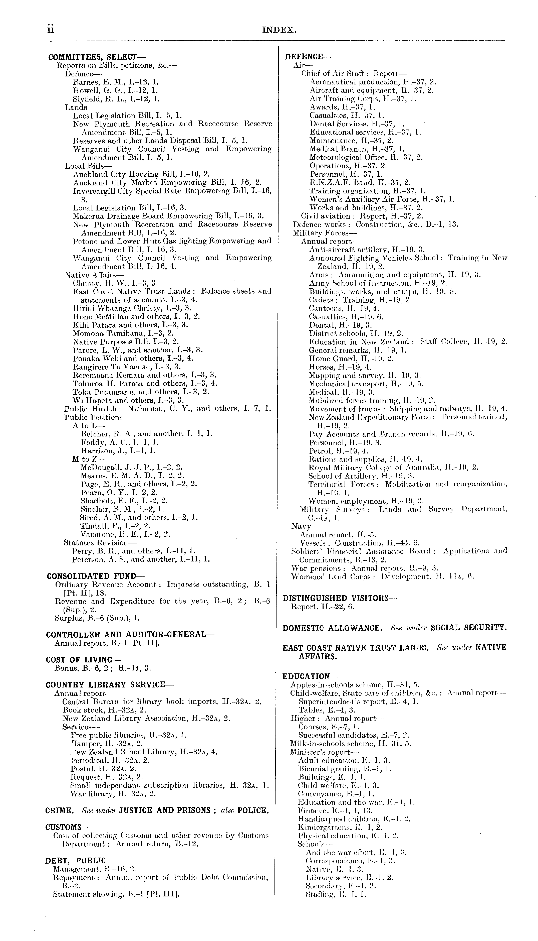 COMMITTEES, SELECT— Reports on Bills, petitions, &c. — Defence— Barnes, E. M„ 1.-12, 1. Howell, G. G„ 1.—12, 1. Slyfield, R. L., 1.-12, 1. Lands — Local Legislation Bill, 1.-5, 1. New Plymouth Recreation and Racecourse Reserve Amendment Bill, 1.-5, 1. Reserves and other Lands Disposal Bill, 1.-5, 1. Wanganui City Council Vesting and Empowering Amendment Bill, 1.-5, 1. Local Bills— Auckland City Housing Bill, 1.-16, 2. Auckland City Market Empowering Bill, 1.-16, 2. Invercargill City Special Rate Empowering Bill, 1.-16, 3. Local Legislation Bill, 1.—16, 3. Makerua Drainage Board Empowering Bill, 1.-16, 3. New Plymouth Recreation and Racecourse Reserve Amendment Bill, 1.—16, 2. Petone and Lower Hutt Gas-ligliting Empowering and Amendment Bill, 1.-16, 3. Wanganui City Council Vesting and Empowering Amendment Bill, 1.—16, 4. Native Affairs— Christy, H. W„ 1.-3, 3. East Coast Native Trust Lands : Balance-sheets and statements of accounts, 1.-3, 4. Hirini Whaanga Christy, 1.-3, 3. Hone McMillan and others, 1.-3, 2. Kihi Patara and others, 1.-3, 3. Momona Tamihana, 1.-3, 2. Native Purposes Bill, 1.-3, 2. Parore, L. W., and another, 1.-3, 3. Pouaka Wehi and others, 1.-3, 4. Rangirero Te Maenae, 1.-3, 3. Reremoana Kemara and others, 1.-3, 3. Tohuroa H. Parata and others, 1.-3, 4. Toka Potangaroa and others, 1.-3, 2. Wi Hapeta and others, 1.-3, 3. Public Health: Nicholson, C. Y., and others, 1.-7, 1. Public Petitions — A to L — Belcher, R. A., and another, 1.-l, 1. Foddy, A. C., 1.-l, 1. Harrison, J., 1.-l, 1. M to Z— McDougall, J. J. P., 1.-2, 2. Meares, E. M. A. D„ 1.-2, 2. Page, E. R., and others, 1.-2, 2. Pearn, 0. Y., 1.-2, 2. Shadbolt, E. F., 1.-2, 2. Sinclair, B. M., 1.-2, 1. Sired, A. M., and others, 1.-2, 1. Tindall, F., 1.-2, 2. Vanstone, H. E„ 1.-2, 2. Statutes Revision— Perry, B. R., and others, 1.-11, 1. Peterson, A. S., and another, 1.-11, 1. CONSOLIDATED FUND— Ordinary Revenue Account: Imprests outstanding, 8.-l [Pt. ll], 18. Revenue and Expenditure for the year, 8.-6, 2 ; 8.-6 (Sup.), 2. Surplus, 8.-6 (Sup.), 1. CONTROLLER AND AUDITOR-GENERAL— Annual report, 8.-l [Pt. ll], COST OF LIVING— Bonus, 8.-6, 2 ; H.-14, 3. COUNTRY LIBRARY SERVICE— Annual report — Central Bureau for library book imports, H.-32a, 2. Book stock, H.-32a, 2. New Zealand Library Association, H.-32a, 2. Services — Free public libraries, H.-32a, 1. "Tamper, H.~32a, 2. . 'ew Zealand School Library, H.-32a, 4. periodical, H.-32a, 2. Postal, H.-32a, 2. Request, H.-32a, 2. Small independant subscription libraries, H.-32a, I. War library, H.-32a, 2. CRIME. See under JUSTICE AND PRISONS ; also POLICE. CUSTOMSCost of collecting Customs and other revenue by Customs Department: Annual return, 8.-12. DEBT, PUBLIC— Management, 8.-16, 2. Repayment: Annual report of Public Debt Commission, 8.-2. Statement showing, 8.-l [Pt. lII].