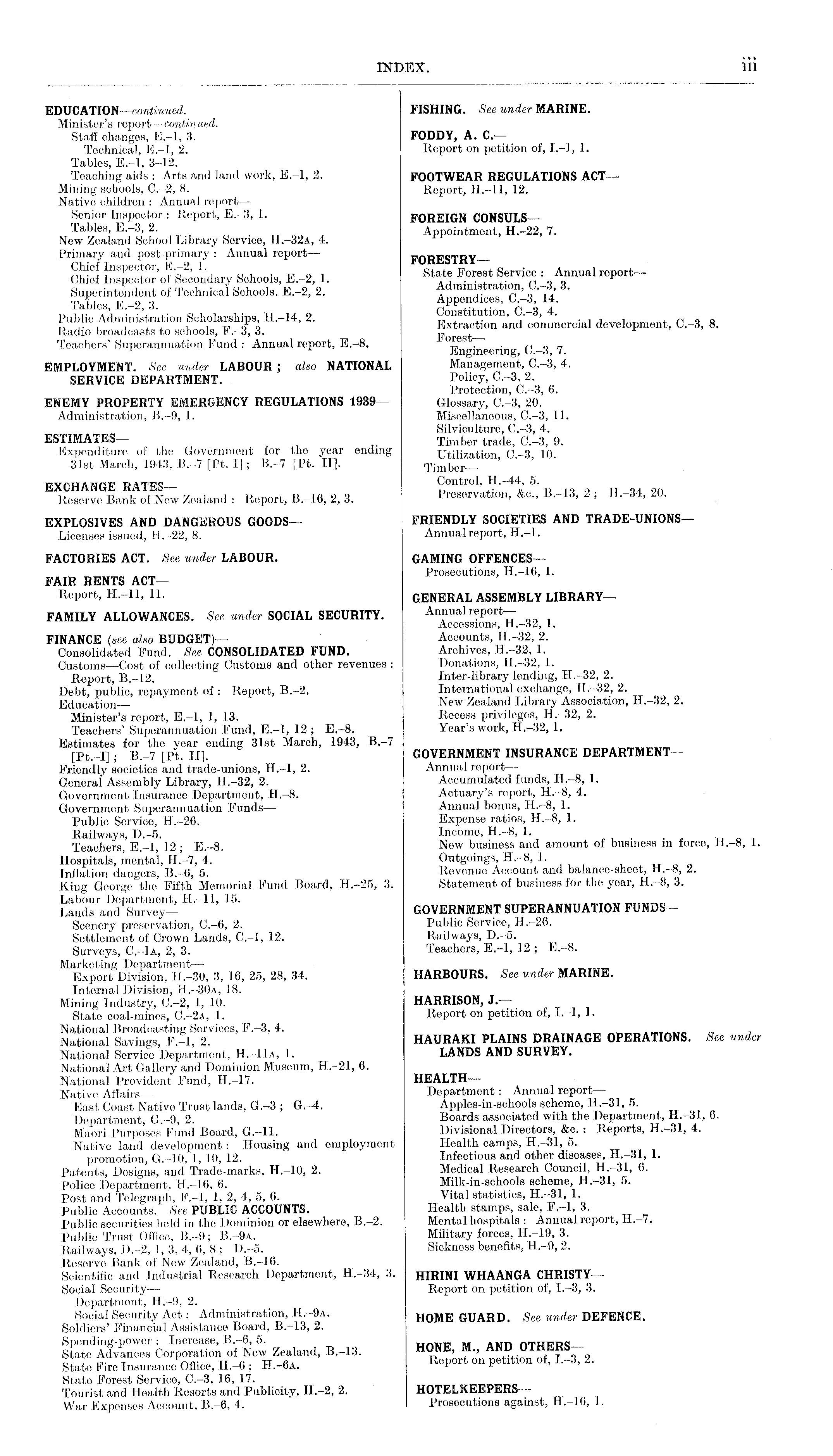 FISHING. See under MARINE. FODDY, A. C — Report on petition of, 1.-I, 1. FOOTWEAR REGULATIONS ACT— Report, H.-11, 12. FOREIGN CONSULS— Appointmont, H.-22, 7. FORESTRY— State Forest Service : Annual report — Administration, C.-3, 3. Appendices, C.-3, 14. Constitution, C.-3, 4. Extraction and commercial development, C.-3, 8. Forest— Engineering, C.-3, 7. Management, C.-3, 4. Policy, C.-3, 2. Protection, C.-3, 6. Glossary, C.-3, 20. Miscellaneous, C.-3, 11. Silviculture, C.-3, 4. Timber trade, C.-3, 9. Utilization, C.-3, 10. Timber —■ Control, H.-44, 5. Preservation, &c., 8.-13, 2 ; H.-34, 20. FRIENDLY SOCIETIES AND TRADE-UNIONS— Annual report, H.-l. GAMING OFFENCES— Prosecutions, H.-16, 1. GENERAL ASSEMBLY LIBRARY— Annual report — Accessions, H.-32, 1. Accounts, H.-32, 2. Archives, H.-32, 1. Donations, H.-32, 1. Inter-library lending, H.-32, 2. International exchange, H.-32, 2. New Zealand Library Association, H.-32, 2. Recess privileges, H.-32, 2. Year's work, H.-32, 1. GOVERNMENT INSURANCE DEPARTMENT— Annual report — Accumulated funds, H.-8, 1. Actuary's report, H.-8, 4. Annual bonus, H.-8, 1. Expense ratios, H.-8, 1. Income, H.-8, 1. New business and amount of business in force, H.-8, 1. Outgoings, H.-8, 1. Revenue Account and balance-sheet, H.-8, 2. Statement of business for the year, H.-8, 3. GOVERNMENT SUPERANNUATION FUNDS— Public Service, H.-26. Railways, D.-5. Teachers, E.-l, 12 ; E.-8. HARBOURS. See under MARINE. HARRISON, J.— Report on petition of, 1.-l, 1. HAURAKI PLAINS DRAINAGE OPERATIONS. See under LANDS AND SURVEY. HEALTH— Department: Annual report— Apples-in-schools scheme, H.-31, 5. Boards associated with the Department, H.-31, 6. Divisional Directors, &c. : Reports, H.-31, 4. Health camps, H.-31, 5. Infectious and other diseases, H.-31, 1. Medical Research Council, H.-31, 6. Milk-in-schools scheme, H.-31, 5. Vital statistics, H.-31, 1. Health stamps, sale, F.-l, 3. Mental hospitals : Annual report, H.-7. Military forces, H.-19, 3. Sickness benefits, H.-9, 2. HIRINI WHAANGA CHRISTY— Report on petition of, 1.-3, 3. HOME GUARD. See under DEFENCE. HONE, M., AND OTHERS— Report on petition of, 1.-3, 2. HOTELKEEPERSProsecutions against, H.-16, 1.