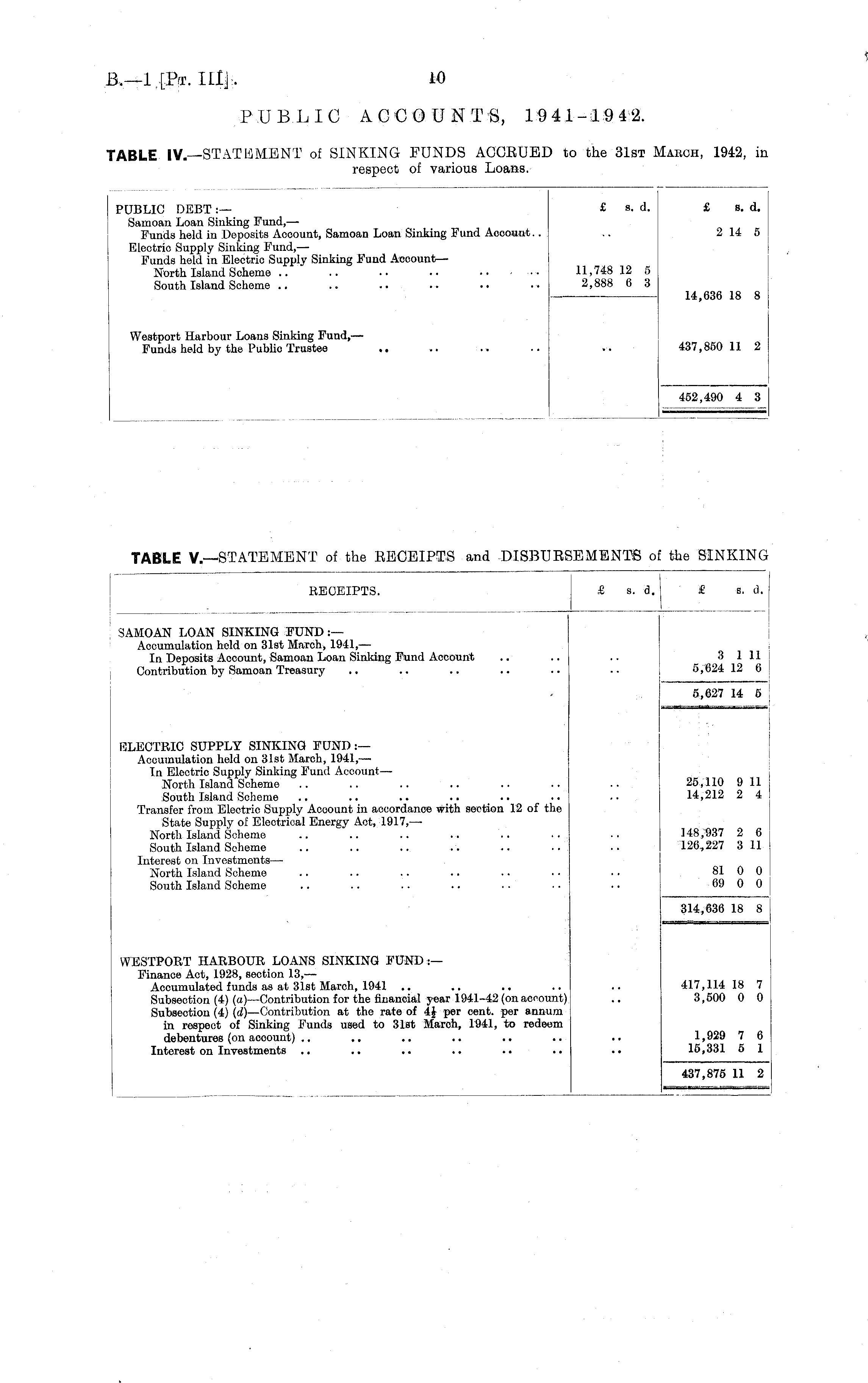 RECEIPTS. £ s. d. j £ e. d. j SAMOAN LOAN SINKING FUND :— Accumulation held on 31st March, 1941, — In Deposits Account, Samoan Loan Sinking Fund Account .. .. .. 3 111 Contribution by Samoan Treasury .. .. .. .. .. .. I 5,624 12 6 5,627 14 6 ELECTRIC SUPPLY SINKING FUND Accumulation hold on 31st March, 1941, — In Electric Supply Sinking Fund Account— North Island Scheme .. .. .. .. .. •. .. 25,110 9 11 South Island Scheme .. .. .. .. .. •• 14,212 2 4 Transfer from Electric Supply Account in accordance with section 12 of the State Supply of Electrical Energy Act, 1917,— North Island Scheme .. .. .. .. .. •• 148,937 2 6 South Island Scheme .. .. .. .. •• •• 126,227 3 11 Interest on Investments —- North Island Scheme .. .. .. .. • • ■ • ■ • 81 0 0 South Island Scheme .. .. .. .. • ■ ■ • • • 69 0 0 314,636 18 8 WESTPORT HARBOUR LOANS SINKING FUND:— Finance Act, 1928, section 13,— Accumulated funds as at 31st March, 1941 .. .. .. .. 417,114 18 7 Subsection (4) (a) —Contribution for the financial year 1941-42 (onaccount) .. 3,500 0 0 Subsection (4) (d) —Contribution at the rate of per cent, per annum in respect of Sinking Funds used to 31st March, 1941, to redeem debentures (on aooount) .. .. .. .. .. .. .. 1,929 7 6 Interest on Investments .. .. .. .. .. .. 15,331 5 1 437,875 11 2
