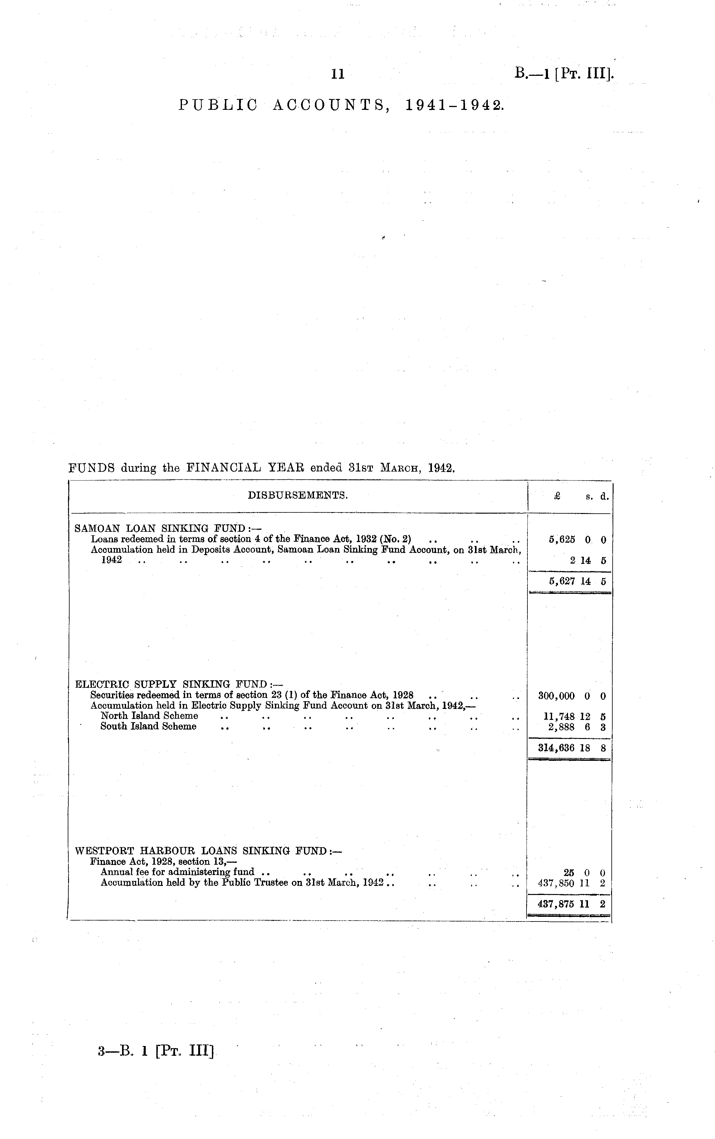 DISBURSEMENTS. £ s, d. SAMOAN LOAN SINKING FUND :— Loans redeemed in terms of section 4 of the Finance Act, 1932 (No. 2) .. .. .. 5,625 0 0 Accumulation held in Deposits Account, Samoan Loan Sinking Fund Account, on 31st March, 1942 .. .. .. .. .. .. .. .. .. .. 2 14 5 5,627 14 6 ELECTRIC SUPPLY SINKING FUND Securities redeemed in terms of section 23 (1) of the Finance Act, 1928 .. .. .. 300,000 0 0 Accumulation held in Electrio Supply Sinking Fund Account on 31st March, 1942, — North Island Scheme .. .. .. .. .. .. .. .. 11,748 12 5 South Island Scheme .. .. .. .. .. .. .. .. 2,888 6 3 314,636 18 8 WESTPORT HARBOUR LOANS SINKING FUND Finance Act, 1928, section 13,— Annual fee for administering fund .. .. .. ., .. .. .. 25 0 0 Accumulation held by the Public Trustee on 31st March, 1942 .. .. 437,850 11 2 437,875 11 2