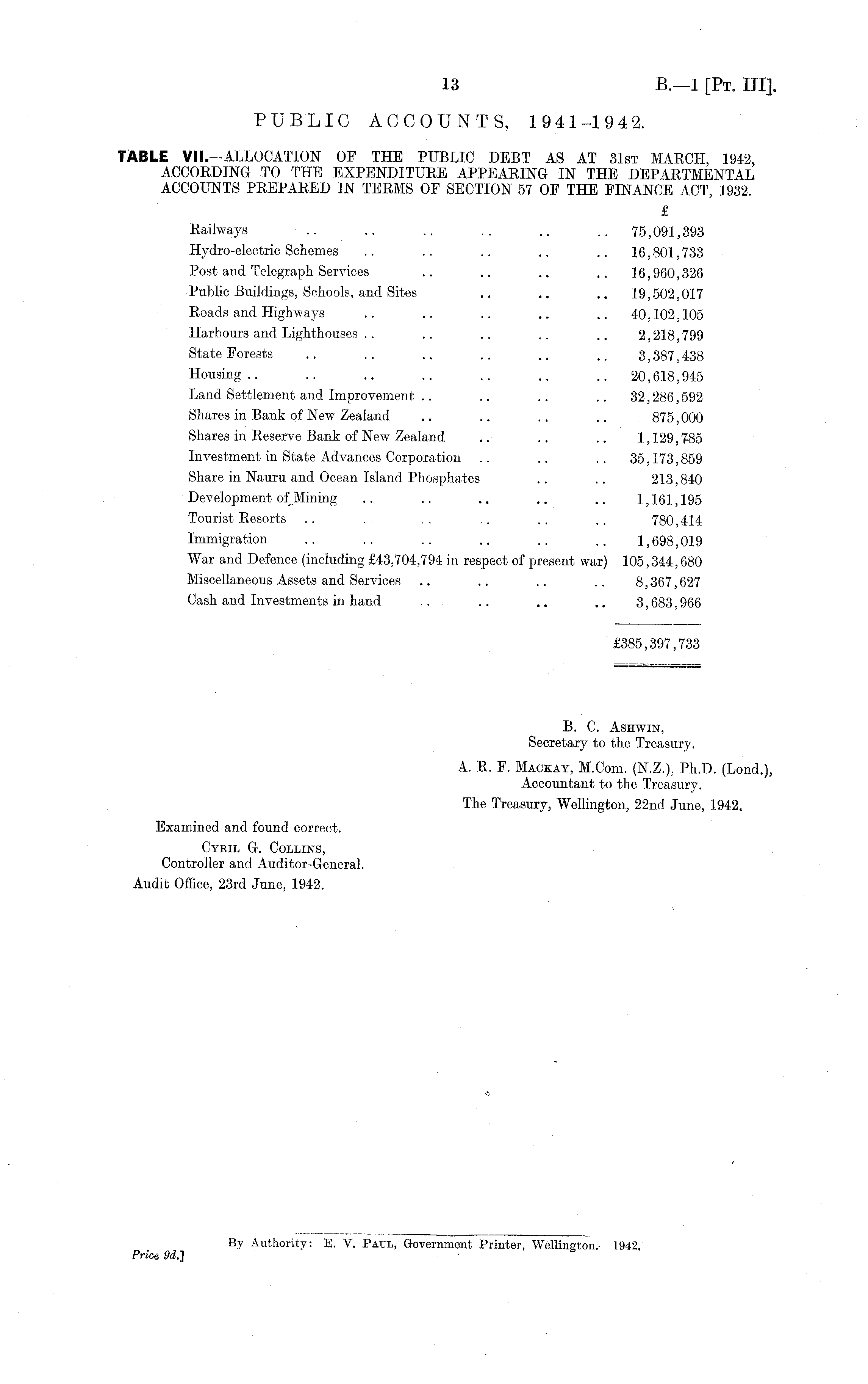 B. C. Asiiwin, Secretary to the Treasury. A. R. F. Mackay, M.Com. (N.Z.), Ph.D. (Lond.), Accountant to the Treasury. The Treasury, Wellington, 22nd June, 1942. Examined and found correct. Cyril G. Collins, Controller and Auditor-General. Audit Office, 23rd June, 1942.
