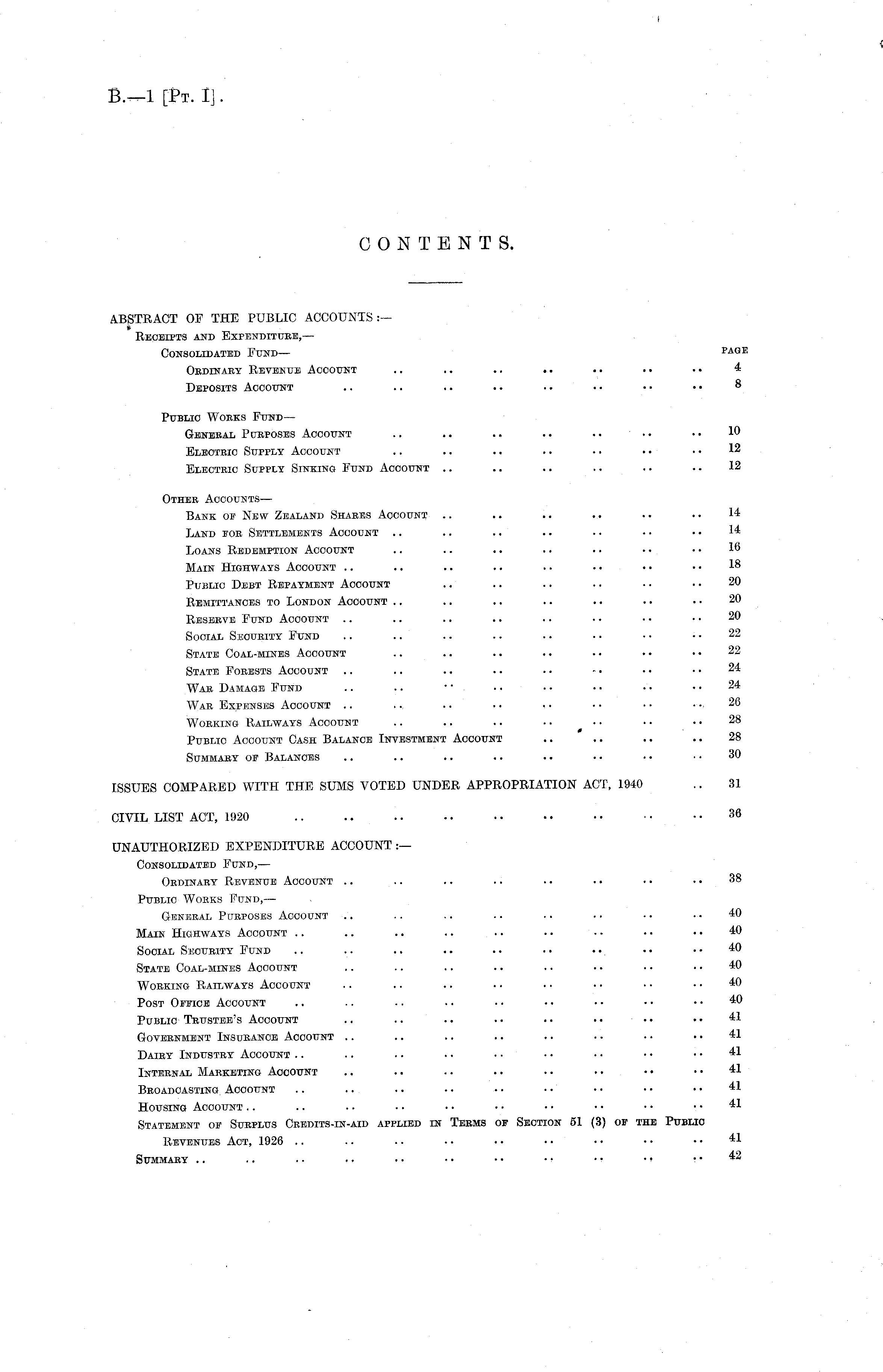 ABSTRACT OF THE PUBLIC ACCOUNTS:— i Receipts and Expenditure,— Consolidated Fund— page Ordinary Revenue Account .. .. .. .. .. .. • • 4 Deposits Account .. .. .. .. .. • • • ■ • • 8 Public Works FundGeneral Purposes Account .. .. .. .. .. .. •. 1° Electric Supply Account .. .. .. .. • • • • • • 12 Electric Supply Sinking Fund Account .. .. .. .. .. .. 12 Other Accounts— Bank of New Zealand Shares Account .. .. .. .. .. .. 14 Land for Settlements Account .. .. .. .. .. • • • • 14 Loans Redemption Account .. .. .. .. .. • • • • 16 Main Highways Account .. .. .. .. .. .. • • • • I 8 Public Debt Repayment Account .. .. .. .. • • ■ • 20 Remittances to London Account .. .. .. .. .. .. • ■ 20 Reserve Fund Account .. .. .. .. .. • • ■ • • • 20 Social Security Fund .. .. .. .. .. ■ • • • • • 22 State Coal-mines Account .. .. .. .. •. . • • • 22 State Forests Account .. .. .. .. • • - • •• • • 24 War Damage Fund .. .. • • • ■ • • • • • • • • 24 War Expenses Account .. .. .. . ■ • • • • • ■ • • 26 Working Railways Account .. .. .. • ■ • • • • • • 28 Public Account Cash Balance Investment Account .. .. .. .. 28 Summary of Balances .. .. .. .. • • • • • • • • 30 ISSUES COMPARED WITH THE SUMS VOTED UNDER APPROPRIATION ACT, 1940 .. 31 CIVIL LIST ACT, 1920 .. .. .. •• •• •• 36 UNAUTHORIZED EXPENDITURE ACCOUNT Consolidated Fund, — Ordinary Revenue Account .. .. .. .. .. ■. • ■ • • 38 Public Works Fund, — General Purposes Account .. .. .. .. ■ • • • • • • ■ 40 Main Highways Account .. .. .. .. .. • • ■ • • • • • 40 Social Security Fund .. .. .. .. .. • • • • • • • • 40 State Coal-mines Account .. .. .. .. .. • • • • • • 40 Working Railways Account .. .. .. ■ • • • • ■ ■ • • • 40 Post Office Account .. .. .. .. • • • • • • • • • • 40 Public Trustee's Account .. .. .. . • . ■ • • • • • • 41 Government Insurance Account .. .. .. .. .. • • • • • • 41 Dairy Industry Account .. .. .. .. • ■ • • • • • • • • 41 Internal Marketing Account .. .. .. . ■ • • • • • • • • 41 Broadcasting Account .. .. .. .. • ■ • • • • • • • • 41 Housing Account .. .. .. • • • • • ■ • ■ • • • • ■ • 41 Statement of Surplus Credits-in-aid applied in Terms of Section 51 (3) of the Public Revenues Act, 1926 .. .. .. • • ■ • • ■ • • • • • • 41 Summary .. .. • • ■. • • • • ■ ■ •» • ■ • > • •