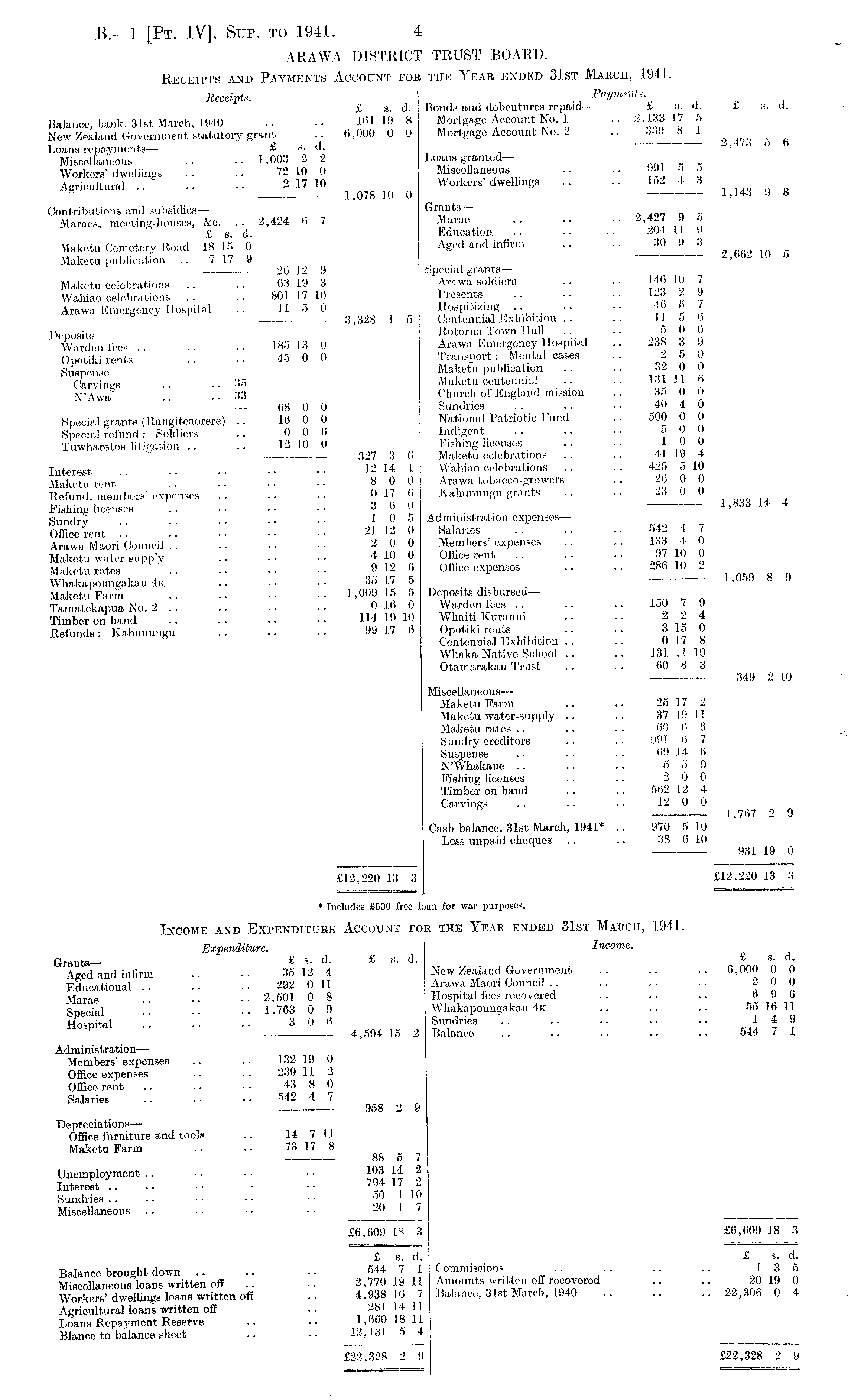 ARAWA DISTRICT TRUST BOARD. Receipts and Payments Account for the Year ended 31st March, 194-1. Receipts. Payments. £ s. d. Bonds and debentures repaid— % s. a. 1 s. d. Balance, bank, 31st March, 1940 .. .. 16119 8 Mortgage Account No. 1 .. 2,133 17 5 New Zealand Government statutory grant .. 6,000 0 0 Mortgage Account No. .. 9 Ann r « Loans repayments— £ s. d. > ° Miscellaneous .. .. 1,003 22 Loans granted— Workers' dwellings .. .. 72 10 0 Miscellaneous .. .. 991 5 5 Agricultural 217 10 Workers'dwellings .. .. 152 4 3 8 1,078 10 0 1,143 9 8 Contributions and subsidies— Grants Maraes, meeting-houses, &c. .. 2,424 6 7 Marae .. •• > £ B . d. Education .. .. • • 204 IX 9 Maketu Cemetery Road 18 15 0 Aged and infirm .. .. 30 9 3 Maketu publication 7 17 9 > 20 12 9 Special grants — Maketu celebrations .. .. 03 19 3 Arawa soldiers .. .. 146 10 7 Wahiao celebrations .. • ■ 801 17 10 Presents .. • • • • 1 ■ Arawa Emergency Hospital .. 11 5 0 Hospitizmg .. .. .. 4b 5 7 — 3,328 1 5 Centennial Exhibition .. .. 11 5 6 Deposits Rotorua Town Hall .. .. 5 0 6 Warden fees .. • • 185 13 0 Arawa Emergency Hospital .. 238 3 9 Opotiki rents .. .. 45 0 0 Transport: Mental cases .. 25 0 Suspense- Maketu publication .. .. 32 »{, Carvings .. ..35 Maketu centennial . .. 13111 6 N'Awa .. 33 Church of England mission .. 35 0 0 — 68 0 0 Sundries .. .. • • 40 4 0 Special grants (Rangiteaorere) .. 16 0 0 National Patriotic Fund .. 500 0 0 Special refund: Soldiers .. 00 0 Indigent .. .. ■■ 50 0 Tuwharetoa litigation .. 12 10 0 Pishing licenses .. .. 10 0 — 327 3 6 Maketu celebrations .. .. 41 19 4 Interest .. .. ■ • • • • • 12 14 1 Wahiao celebrations .. .. 425 510 Maketu rent .. • • • • • • 8 0 0 Arawa tobacco-growers .. 26 0 0 Refund, members'expenses .. .. •• 017 0 Kahunungu grants .. .. 23 0 0 Pishing licenses 3 6 0 1,833 14 4 SnnHrv .. .. 10 5 Administration expenses— Office rent " 21 12 0 Salaries .. .. .. 542 4 7 Arawa Maori Council 20 0 Members'expenses .. .. 133 4 0 Maketu water-supply 410 0 Office rent 97 10 0 Maketu rates 912 6 Office expenses .. .. 286 10 2 Whakapoungakau 4k .. •• •• 35 17 5 1, Maketu Farm 1,009 15 5 Deposits disbursed— Tamatekapua No. 2 016 0 Warden fees 150 7 9 Timber on hand .. .. .. •• 114 19 10 Whaiti Kuranui .. .. I Z 4 Refunds : Kahunungu 99 17 0 Opotiki rents .. .. 315 0 Centennial Exhibition .. .. 0 17 8 Whaka Native School .. .. 131 1! 10 Otamarakau Trust .. 00 8 3 349 2 10 * Miscellaneous — Maketu Farm .. .. 25 17 2 Maketu water-supply .. .. 37 19 11 Maketu rates .. .. 00 0 6 Sundry creditors .. .. 991 0 7 Suspense .. .. • ■ 69 14 0 N'Whakaue .. .. .. 5 5 9 Fishing licenses .. .. 2 0 0 Timber on hand . ■ .. 502 12 4 Carvings .. .. .. 12 0 0 1,707 2 9 Cash balance, 31st March, 1941* .. 970 5 10 Less unpaid cheques .. .. 38 0 10 931 19 0 £12,220 13 3 £12,220 13 3 * Includes £500 free loan for war purposes. Income and Expenditure Account for the Year ended 31st March, 1941. Expenditure. Income. Grants £s. d. £ s. d. £ s - "• Acred and infirm .. 35 12 4 New Zealand Government .. .. .. 6,000 0 0 Educational 292 0 11 Arawa Maori Council 2 0 0 Marae .. •• .. 2,501 0 8 Hospital fees recovered .. .. .. 6 9 0 Special .. .. 1,703 0 9 Whakapoungakau 4k .. .. •• 55 16 11 Hospital 3 0 0 Sundries 4,594 15 2 Balance .. -. .. •• 544 7 1 Administration — Members'expenses .. •• 132 19 0 Office expenses .. ■ • 239 11 2 Office rent .. • • • • 43 8 0 Salaries .. .. • • 542 4 7 958 2 9 Depreciations — Office furniture and tools .. 14 7 11 Maketu Farm .. • • 73 17 8 — — 88 o 7 Unemployment .. .. • ■ • • n 9 Interest •• 17 2 Sundries .. .. • • • • • • °0 1 10 Miscellaneous .. . • • • • • -0 17 £6,609 18 3 £6,609 18 3 £ s. d. £ s. d. Balance brought down .. .. •• 544 7 1 Commissions .. .. .. .. 1 3 5 Miscellaneous loans written off .. .. 2,770 911 Amounts written off recovered .. .. 20 19 0 Workers'dwellings loans written off .. 4,938 10 7 Balance, 31st March, 1940 .. .. .. 0 4 Agricultural loans written off 281 14 11 Loans Repayment Reserve .. •• 1,000 18 11 Blance to balance-sheet .. •• 12,131 5 4 £22,328 2 9 £22,328 2 9 *