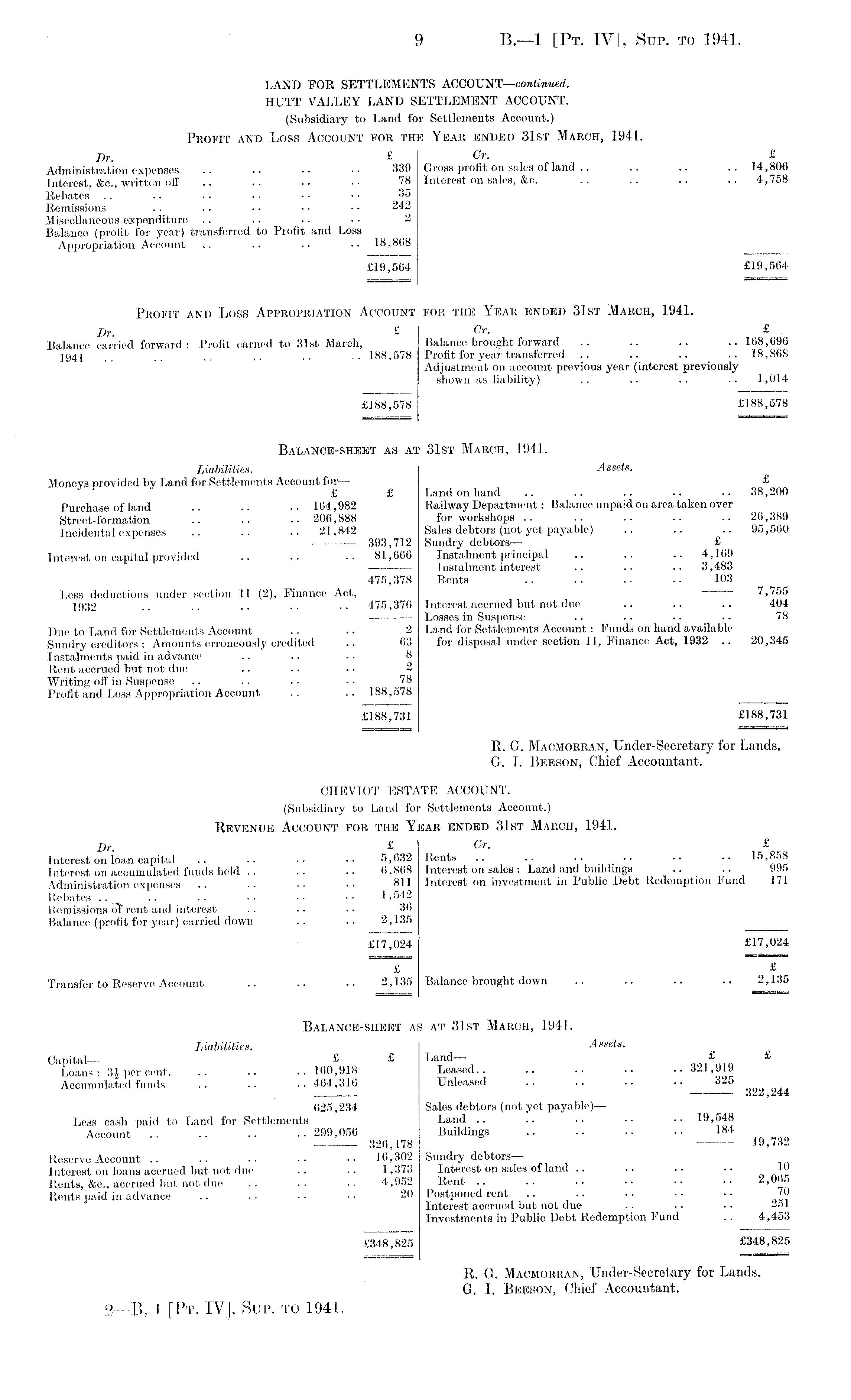 LAND FOR SETTLEMENTS ACCOUNT —continued. HUTT VALLEY LAND SETTLEMENT ACCOUNT. (Subsidiary to Land for Settlements Account.) Profit and Loss Account for the Year ended 31st March, 1941. Dr. £ Cr. £ Administration expenses .. .. ■■ 330 Gross profit on sales of land .. .. .. ..14,806 Interest, &c., written off .. .. .. 78 Interest on sales, &c. .. .. .. .. 4,758 Rebates .. .. •. ■ ■ • • • • 35 Remissions . . • • • ■ • ■ • • 242 Miscellaneous expenditure .. .. .. • • 2 Balance (profit for year) transferred to Profit and Loss Appropriation Account .. .. .. •• 18,868 £19,564 £19,564 Profit and Loss Appropriation Account for the Year ended 31st March, 1941. Dr. £ Cr. £ , Balance carried forward: Profit earned to 31st March, Balance brought forward .. .. .. ..168,696 1941 .. .. .. .. 188,578 Profit for year transferred .. .. .. .. 18,868 Adjustment on account previous year (interest previously shown as liability) .. .. .. .. 1,014 £188,578 £188,578 Balance-sheet as at 31st March, 1941. Liabilities. Assets. Monevs provided by Land for Settlements Account for— £ £ £ Land on hand .. .. .. .. .. 38,200 PiireWfi of land .. .. 164,982 Railway Department: Balance unpaid on area taken over Street-formation .. .. ..206,888 for workshops .. .. .. .. .. 26,389 Incidental expenses .. .. .. 21,842 Sales debtors (not yet payable) .. .. .. 95,560 393,712 Sundry debtors— £ Interest on capital provided .. .. .. 81,666 Instalment principal .. .. .. 4,169 Instalment interest .. .. .. 3,483 475,378 Rents .. .. .. .. 103 Less deductions under section 11 (2), Finance Act, 7,755 1932 .. .. .. .. .. 475,376 Interest accrued but not due .. .. .. 404 Losses in Suspense .. .. .. .. 78 Due to Land for Settlements Account .. .. 2 Land for Settlements Account : Funds on hand available Sundry creditors : Amounts erroneously credited .. 63 for disposal under section 11, Finance Act, 1932 .. 20,345 Instalments paid in advance .. .. ■ • 8 Rent accrued but not due .. .. . - 2 Writing off in Suspense .. .. .. • ■ 78 Profit and Loss Appropriation Account .. .. 188,578 £188,731 £188,731 R. G. Macmorran, Under-Secretary for Lands. G. I. Beeson, Chief Accountant. CHEVIOT ESTATE ACCOUNT. (Subsidiary to Land for Settlements Account.) Revenue Account for the Year ended 31st March, 1941. Dr. £ Cr. £ Interest on loan capital .. .. 5,632 Rents .. .. Interest on accumulated funds held .. .. .. 6,868 Interest on sales : Land and buildings .. .. 995 Administration expenses .. •• •• •• 811 Interest on investment in Public Debt Redemption Fund 171 Rebates .. a .. •• •• •• 1,542 Remissions ot rent and interest .. . • • • 36 Balance (profit for year) carried down .. .. 2,135 £17,024 £17,024 T" "T* Transfer to Reserve Account .. .. •• 2,135 Balanoe brought down .. .. .. .. 2,135 Balance-sheet as at 31st March, 1941. Liabilities. Assets. Capital— £ £ Land £ £ Loans: 3J per cent. .. .. .. 160,918 Leased.. .. .. .. •• "*21,919 Accumulated funds .. .. ..464,310 Unleased .. .. .. .. 320 322,244 625,234 Sales debtors (not yet payable)—• Less cash paid to Land for Settlements Land .. .. .. .. •• 19,548 Account .. -- •• 299,056 Buildings .. .. •• • ■ 184 326,178 19,732 Reserve Account .. .. .. •• 16,302 Sundry debtorsInterest on loans accrued but not due .. .. 1,373 Interest on sales of land .. .. .. .. 10 Rents, &c., accrued but not due .. .. .. 4,952 Rent .. .. .. •• •• •• Rents paid in advance .. .. .. •• 20 Postponed rent .. .. .. •• 70 Interest accrued but not due .. .. .. *01 Investments in Public Debt Redemption Fund .. 4,453 £348,825 £348,825