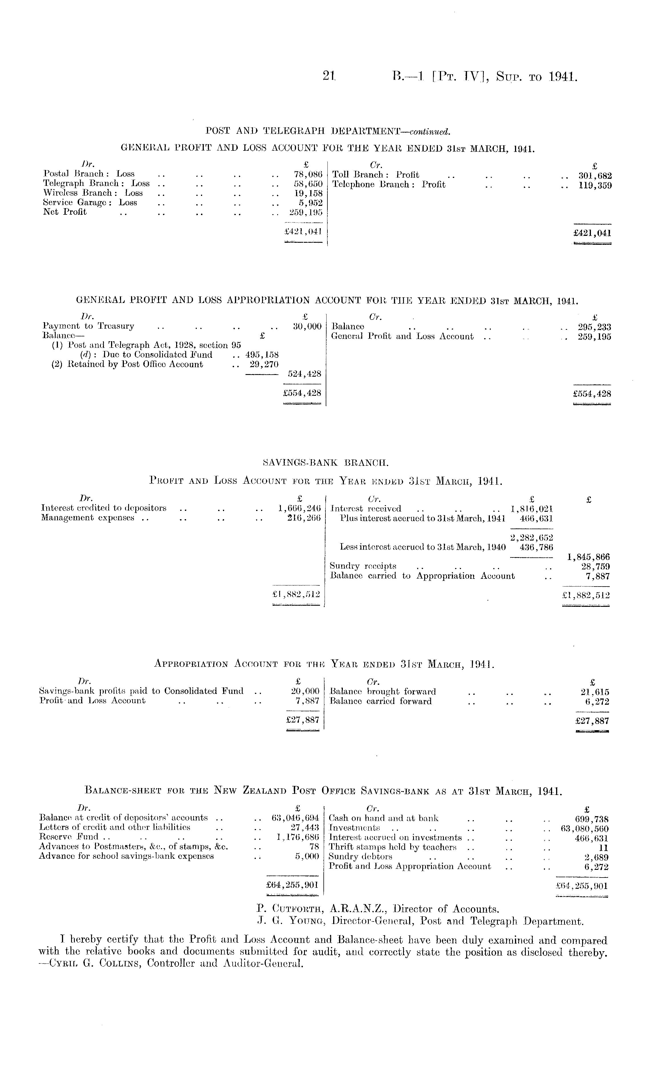 POST AND TELEGRAPH DEPARTMENT—continued. GENERAL PROFIT AND LOSS ACCOUNT FOR THE YEAR ENDED 31ST MARCH, 1941. Dr. £ Or. £ Postal Branch: Loss .. .. .. .. 78,086 Toll Branch: Profit .. .. .. .. 301,682 Telegraph Branch: Loss .. .. .. .. 58,650 Telephone Branch: Profit .. .. .. 119,359 Wireless Branch: Loss .. .. .. .. 19,158 Service Garage: Loss .. .. .. .. 5,952 Net Profit .. .. .. .. .. 259,195 £421,041 £421,041 GENERAL PROFIT AND LOSS APPROPRIATION ACCOUNT FOR THE YEAR ENDED 31st MARCH, 1941. Dr. £ Cr. £ Payment to Treasury .. .. .. .. 30,000 Balance .. .. .. .. .. 295,233 Balance— £ General Profit and Loss Account .. ... .. 259,195 (1) Post and Telegraph Act, 1928, section 95 (d) : Due to Consolidated Fund .. 495,158 (2) Retained by Post Office Account .. 29,270 524,428 £554,428 £554,428