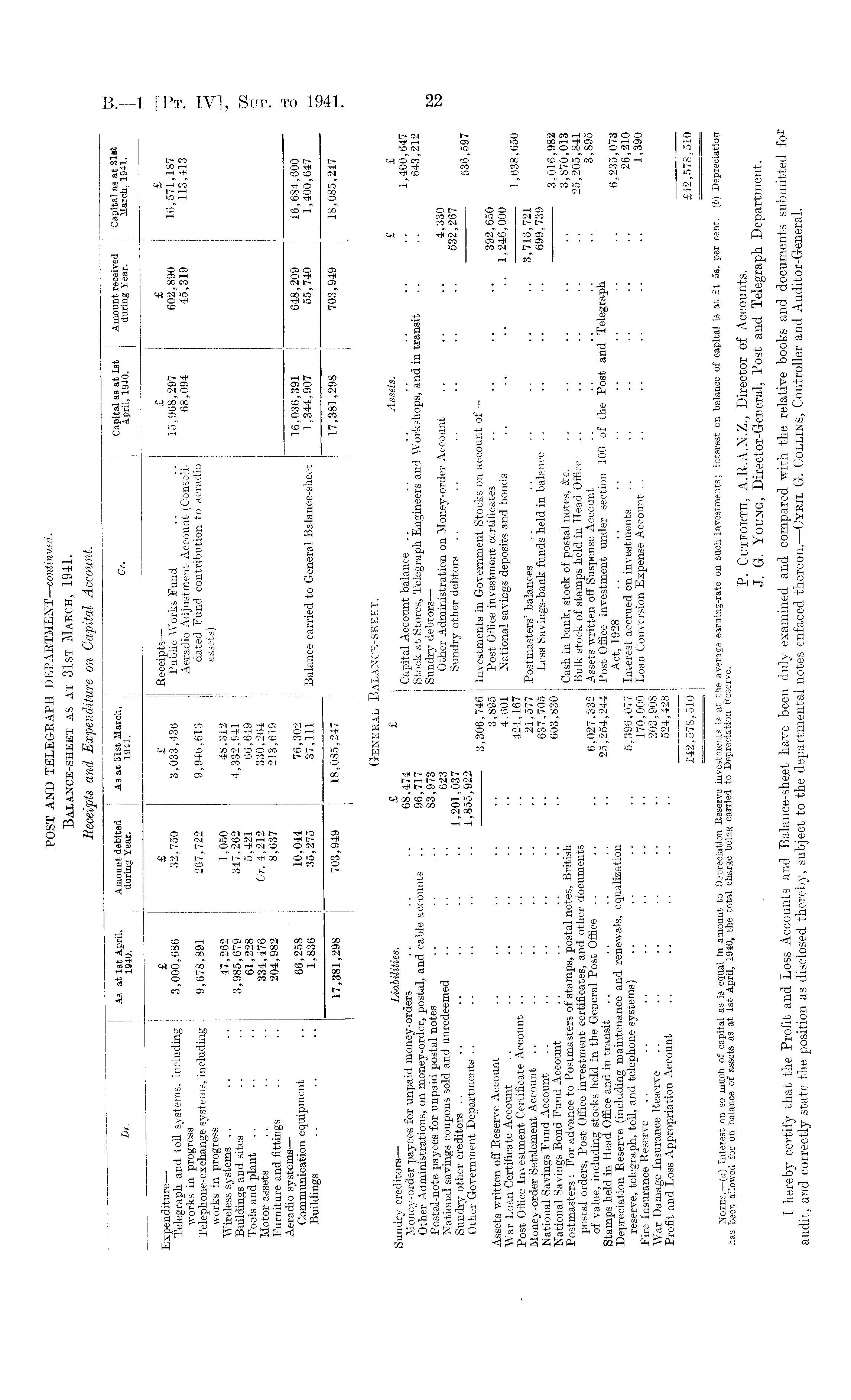 POST AND TELEGRAPH DEPARTMENT— continued. Balance-sheet as at 31st March, 1941. Receipts and Expenditure on Capital Account.