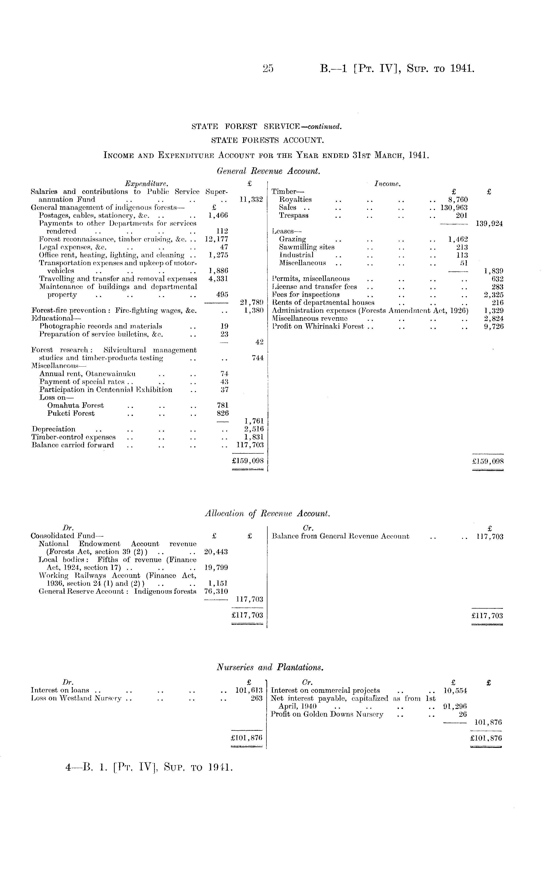 STATE FOREST SERVlCE—continued. STATE FORESTS ACCOUNT. Income and Expenditure Account foe the Year ended 31st March, 1941. General Revenue Account. Expenditure. £ Income. Salaries and contributions to Public Service Super- Timber— £ £ annuation Fund .. .. .. .. 11,332 Royalties .. .. .. .. 8,760 General management of indigenous forests— £ Sales .. .. .. .. .. 130,963 Postages, cables, stationery, &c. .. .. 1,466 Trespass .. .. .. .. 201 Payments to other Departments for services 139,924 rendered .. .. .. .. 112 Leases— Forest reconnaissance, timber cruising, &c. .. 12,177 Grazing .. .. .. .. 1,462 Legal expenses, &c. .. .. .. 47 Sawmilling sites .. .. .. 213 Office rent, heating, lighting, and cleaning .. 1,275 Industrial .. .. .. .. 113 Transportation expenses and upkeep of motor- Miscellaneous .. .. .. .. 51 vehicles .. .. .. .. 1,886 — 1,839 Travelling and transfer and removal expenses 4,331 Permits, miscellaneous .. .. .. .. 632 Maintenance of buildings and departmental License and transfer fees .. .. .. .. 283 property .. .. .. .. 495 Fees for inspections .. .. .. .. 2,325 21,789 Rents of departmental houses .. .. .. 216 Forest-fire prevention : Fire-fighting wages, &c. .. 1,380 Administration expenses (Forests Amendment Act, 1926) 1,329 Educational— Miscellaneous revenue .. .. .. .. 2,824 Photographic records and materials .. 19 Profit on Whirinaki Forest .. .. .. .. 9,726 Preparation of service bulletins, &e. ' .. 23 — 42 Forest research: Silvicultural management studies and timber-products testing .. .. 744 Miscellaneous— Annual rent, Otanewainuku .. .. 74 Payment of special rates .. .. .. 43 Participation in Centennial Exhibition .. 37 Loss on— Omahuta Forest .. .. .. 781 Puketi Forest .. .. .. 826 1,761 Depreciation .. .. .. .. .. 2,516 Timber-control expenses .. .. .. .. 1,831 Balance carried forward .. .. .. .. 117,703 £159,098 £159,098 Allocation of Revenue Account. Dr. Cr. £ Consolidated Fund— £ £ Balance from General Revenue Account .. .. 117,703 National Endowment Account revenue (Forests Act, section 39 (2)) .. .. 20,443 Local bodies : Fifths of revenue (Finance Act, 1924, section 17) .. .. .. 19,799 Working Railways Account (Finance Act, 1936, section 24 (1) and (2)) .. .. 1,151 General Reserve Account : Indigenous forests 76,310 — 117,703 £117,703 £117,703 Nurseries and Plantations. Dr. £ Cr. £ £ Interest on loans .. .. .. .. .. 101,613 Interest on commercial projects .. .. 10,554 Loss on Westland Nursery .. .. .. .. 263 Net interest payable, capitalized as from Ist April, 1940 .. .. .. .. 91,296 Profit on Golden Downs Nursery .. .. 26 101,876 £101,876 £101,876