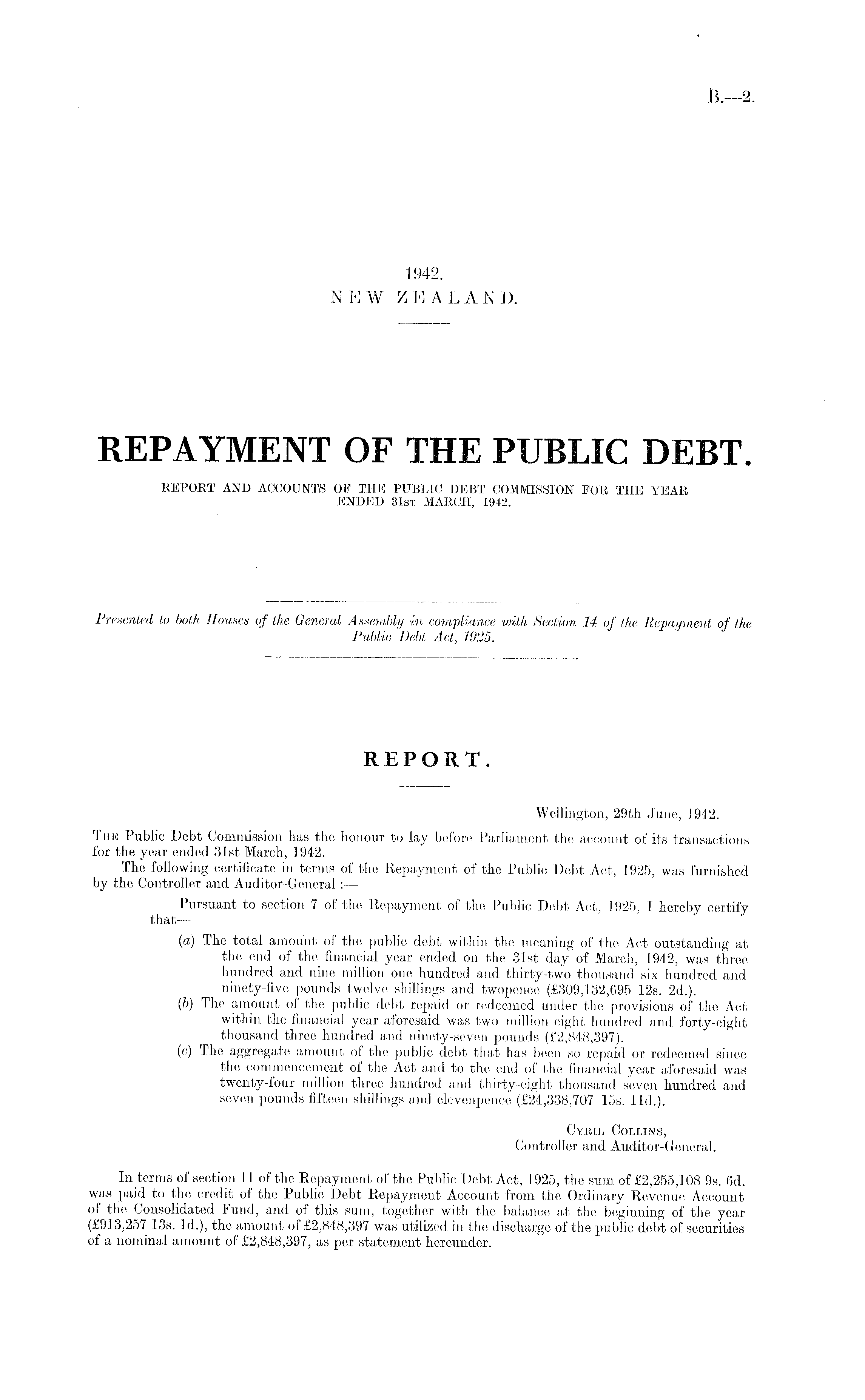 REPORT. Wellington, 29th June, 1942. The Public Debt Commission has the honour to lay before Parliament the account of its transactions for the year ended 31st March, 1942. The following certificate in terms of the Repayment of the Public Debt Act, 1925, was furnished by the Controller and Auditor-General: — Pursuant to section 7 of the Repayment of the Public Debt Act, 1925, I hereby certify that— (а) The total amount of the public debt within the meaning of the Act outstanding at the end of the financial year ended on the 31st day of March, 1942, was three hundred and nine million one hundred and thirty-two thousand six hundred and ninety-five pounds twelve shillings and twopence (£309,132,695 12s. 2d.). (б) The amount of the public debt repaid or redeemed under the provisions of the Act within the financial year aforesaid was two million eight hundred and forty-eight thousand three hundred and ninety-seven pounds (£2,848,397). (c) The aggregate amount of the public debt that has been so repaid or redeemed since the commencement of the Act and to the end of the financial year aforesaid was twenty-four million three hundred and thirty-eight thousand seven hundred and seven pounds fifteen shillings and elevenpence (£24,338,707 15s. lid.). Cybil Collins, Controller and Auditor-General. In terms of section 11 of the Repayment of the Public Debt Act, 1925, the sum of £2,255,108 9s. 6d. was paid to the credit of the Public Debt Repayment Account from the Ordinary Revenue Account of the Consolidated Fund, and of this sum, together with the balance at the beginning of the year (£913,257 13s. Id.), the amount of £2,848,397 was utilized in the discharge of the public debt of securities of a nominal amount of £2,848,397, as per statement hereunder.