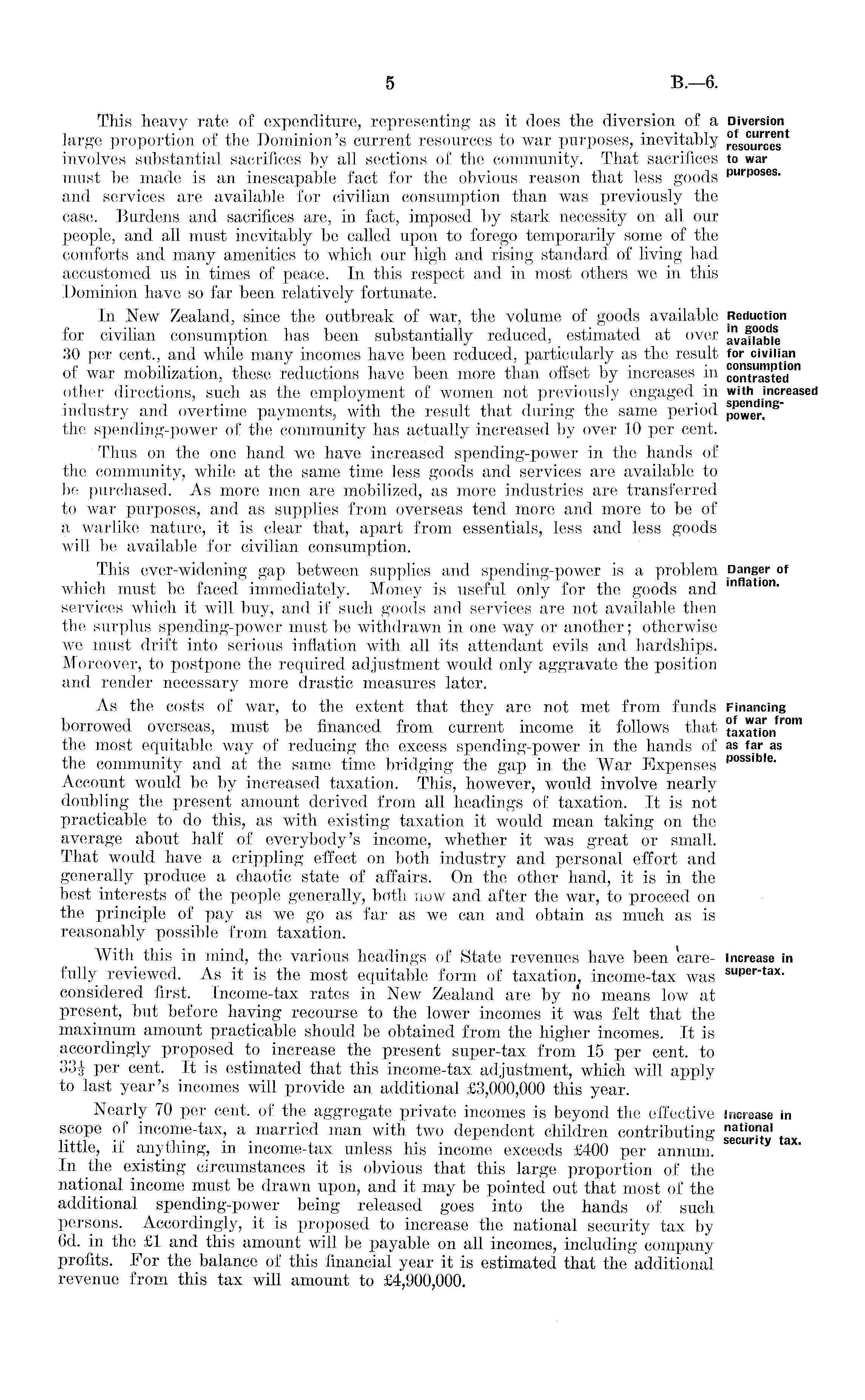 This heavy rate of expenditure, representing as it does the diversion of a large proportion of the Dominion's current resources to war purposes, inevitably involves substantial sacrifices by all sections of the community. That sacrifices must be made is an inescapable fact for the obvious reason that less goods and services are available for civilian consumption than was previously the case. Burdens and sacrifices are, in. fact, imposed by stark necessity on all our people, and all must inevitably be called upon to forego temporarily some of the comforts and many amenities to which our high and rising standard of living had accustomed us in times of peace. In this respect and in most others we in this Dominion have so far been relatively fortunate. In New' Zealand, since the outbreak of war, the volume of goods available for civilian consumption has been substantially reduced, estimated at over 30 per cent., and while many incomes have been reduced, particularly as the result of war mobilization, these reductions have been more than offset by increases in other directions, such as the employment of women not previously engaged in industry and overtime payments, with the result that during the same period the spending-power of the community has actually increased by over 10 per cent. Thus on the one hand we have increased spending-power in the hands of the community, while at the same time less goods and services are available to be purchased. As more men are mobilized, as more industries are transferred to war purposes, and as supplies from overseas tend more and more to be of a warlike nature, it is clear that, apart from essentials, less and less goods will be available for civilian consumption. This ever-widening gap between supplies and spending-power is a problem which must be faced immediately. Money is useful only for the goods and services which it will buy, and if such goods and services are not available then the surplus spending-power must be withdrawn in one way or another; otherwise we must drift into serious inflation with all its attendant evils and hardships. Moreover, to postpone the required adjustment would only aggravate the position and render necessary more drastic measures later. As the costs of war, to the extent that they are not met from funds borrowed overseas, must be financed from current income it follows that the most equitable way of reducing the excess spending-power in the hands of the community and at the same time bridging the gap in the War Expenses Account would be by increased taxation. This, however, would involve nearly doubling the present amount derived from all headings of taxation. It is not practicable to do this, as with existing taxation it would mean taking on the average about half of everybody's income, whether it was great or small. That would have a crippling effect on both industry and personal effort and generally produce a chaotic state of affairs. On the other hand, it is in the best interests of the people generally, both now and after the war, to proceed on the principle of pay as we go as far as we can and obtain as much as is reasonably possible from taxation. With this in mind, the various headings of State revenues have been carefully reviewed. As it is the most equitable form of income-tax was considered first. Income-tax rates in New Zealand are by no means low at present, but before having recourse to the lower incomes it was felt that the maximum amount practicable should be obtained from the higher incomes. It is accordingly proposed to increase the present super-tax from 15 per cent, to per cent. It is estimated that this income-tax adjustment, which will apply to last year's incomes will provide an additional £3,000,000 this year. Nearly 70 per cent, of the aggregate private incomes is beyond the effective scope of income-tax, a married man with two dependent children contributing little, if anything, in income-tax unless his income exceeds £400 per annum. In the existing circumstances it is obvious that this large proportion of the national income must be drawn upon, and it may be pointed out that most of the additional spending-power being released goes into the hands of such persons. Accordingly, it is proposed to increase the national security tax by 6d. in the £1 and this amount will be payable on all incomes, including company profits. For the balance of this financial year it is estimated that the additional revenue from this tax will amount to £4,900,000.