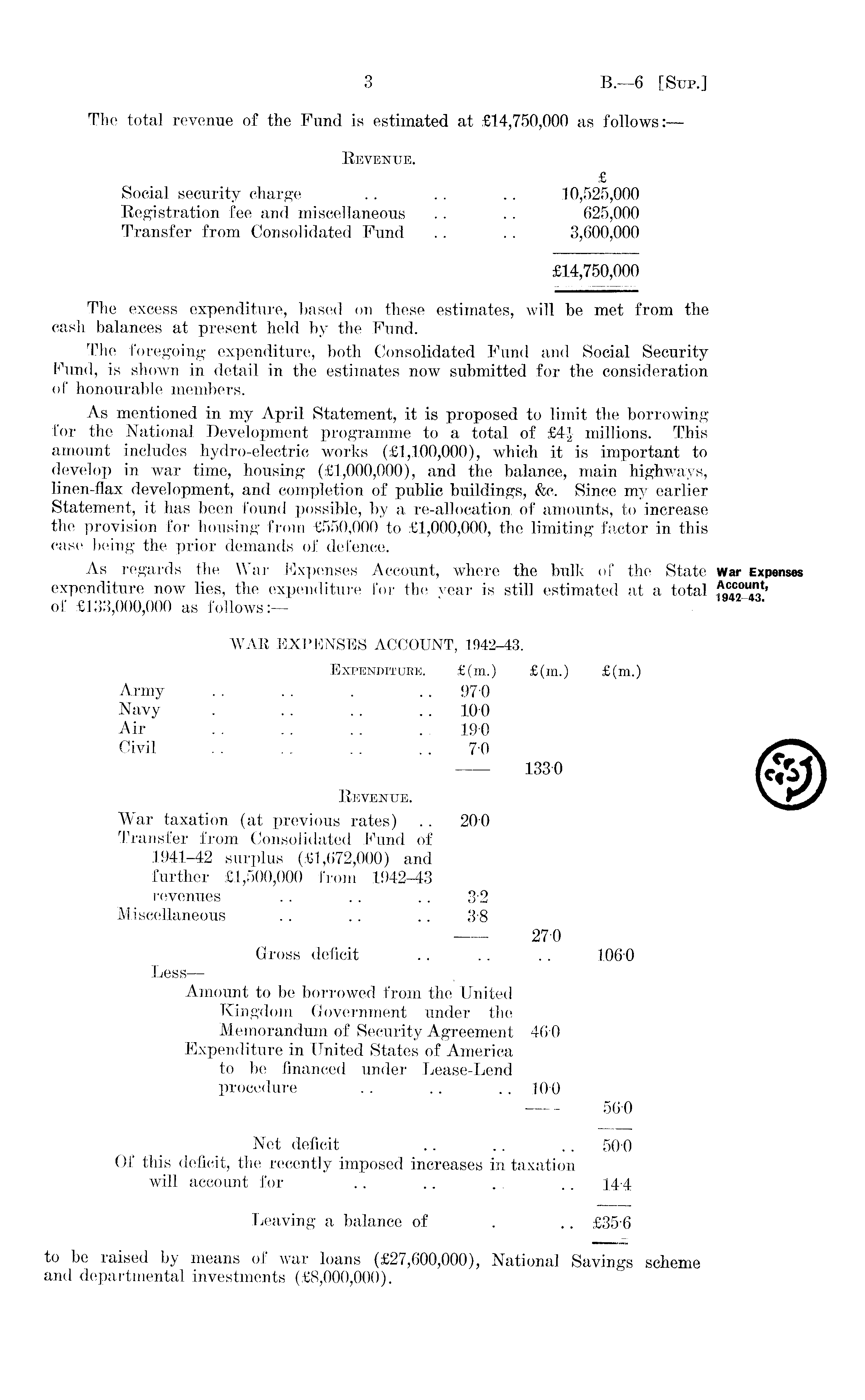 The total revenue of the Fund is estimated at £14,750,000 as follows: — Revenue. £ Social security charge . . .. .. 10,525,000 Registration fee and miscellaneous .. . . 625,000 Transfer from Consolidated Fund .. .. 3,600,000 £14,750,000 The excess expenditure, based on these estimates, will be met from the cash balances at present held by the Fund. The foregoing expenditure, both Consolidated Fund and Social Security Fund, is shown in detail in the estimates now submitted for the consideration of honourable members. As mentioned in my April Statement, it is proposed to limit the borrowing for the National Development programme to a total of £4J millions. This amount includes hydro-electric works (£1,100,000), which it is important to develop in war time, housing (£1,000,000), and the balance, main highways, linen-flax development, and completion of public buildings, &c. Since my earlier Statement, it has been found possible, by a re-allocation of amounts, to increase the provision for housing from £550,000 to £1,000,000, the limiting factor in this case being the prior demands of defence. As regards the War Expenses Account, where the bulk of the State expenditure now lies, the expenditure for the year is still estimated at a total of £133,000,000 as follows:— WAR EXPENSES ACCOUNT, 1942-43. Expenditure. £(m.) £(m.) £(m.) Army .. . . . .. 97 0 Navy . . . .. .. 10 0 Air .. .. . . . 19 0 Civil . . . . .. .. 7 0 1330 Revenue. War taxation (at previous rates) .. 20 0 Transfer from Consolidated Fund of 1941-42 surplus (£1,672,000) and further £1,500,000 from 1942-43 revenues .. .. .. 3 2 Miscellaneous .. .. .. 3 8 270 Gross deficit .. .. .. 106 0 Less— Amount to be borrowed from the United Kingdom Government under the Memorandum of Security Agreement 46 0 Expenditure in United States of America to be financed under Lease-Lend procedure .. .. .. 10 0 560 Net deficit .. .. .. 50 0 Of this deficit, the recently imposed increases in taxation will account for .. .. . .. 14-4 Leaving a balance of . .. £35 6 to be raised by means of war loans (£27,600,000), National Savings scheme and departmental investments (£8,000,000).