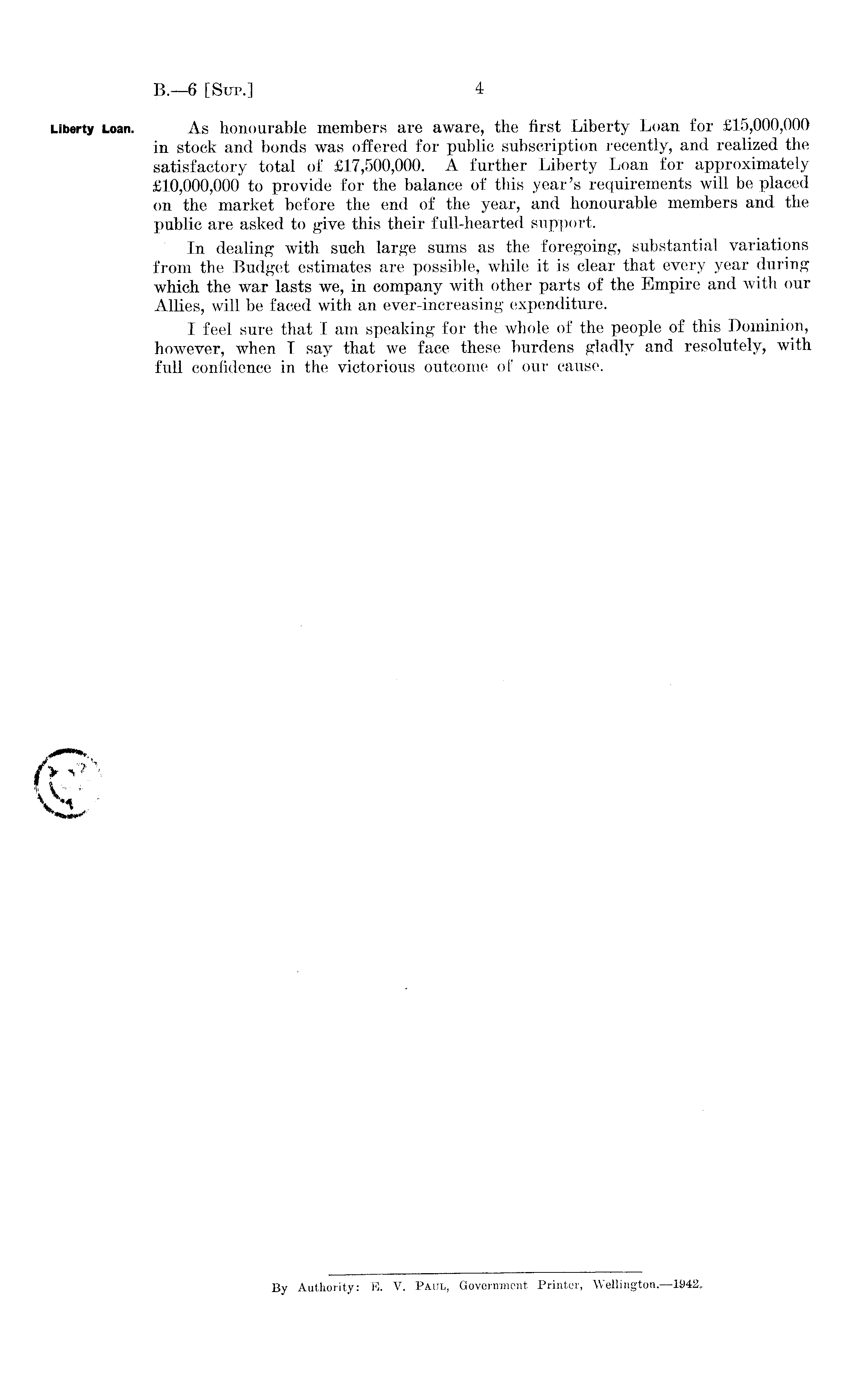 As honourable members are aware, the first Liberty Loan for £15,000,000 in stock and bonds was offered for public subscription recently, and realized the satisfactory total of £17,500,000. A further Liberty Loan for approximately £10,000,000 to provide for the balance of this year's requirements will be placed on the market before the end of the year, and honourable members and the public are asked to give this their full-hearted support. In dealing with such large sums as the foregoing, substantial variations from the Budget estimates are possible, while it is clear that every year during which the war lasts we, in company with other parts of the Empire and with our Allies, will be faced with an ever-increasing expenditure. I feel sure that I am speaking for the whole of the people of this Dominion, however, when I say that we face these burdens gladly and resolutely, with full confidence in the victorious outcome of our cause.