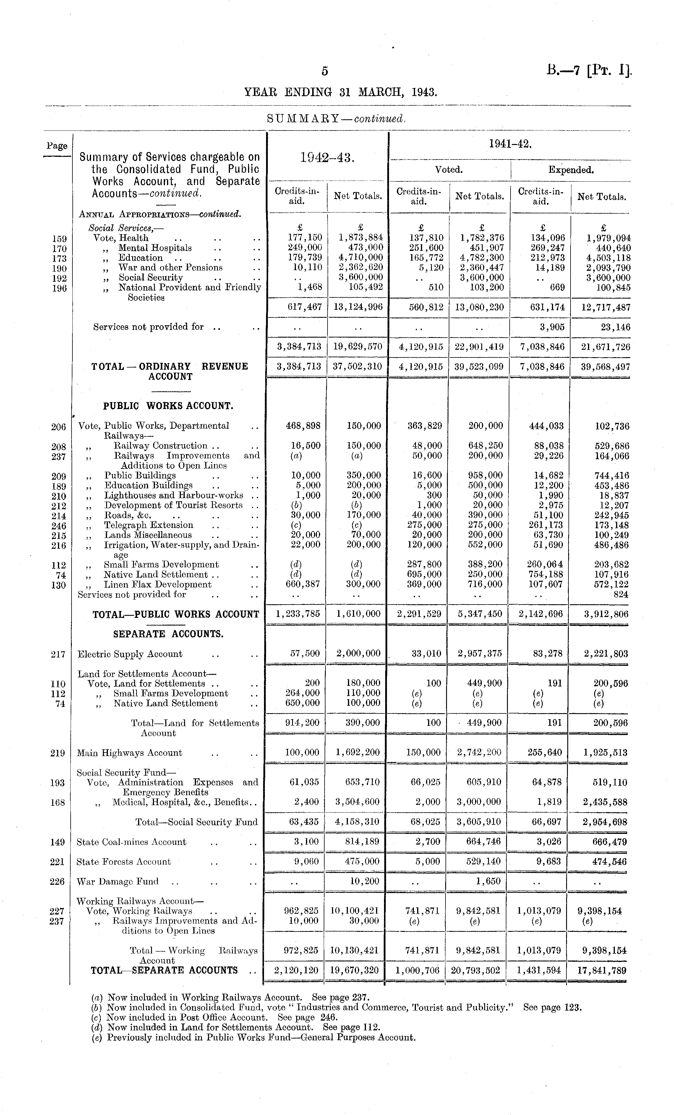Page 1941-42. Summary of Services chargeable on 1942-43. ; the Consolidated Fund, Public Voted. Expended. Works Account, and Separate Aooounts— continued. Oredite-in- Net Totals , Credita-m- Net Totole- Oedits-in. NotTotals , cLlCl. fllCl. Oil CI. Annual Appkopbiations— continued. Social Services, — ££££££ 159 Vote, Health .. .. •• 177,150 1,873,884 137,810 1,782,370 134,096 1,979,094 170 „ Mental Hospitals .. .. 249,000 473,000 251,600 451,907 269,247 440,640 J73 ,, Education .. .. .. 179,739 4,710,000 105,772 4,782,300 212,973 4,503,118 190 „ War and other Pensions .. 10,110 2,362,020 5,120 2,360,447 14,189 2,093,790 192 „ Social Security .. .. .. 3,600,000 .. 3,000,000 .. 3,600,000 196 „ National Provident and Friendly 1,468 105,492 510 103,200 669 100,845 Societies 617,467 13,124,996 560,812 13,080,230 631,174 12,717,487 Services not provided for .. .. .. .. .. .. 3,905 23,146 3,384,713 19,629,570 4,120,915 22,901,419 7,038,846 21,071,726 TOTAL —ORDINARY REVENUE 3,384,713 37,602,310 4,120,915 39,523,099 7,038,846 39,568,497 ACCOUNT -,.„,. —,—■ .— ■ —,■ ■, ■ ■ r 1 PUBLIC WORKS ACCOUNT. 206 Vote, Public Works, Departmental .. 468,898 150,000 363,829 200,000 444,033 102,736 Railways—■ 208 „ Railway Construction .. .. 16,500 150,000 48,000 648,250 88,038 529,686 237 „ Railways Improvements arid (a) (a) 50,000 200,000 29,226 164,066 Additions to Open Lines 209 ,. Public Buildings .. .. 10,000 350,000 16,600 958,000 14,082 744,416 189 „ Education Buildings .. .. 5,000 200,000 5,000 500,000 12,200 453,486 210 ,, Lighthouses and Harbour-works .. 1,000 20,000 300 50,000 1,990 18,837 212 „ Development of Tourist Resorts .. (A) (6) 1,000 20,000 2,975 12,207 214 „ Roads, &c. .. .. .. 30,000 170,000 40,000 390,000 51,100 242,945 246 „ Telegraph Extension .. .. (c) (c) 275,000 275,000 261,173 173,148 215 „ Lands Miscellaneous .. .. 20,000 70,000 20,000 200,000 03,730 100,249 216 „ Irrigation, Water-supply, and Drain- 22,000 200,000 120,000 552,000 51,690 486,486 age 112 „ Small Farms Development .. (d) (A) 287,800 388,200 200,064 203,682 74 „ Native Land Settlement .. .. (A) {A) 605,000 250,000 754,188 107,916 130 „ Linen Flax Development .. 660,387 300,000 369,000 716,000 107,607 572,122 Services not provided for .. . . .. .. .. .. . . 824 TOTAL—PUBLIC WORKS ACCOUNT 1,233,785 1,610,000 2,291,529 5,347,450 2,142,696 3,912,806 SEPARATE ACCOUNTS. 217 Electric Supply Account .. .. 57,500 2,000,000 . 33,010 2,957,375 83,278 2,221,803 Land for Settlements Account— 110 Vote, Land for Settlements .. .. 200 180,000 100 449,900 191 200,596 112 „ Small Farms Development .. 264,000 110,000 (e) (e) (e) (e) 74 „ Native Land Settlement .. 650,000 100,000 (e) (e) (e) (e) Total—Land for Settlements 914,200 390,000 100 449,900 191 200,596 Account — — • • ' —i —i — ■■ —- — ' * — ' ii 219 Main Highways Account .. .. 100,000 1,092,200 150,000 2,742,200 255,640 1,925,513 Social Security Fund— 193 Vote, Administration Expenses and 61,035 653,710 66,025 605,910 64,878 519,110 Emergency Benefits 168 „ Medical, Hospital, &c., Benefits.. 2,400 3,504,600 2,000 3,000,000 1,819 2,435,588 Total—Social Security Fund 63,435 4,158,310 68,025 3,605,910 66,697 2,954,698 149 State Coal-mines Account .. .. 3,100 814,189 2,700 664,746 3,026 666,479 221 State Forests Account .. .. 9,000 475,000 5,000 529,140 9,683 474,546 226 War Damage Fund .. .. .. .. 10,200 .. 1,650 Working Railways Account— 227 Vote, Working Railways .. .. 962,825 10,100,421 741,87.1 9,842,581 1,013,079 9,398,154 237 „ Railways Improvements and Ad- 10,000 30,000 (e) (e) (e) (e) ditions to Open Lines ' ■ ; < Total — Working Railways 972,825 10,130,421 741,871 9,842,581 1,013,079 9,398,154 Account ■ ■ ■— —■ TOTAL—SEPARATE ACCOUNTS .. 2,120,120 19,670,320 1,000,706 20,793,502 1,431,594 17,841,789 (a) Now included in Working Railways Account. See page 237. (6) Now included in Consolidated Fund, vote " Industries and Commerce, Tourist and Publicity." See page 123. (c) Now included in Poat Office Account. See page 246. {d) Now included in Land for Settlements Account. See page 112. (e) Previously included in Public Works Fund—General Purposes Account.