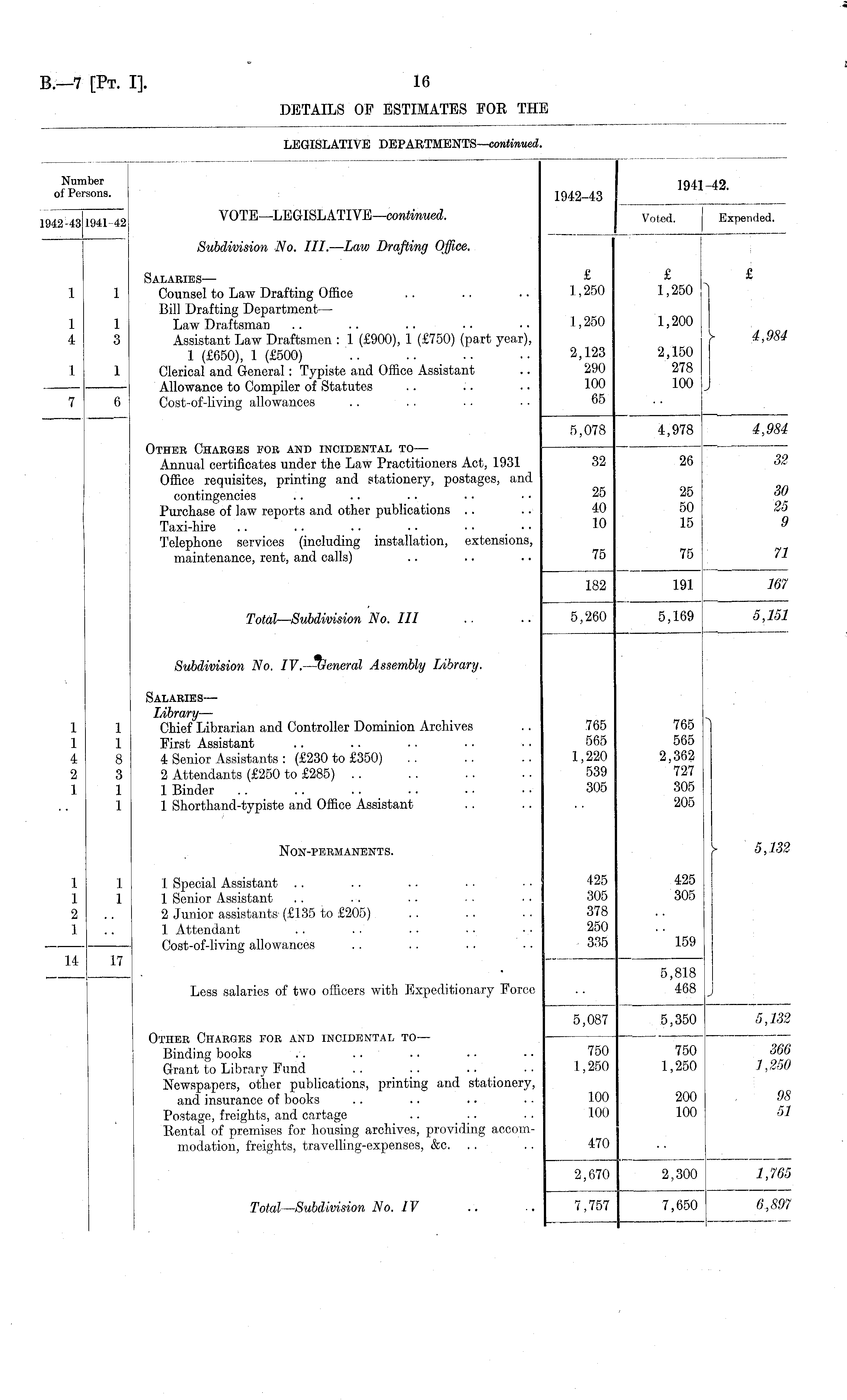 Number 1941-42. of Persons. 1942-43 1942-431941-42 VOTE—LEGISLATIVE— continued. Voted. Expended. Subdivision No. III. — Law Drafting Office. Salaries — £ & * 1 1 Counsel to Law Drafting Office .. .. .. 1,250 1,250 Bill Drafting Department — 1 1 Law Draftsman .. .. .. .. •• 1,250 1,200 4 3 Assistant Law Draftsmen: 1 (£900), 1 (£750) (part year), V 4,984 1 (£650), 1 (£500) .. .. .. •• 2,123 2,150 1 1 Clerical and General: Typiste and Office Assistant .. 290 278 Allowance to Compiler of Statutes .. .. ■ • 100 100 J 7 6 Cost-of-living allowances .. .. .. ■ • 65 5,078 4,978 4,984 Other Charges for and incidental to — Annual certificates under the Law Practitioners Act, 1931 32 26 32 Office requisites, printing and stationery, postages, and contingencies .. .. . ■ ■ • ■ • 25 25 30 Purchase of law reports and other publications .... 40 50 25 Taxi-hire 10 15 9 Telephone services (including installation, extensions, maintenance, rent, and calls) .. .. .. 75 75 71 182 191 167 Total—Subdivision No. Ill .. .. 5,260 5,169 5,151 Subdivision No. IV.—General Assembly Library. Salaries — Library — 1 1 Chief Librarian and Controller Dominion Archives .. 765 765 1 1 First Assistant .. .. .. • • ■ • 565 565 4 8 4 Senior Assistants: (£230 to £350) .. .. .. 1,220 2,362 2 3 2 Attendants (£250 to £285) .. .. .. .. 539 727 1 1 1 Binder 305 305 1 1 Shorthand-typiste and Office Assistant .. .. .. 205 NoN-PERMANENTS. 5,132 111 Special Assistant .. .. .. • • ■ • 425 425 111 Senior Assistant .. . . .. ■ . .. 305 305 2 2 Junior assistants (£135 to £205) .. .. .. 378 1 .. 1 Attendant .. . . .. • • ... 250 Cost-of-living allowances . . .. .. • • 335 159 14 17 . • 5,818 Less salaries of two officers with Expeditionary Force .. 468 J 5,087 5,350 5,132 Other Charges for and incidental to — Binding books .. .. .. •• ■• TOO 750 366 Grant to Library Fund .. 1,250 1,250 1,260 Newspapers, other publications, printing and stationery, and insurance of books .. .. .. • • 100 200 J8 Postage, freights, and cartage .. .. . • 100 100 51 Rental of premises for housing archives, providing accommodation, freights, travelling-expenses, &c. .. .. 470 2,670 2,300 1,765 Total—Subdivision No. IV .. .. 7,757 7,650 6,897