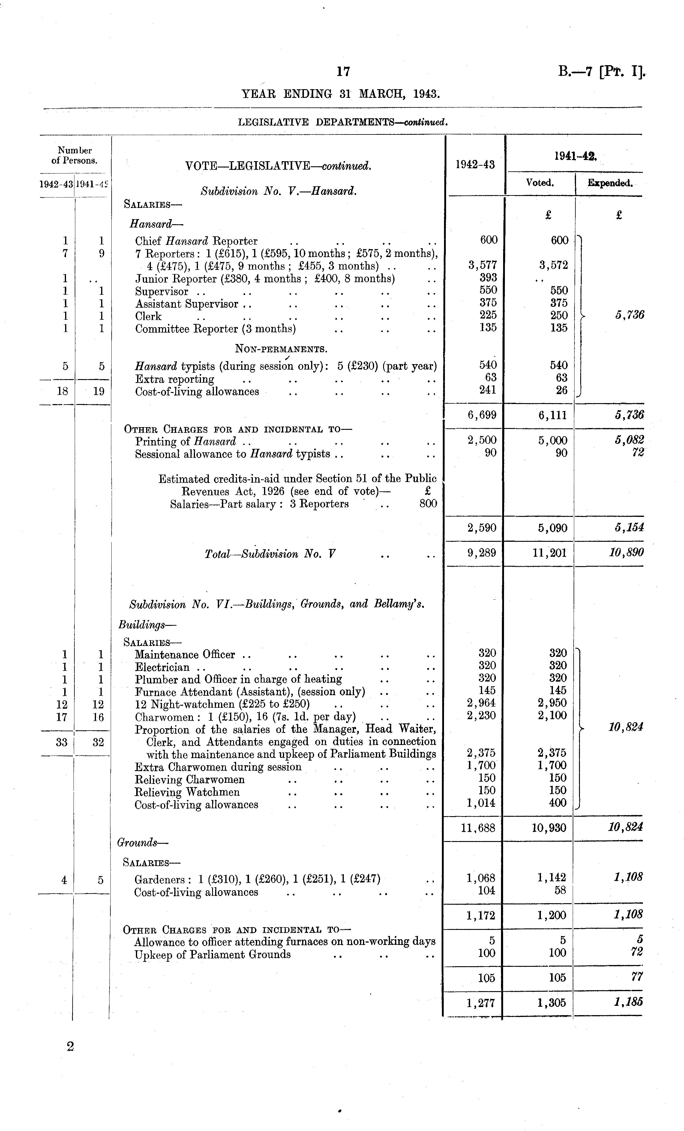 Number 1941-42 ofPer6Opa - VOTE—LBGISLATIVB-ooMiimiei. 1942-43 1942 43 1941 45 _ , ,. . , „ TT TJ , Voted. Expended. Subdivision No. V. — Hansard. I Salaries— £ £ Hansard — 1 1 Chief Hansard Reporter .. .. .. .. 600 600 7 9 7 Reporters : 1 (£615), 1 (£595,10 months; £575, 2 months), 4 (£475), 1 (£475, 9 months ; £455, 3 months) .. .. 3,577 3,572 1 .. Junior Reporter (£380, 4 months ; £400, 8 months) .. 393 1 1 Supervisor .. .. .. .. .. .. 550 550 1 1 Assistant Supervisor .. .. .. .. .. 375 375 1 1 Clerk .. 225 250 l> 5,736 1 Committee Reporter (3 months) .. .. .. 135 135 NON-PERMANENTS. 5 5 Hansard typists (during session only): 5 (£230) (part year) 540 540 Extra reporting .. .. .. .. .. 63 63 18 19 Cost-of-living allowances .. .. .. .. 241 26 I 6,699 6,111 5,736 Other Charges for and incidental to — Printing of Hansard 2,500 5,000 5,082 Sessional allowance to Hansard typists .. .. .. 90 90 72 Estimated credits-in-aid under Section 51 of the Public Revenues Act, 1926 (see end of vote) — £ Salaries —Part salary : 3 Reporters .. 800 2,590 5,090 5,154 Total—Subdivision No. V .. .. 9,289 11,201 10,890 Subdivision No. VI. — Buildings, Grounds, and Bellamy's. Buildings — Salaries — 1 1 Maintenance Officer .. .. .. .. .. 320 320 1 1 Electrician .. .. .. .. .. •• 320 320 1 1 Plumber and Officer in charge of heating .. .. 320 320 1 1 Furnace Attendant (Assistant), (session only) .. .. 145 145 12 12 12 Night-watchmen (£225 to £250) .. .. .. 2,964 2,950 17 16 Charwomen: 1 (£150), 16 (7s. Id. per day) .. .. 2,230 2,100 Proportion of the salaries of the Manager, Head Waiter, > 10,824 33 32 Clerk, and Attendants engaged on duties in connection with the maintenance and upkeep of Parliament Buildings 2,375 2,375 Extra Charwomen during session .. .. .. 1,700 1,700 Relieving Charwomen .. .. .. .. 150 150 Relieving Watchmen .. .. .. .. 150 150 Cost-of-living allowances .. .. .. .. 1,014 400 _ 11,688 10,930 10,824 Grounds — " Salaries — 4 5 Gardeners: 1 (£310), 1 (£260), 1 (£251), 1 (£247) .. 1,068 1,142 1,108 [ Cost-of-living allowances .. .. .. .. 104 58 1,172 1,200 1,108 Other Charges for and incidental to — Allowance to officer attending furnaces on non-working days 5 5 5 Upkeep of Parliament Grounds .. .. .. 100 100 72 105 105 77 1,277 1,305 1,185