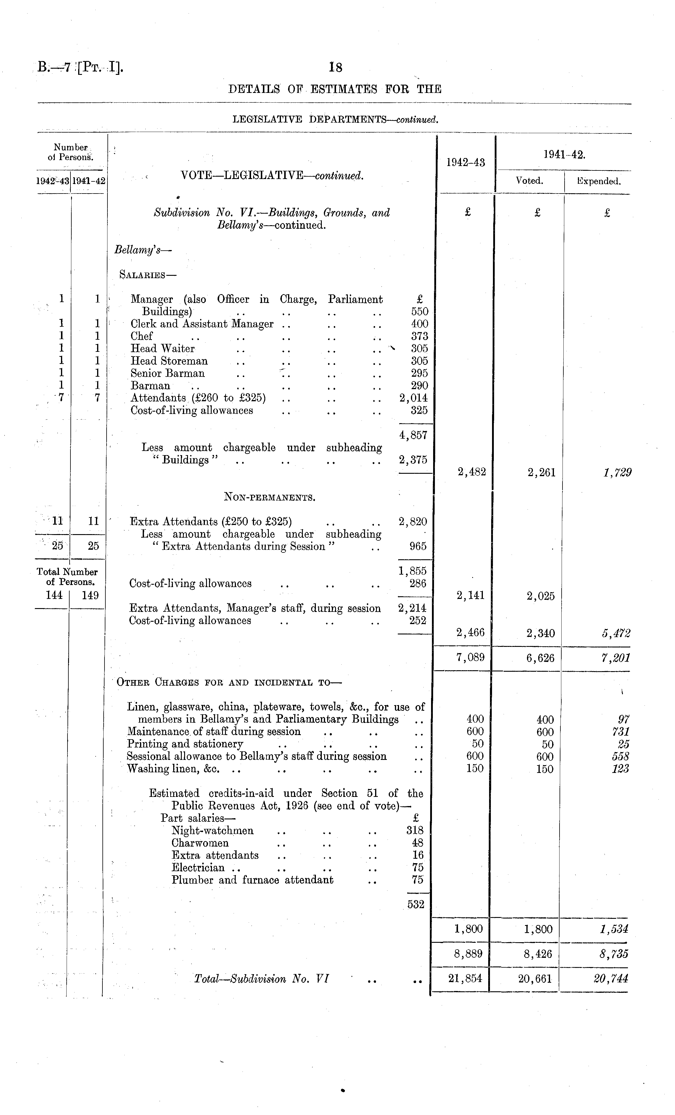 < N p mber : 1941 42 oi Pers0119 - 1942-43 ,„.„ .,„ .„.. , 0 < VOTE—LEGISLATIVE— continued. i,- "77 1942-43 1941-42 Voted. Expended. * Subdivision No. VI. — Buildings, Grounds, and £ £ £ Bellamy's —continued. Bellamy's— Salaries— 1 1 Manager (also Officer in Charge, Parliament £ Buildings) .. .. .. .. 550 1 1 Clerk and Assistant Manager .. .. .. 400 1 1 Chef .. 373 1 1 Head Waiter .. .. .. .. 305 1 1 Head Storeman .. .. .. .. 305 1 1 Senior Barman .. ".. .. .. 295 1 1 Barman .. .. .. .. .. 290 7 7 Attendants (£260 to £325) .. .. .. 2,014 Cost-of-living allowances .. - .. .. 325 4,857 Less amount chargeable under subheading "Buildings" .. .. .. ..2,375 2,482 2,261 1,729 NoN-PERMANENTS. 11 11 Extra Attendants (£250 to £325) .. .. 2,820 — Less amount chargeable under subheading 25 25 " Extra Attendants during Session" .. 965 Total Number 1,855 of Persons. Cost-of-living allowances .. .. .. 286 144 149 2,141 2,025 Extra Attendants, Manager's staff, during session 2,214 Cost-of-living allowances .. .. . . 252 2,466 2,340 5,472 7,089 6,626 7,201 Other Charges for and incidental to — i Linen, glassware, china, plateware, towels, &c, for use of members in Bellamy's and Parliamentary Buildings .. 400 400 97 Maintenance of staff during session .. .. .. 600 600 731 Printing and stationery .. .. .. .. 50 50 25 Sessional allowance to Bellamy's staff during session .. 600 600 558 Washing linen, &c. .. .. .. .. .. 150 150 123 Estimated credits-in-aid under Section 51 of the Public Revenues Act, 1926 (see end of vote) — Part salaries— £ Night-watchmen .. .. .. 318 Charwomen .. .. .. 48 Extra attendants .. .. .. 16 Electrician .. .. .. .. 75 Plumber and furnace attendant .. 75 532 1,800 1,800 1,534 8,889 8,426 8,735 Total—Subdivision No. VI .. .. 21,854 20,661 20,744