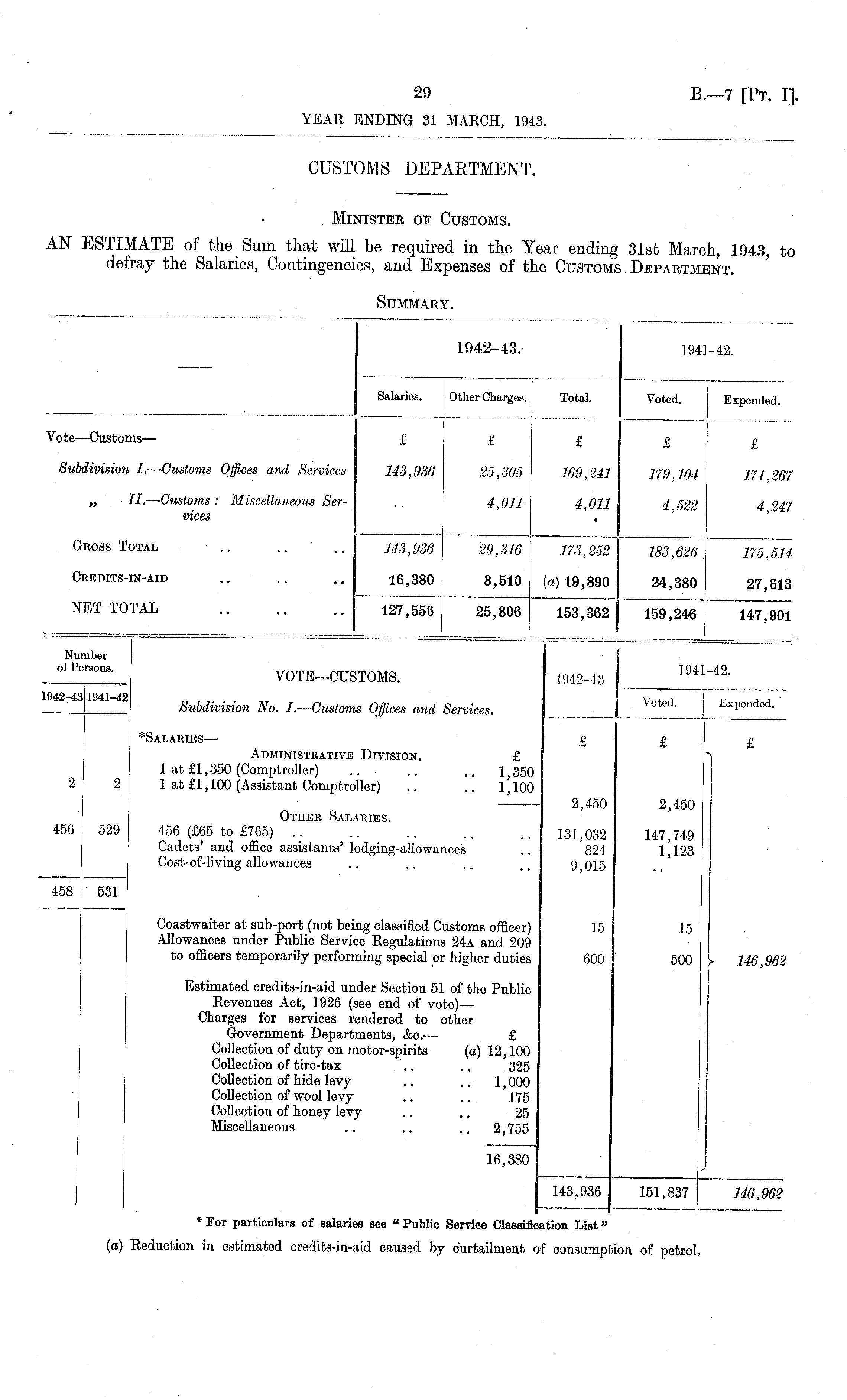 Minister of Customs. AN ESTIMATE of the Sum that will be required in the Year ending 31st March, 1943, to defray the Salaries, Contingencies, and Expenses of the Customs Department. Summary.