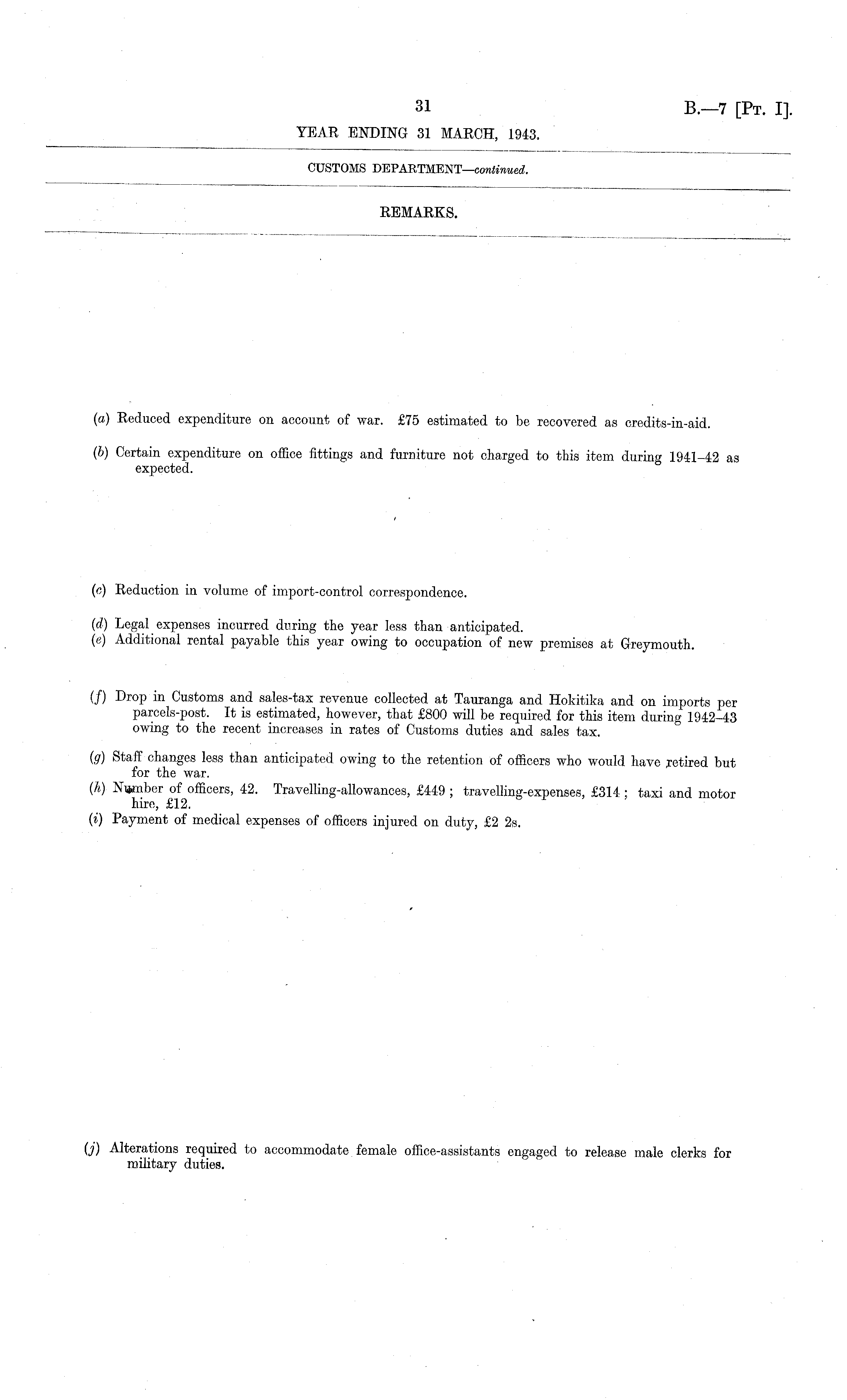 REMARKS. (a) Reduced expenditure on account of war. £75 estimated to be recovered as credits-in-aid. (b) Certain expenditure on office fittings and furniture not charged to this item during 1941-42 as expected. (o) Reduction in volume of import-control correspondence. (d) Legal expenses incurred during the year less than anticipated. (e) Additional rental payable this year owing to occupation of new premises at Greymouth. (/) Drop in Customs and sales-tax revenue collected at Tauranga and Hokitika and on imports per parcels-post. It is estimated, however, that £800 will be required for this item during 1942-43 owing to the recent increases in rates of Customs duties and sales tax. (g) Staff changes less than anticipated owing to the retention of officers who would have retired but for the war. (h) Number of officers, 42. Travelling-allowances, £449 ; travelling-expenses, £314 ; taxi and motor hire, £12. (i) Payment of medical expenses of officers injured on duty, £2 2s. (j) Alterations required to accommodate female office-assistants engaged to release male clerks for military duties.