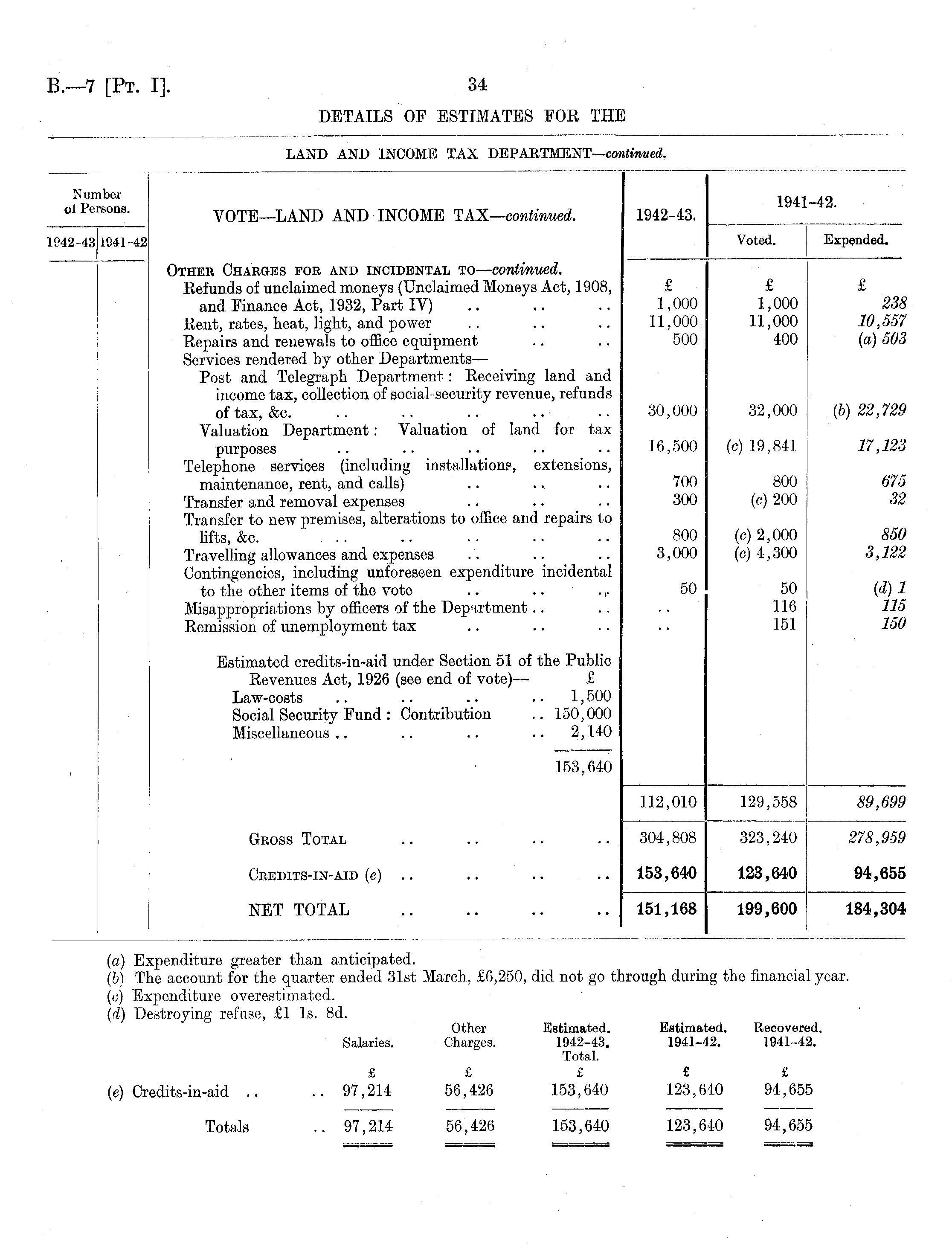 (a) Expenditure greater than anticipated. (b) The account for the quarter ended 31st March, £6,250, did not go through during the financial year. (o) Expenditure overestimated. (d) Destroying refuse, £1 Is, Bd. Other Estimated. Estimated. Recovered. Salaries. Charges. 1942-43. 1941-42. 1941-42. Total. £ £ £ £ £ (e) Credits-in-aid .. .. 97,214 56,426 153,640 123,640 94,655 Totals .. 97,214 56,426 153,640 123,640 94,655