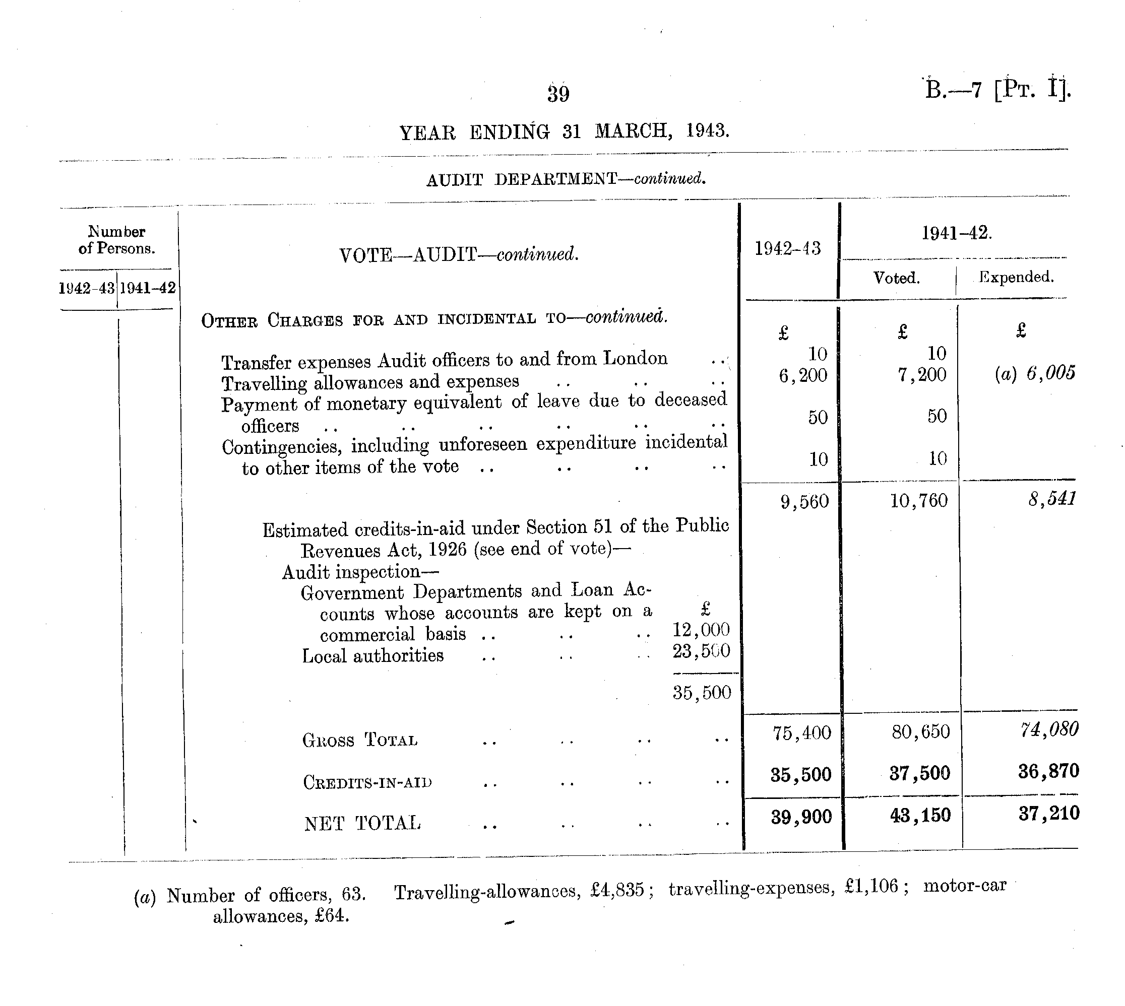 Number 1941-42. of Persons. VOTE—AUDIT— continued. 1942-43 _ _ 1942-4s|lG41-42 Voted. [ .Expended. Othbe Charges foe and incidental to — continued. X * ** Transfer expenses Audit officers to and from London .. 10 10 Travelling allowances and expenses 6 = 200 7,200 (a) 6,005 Payment of monetary equivalent of leave due to deceased officers _.._.. 50 60 Contingencies, including unforeseen expenditure incidental to other items of the vote .. .. .. ■ ■ 10 1(l 9,560 10,760 8,541 Estimated credits-in-aid under Section 51 of the Public Eevenues Act, 1926 (see end of vote) — Audit inspection — Government Departments and Loan Accounts whose accounts are kept on a £ commercial basis .. .. ■• 12,000 Local authorities .. ■■ ■■ 23,500 35,500 Gboss Total .. 75,400 80,650 74,080 OEHDiTS-m-AiD _^ 5 !°__ 36 ! 8? - NETTOTAI 3 9' 900 43 ' 150 37 ' 210 I