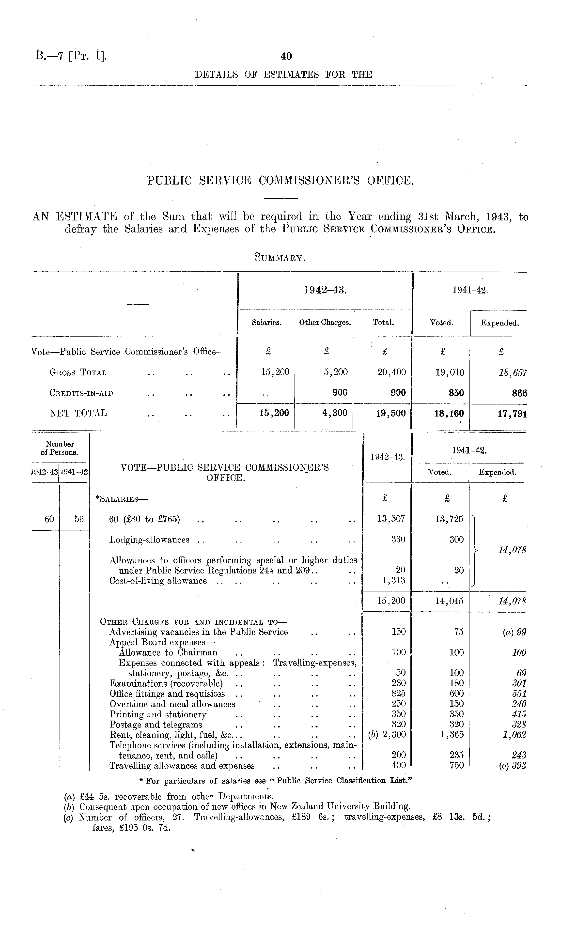 (a) £44 ss. recoverable from other Departments. (b) Consequent upon occupation of new offices in New Zealand University Building. (c) Number of officers, 27. Travelling-allowances, £189 65.; travelling-expenses, £8 13s. 5d.; fares, £195 Os. 7d.