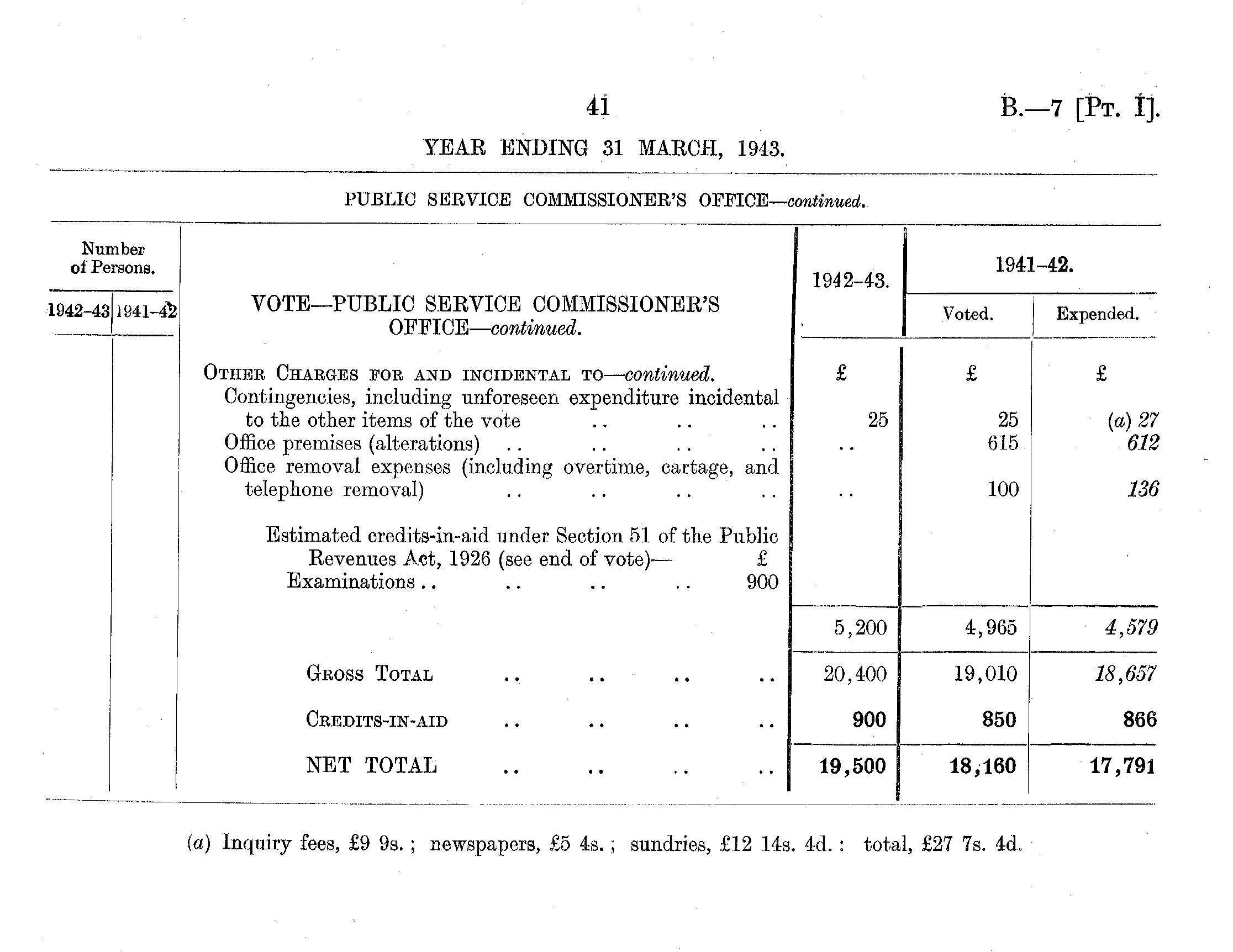 Number olPerso " s - 1942-43 1941 - 42 - 1942-431M1-A VOTE-PUBLIC SERVICE COMMISSIONER'S Voted E ded OFFICE— continued. \ . Other Charges for and incidental to — continued. £ £ £ Contingencies, including unforeseen expenditure incidental to the other items of the vote .. .. .. 25 25 (a) 27 Office premises (alterations) .. .. . . . . .. 615 612 Office removal expenses (including overtime, cartage, and telephone removal) . . .. .. . . . . 100 136 Estimated credits-in-aid under Section 51 of the Public Revenues Act, 1926 (see end of vote) — £ Examinations.. .. .. .. 900 5,200 4,965 4,579 Gross Total .. .. .. .. 20,400 19,010 18,657 Credits-in-aid .. .. .. .. 900 850 866 NET TOTAL 19,500 18,160 17,791