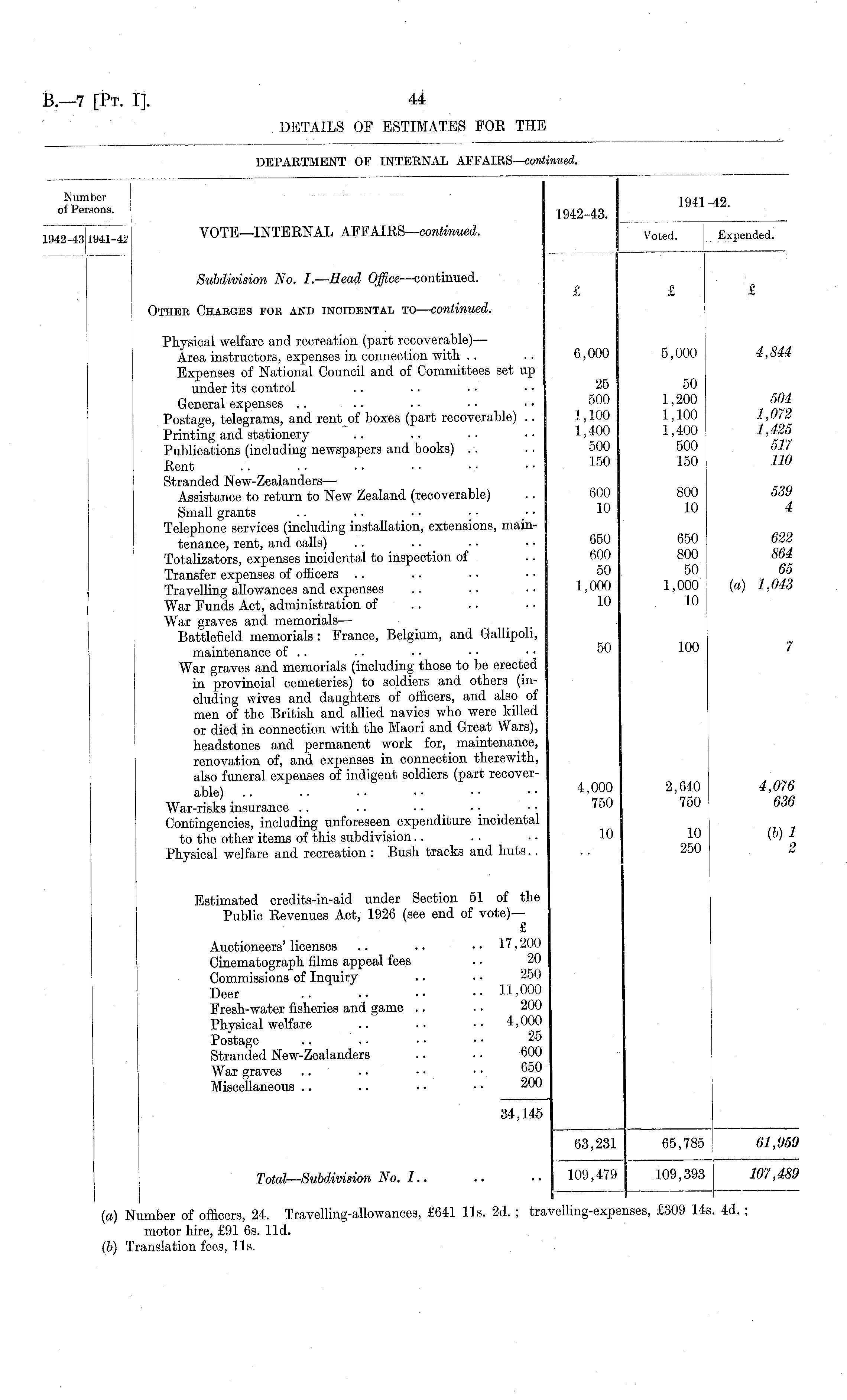 Number 1941-42. 01 Persons. 1942-43. VOTE-INTERNAL AFFAJBS-cofOmued. > Vo ted. I Upended.' Subdivision No. I. — Head Office —continued. £ £ £ Other Charges for and incidental to — continued. Physical welfare and recreation (part recoverable) — Area instructors, expenses in connection witli .. .. 6,000 5,000 4,844 Expenses of National Council and of Committees set up under its control .. .. • • • • 25 50 General expenses ■• 50 ° 1-200 5 <f 4 Postage, telegrams, and rent of boxes (part recoverable) .. 1,100 1,100 I'/Ji Printing and stationery .. .. ■• •• M 00 M00 1,425 Publications (including newspapers and books) .. .. 500 500 517 Rent 15Q 150 U0 Stranded New-Zealanders — Assistance to return to New Zealand (recoverable) .. 600 800 53J Small grants .. ... ... ... ,-• 10 10 4 Telephone services (including installation, extensions, maintenance, rent, and calls) .. .. ... • • 650 650 622 Totalizators, expenses incidental to inspection of .. 600 800 864 Transfer expenses of officers .. .. .. • • 50 50 "? Travelling allowances and expenses .. ■■ •• 1,000 1,000 (a) 1,046 War Funds Act, administration of .. • • 10 10 War graves and memorials — Battlefield memorials: France, Belgium, and Gallipoli, maintenance of .. .. • • • • • • °0 100 War graves and memorials (including those to be erected in provincial cemeteries) to soldiers and others (including wives and daughters of officers, and also of men of the British and allied navies who were killed or died in connection with the Maori and Great Wars), headstones and permanent work for, maintenance, renovation of, and expenses in connection therewith, also funeral expenses of indigent soldiers (part recoverable) .. .. .. 4,000 2,640 4,076 War-risks insurance .. .. .. - • •■ 75 ° 7B0 636 Contingencies, including unforeseen expenditure incidental to the other items of this subdivision.. .. ■. 10 10 (b)l Physical welfare and recreation : Bush tracks and huts.... 250 2 Estimated credits-in-aid under Section 51 of the Public Revenues Act, 1926 (see end of vote)— £ Auctioneers'licenses .. .. •• 17,200 Cinematograph films appeal fees .. 20 Commissions of Inquiry .. • • 250 Deer 11.000 Fresh-water fisheries and game .. .. 200 Physical welfare .. . • • • 4,000 Postage .. . • • ■ • • 2o Stranded New-Zealanders .. • • 600 War graves .. .. • • • • 6o0 Miscellaneous .. .. •. • • 200 34,145 63,231 65,785 61,959 No. 1 109,479 109,393 107,489
