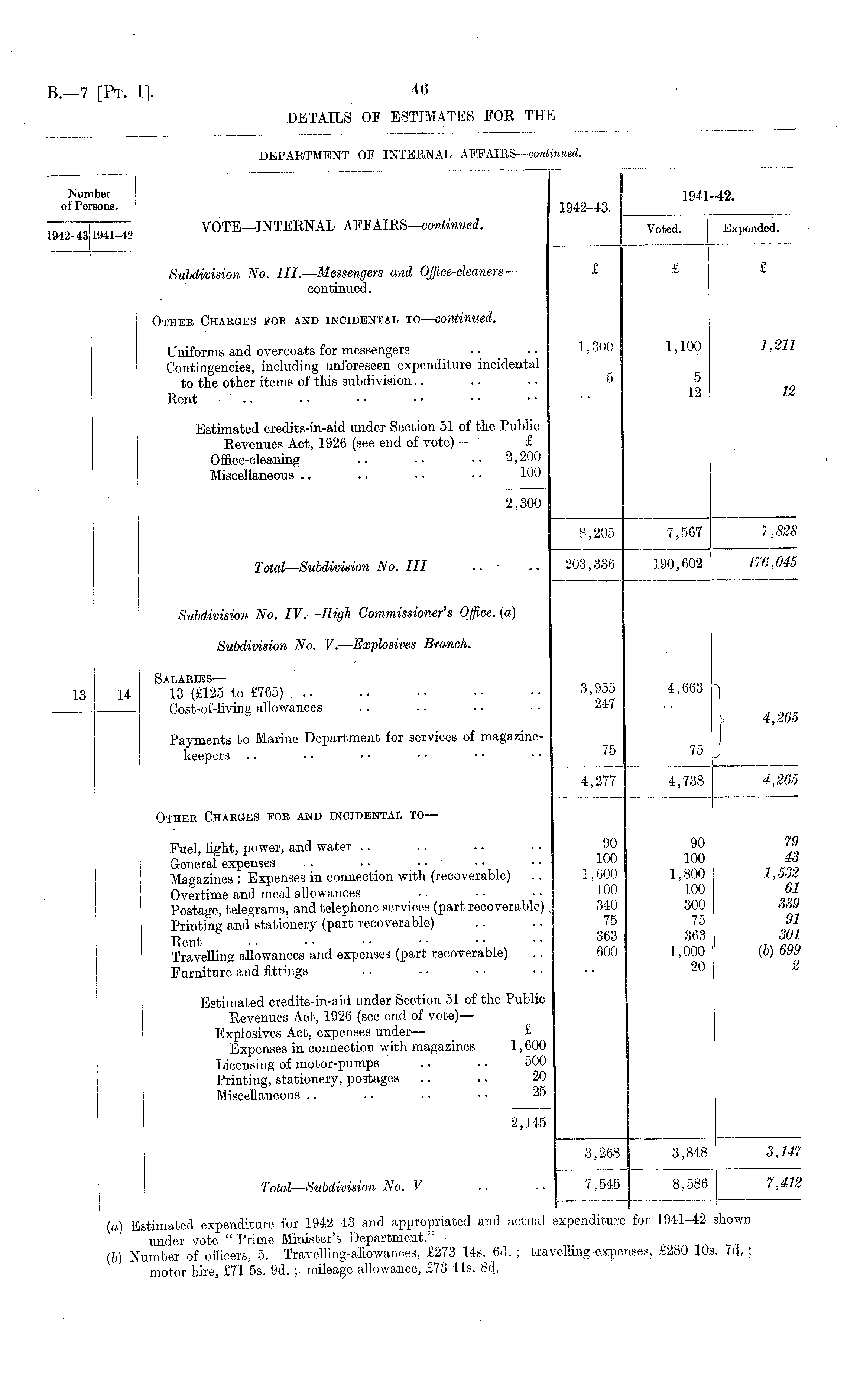 Number 19-11-42. otPersons. 1942-43. ~ „J iniM ,„ VOTE—INTERNAL AFFAIRS— continued. Voted. Expended. 1942-43 1941-42 r Subdivision No. III. — Messengers and Office-cleaners — £ £ £ continued. Other Charges foe and incidental to — continued. Uniforms and overcoats for messengers .. . ■ 1,300 1,100 1,211 Contingencies, including unforeseen expenditure incidental to the other items of this subdivision...... 5 5 Rent 12 U Estimated credits-in-aid under Section 51 of the Public Revenues Act, 1926 (see end of vote)— £ Office-cleaning .. • • • • 2,200 Miscellaneous .. .. .. • • 100 2,300 8,205 7,567 7,828 Total-Subdivision No. Ill .. • .. 203,336 190,602 176,045 Subdivision No. IV.—High Commissioner's Office, (a) Subdivision No. V. — Explosives Branch. 13 14 ' A 13 R (£125 to £765) 3,955 4,663 -| , Cost-of-living allowances .. .. .. ■ ■ 247 . . y 4,265 Payments to Marine Department for services of magazinekeepers .. • • • • ■ • • • • • '° '"J 4.277 4,738 4,265 Other Charges for and incidental to— Fuel, light, power, and water 90 90 79 General expenses .. .. •• ■• ■• 100 100 it6 Magazines: Expenses in connection with (recoverable) .. 1,600 1,800 1,562 Overtime and meal allowances .. .. ■ • 100 100 61 Postage, telegrams, and telephone services (part recoverable) , 340 300 66J Printing and stationery (part recoverable) .. .. 75 75 91 Rent ■ ■ ■ • ■ • • • 363 363 601 Travelling allowances and expenses (part recoverable) .. 600 1,000 (b) 699 Furniture and fittings .. ■ • • • • • • • 20 * Estimated credits-in-aid under Section 51 of the Public Revenues Act, 1926 (see end of vote) — Explosives Act, expenses under — £ Expenses in connection with magazines 1,600 Licensing of motor-pumps .. . • 500 Printing, stationery, postages .. .. 20 Miscellaneous .. .. • • • • 25 2,145 3,268 3,848 6,147 Total—Subdivision No. V .. .. 7,545 8,586 7,412