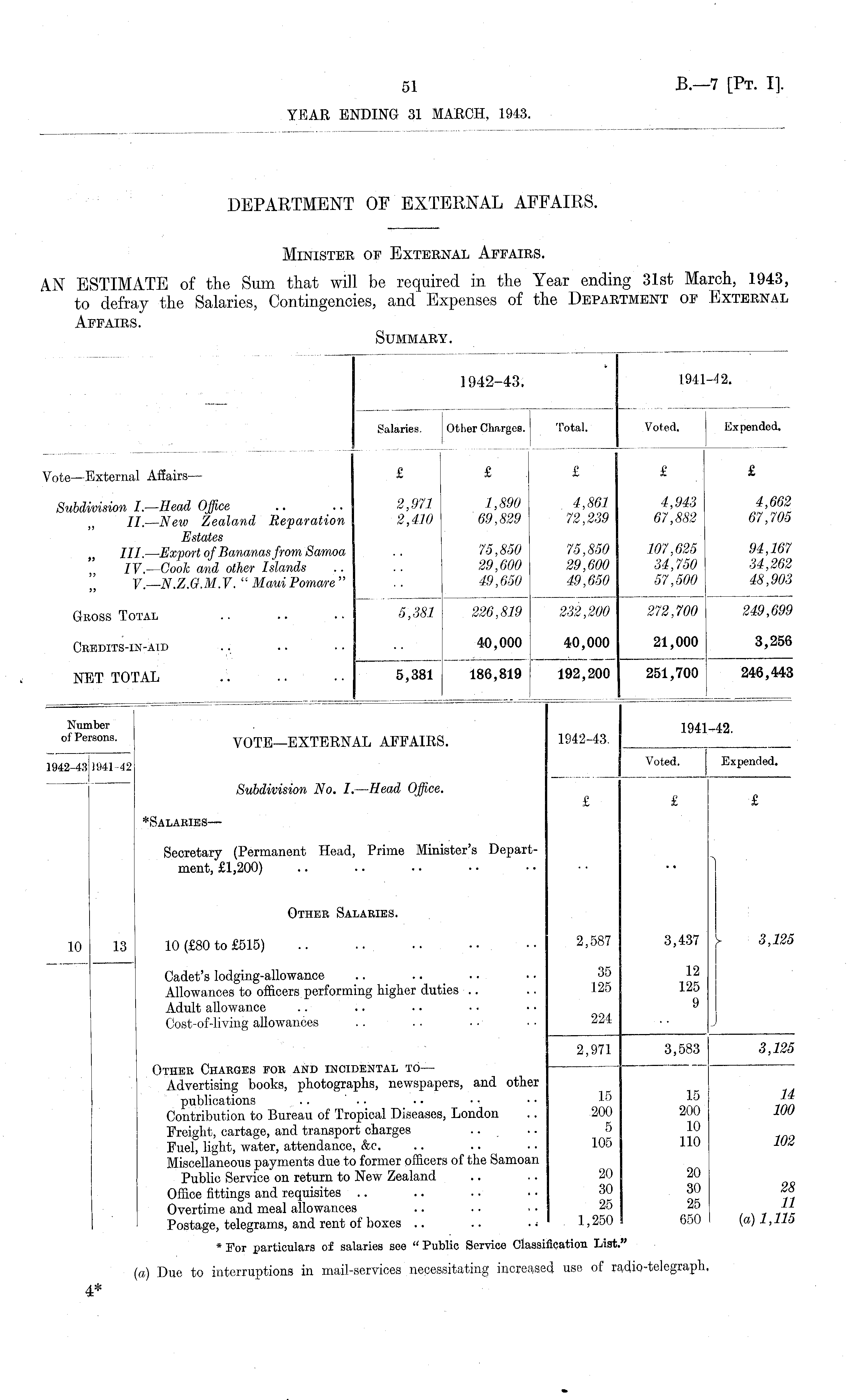 1942-43. 1941-42. Salaries. Other Charges. Total. Voted. Expended. _ Vote—External ASairs — £ £ £ £ £ Subdivision I.-Head Office .. .. 2,971 1,890 4,861 4,943 4,662 II.-New Zealand Reparation 2,410 69,829 72,239 67,882 67,705 Estates HI —Export of Bananas from Samoa .. 75,850 75,850 107,625 94,167 IV.-Cooh and other Islands .. .. 29,600 29,600 34,750 34,262 V.-N.Z.G.M.V."MauiPomare" .. 49,650 49,650 57,500 48,903 Gross Total 5,381 226,819 232,200 272,700 249,699 Credits-in-aid ... 40,000 40,000 21,000 3,256 NET TOTAL 5,381 186,819 192,200 251,700 246,443 Number 1941-42 of Persons. I VOTE—EXTERNAL AFFAIRS. 1942-43. ' 1942-431941-42 Voted - Expended. Subdivision No. I. — Head Office. £ £ £ *Salaries — Secretary (Permanent Head, Prime Minister's Department, £1,200) Other Salaries. 10 13 10 (£80 to £515) .. ... 2,587 3,437 I 3,125 Cadet's lodging-allowance .. .. .. • • 35 12 Allowances to officers performing higher duties .. .. 125 125 Adult allowance .. .. • • • • • • c " Cost-of-living allowances .. .. ■ ■ • • 224 2,971 3,583 3,125 Other Charges for and incidental to— Advertising books, photographs, newspapers, and other publications .. ' .. .. • ■ • • I 5 J-& ** Contribution to Bureau of Tropical Diseases, London .. 200 200 100 Freight, cartage, and transport charges .... 5 10 Fuel, light, water, attendance, &c. .. .. .. 105 110 lOi Miscellaneous payments due to former officers of the Samoan Public Service on return to New Zealand .... 20 20 Office fittings and requisites .. .. .. • • 30 30 28 Overtime and meal allowances .. .. ■ • 25 25 11 Postage, telegrams, and rent of boxes .. .. ■• 1,250 650 (a)l,llo * For particulars of salaries see " Public Service Classification List."