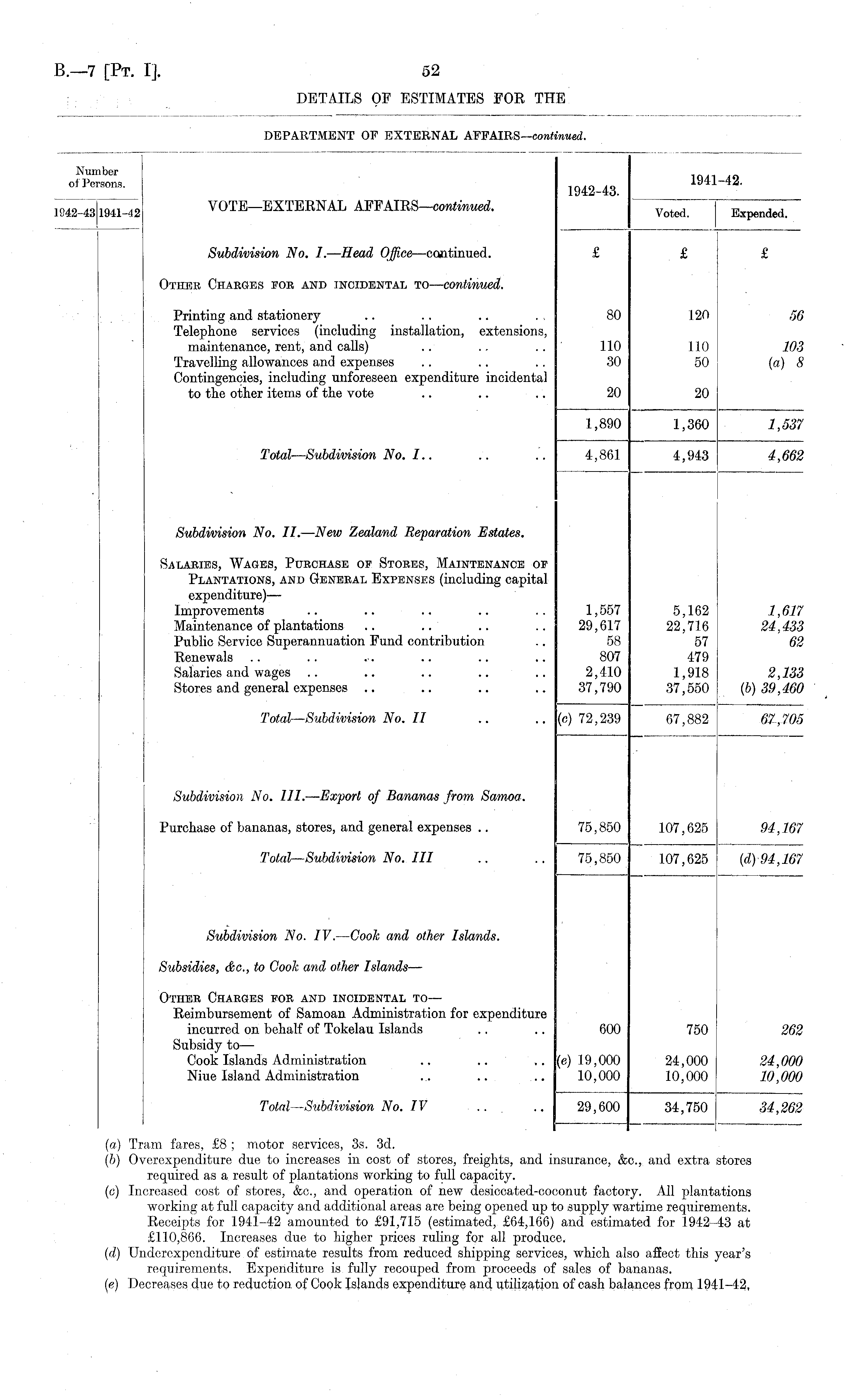 (a) Tram fares, £8 ; motor services, 3s. 3d. (b) Overexpenditure due to increases in cost of stores, freights, and insurance, &c, and extra stores required as a result of plantations working to full capacity. (c) Increased cost of stores, &c, and operation of new desiccated-coconut factory. All plantations working at full capacity and additional areas are being opened up to supply wartime requirements. Receipts for 1941-42 amounted to £91,715 (estimated, £64,166) and estimated for 1942-43 at £110,866. Increases due to higher prices ruling for all produce. (d) Undorcxpenditure of estimate results from reduced shipping services, which also affect this year's requirements. Expenditure is fully recouped from proceeds of sales of bananas. (e) Decreases due to reduction of Cook Islands expenditure and utilisation of cash balances from 1941-42,